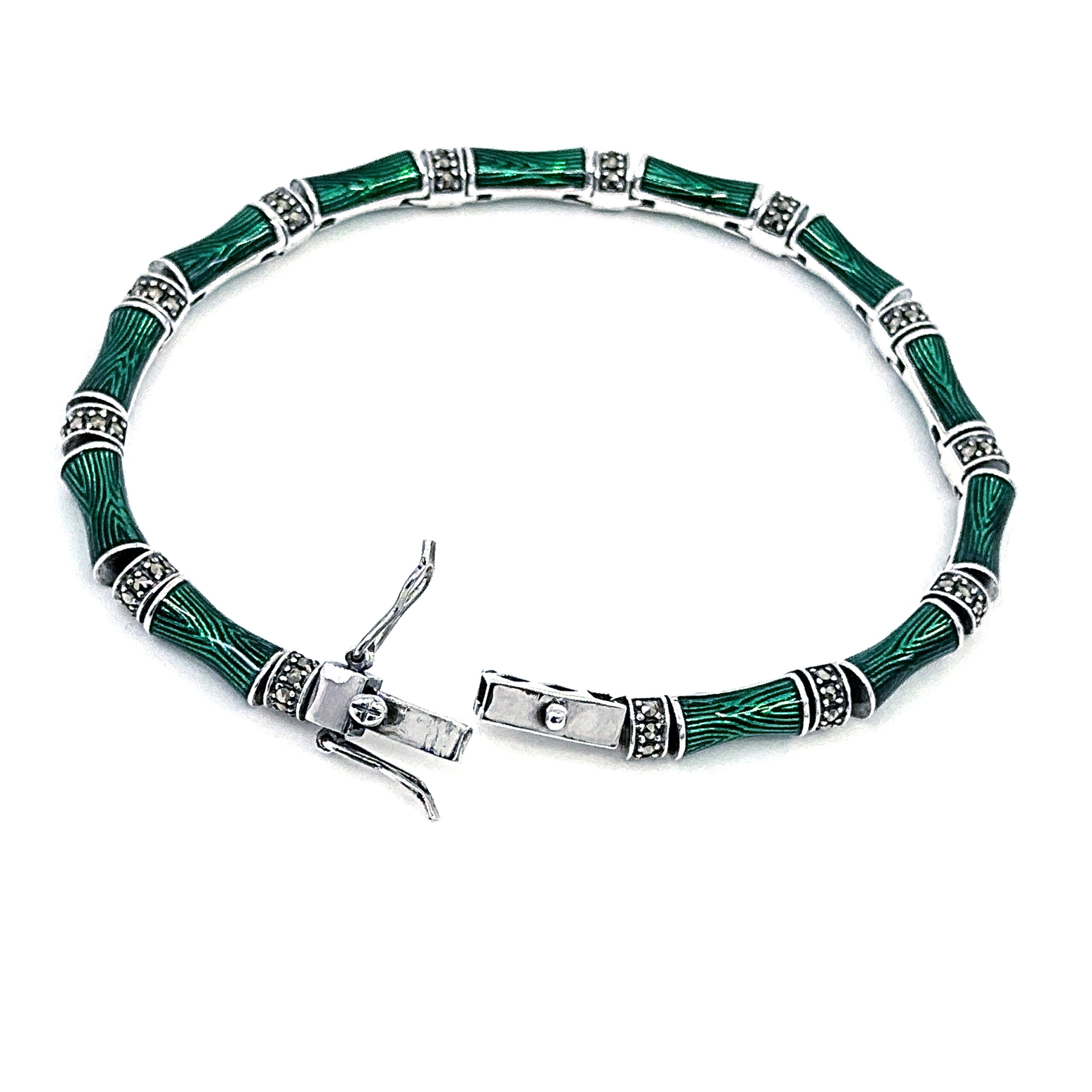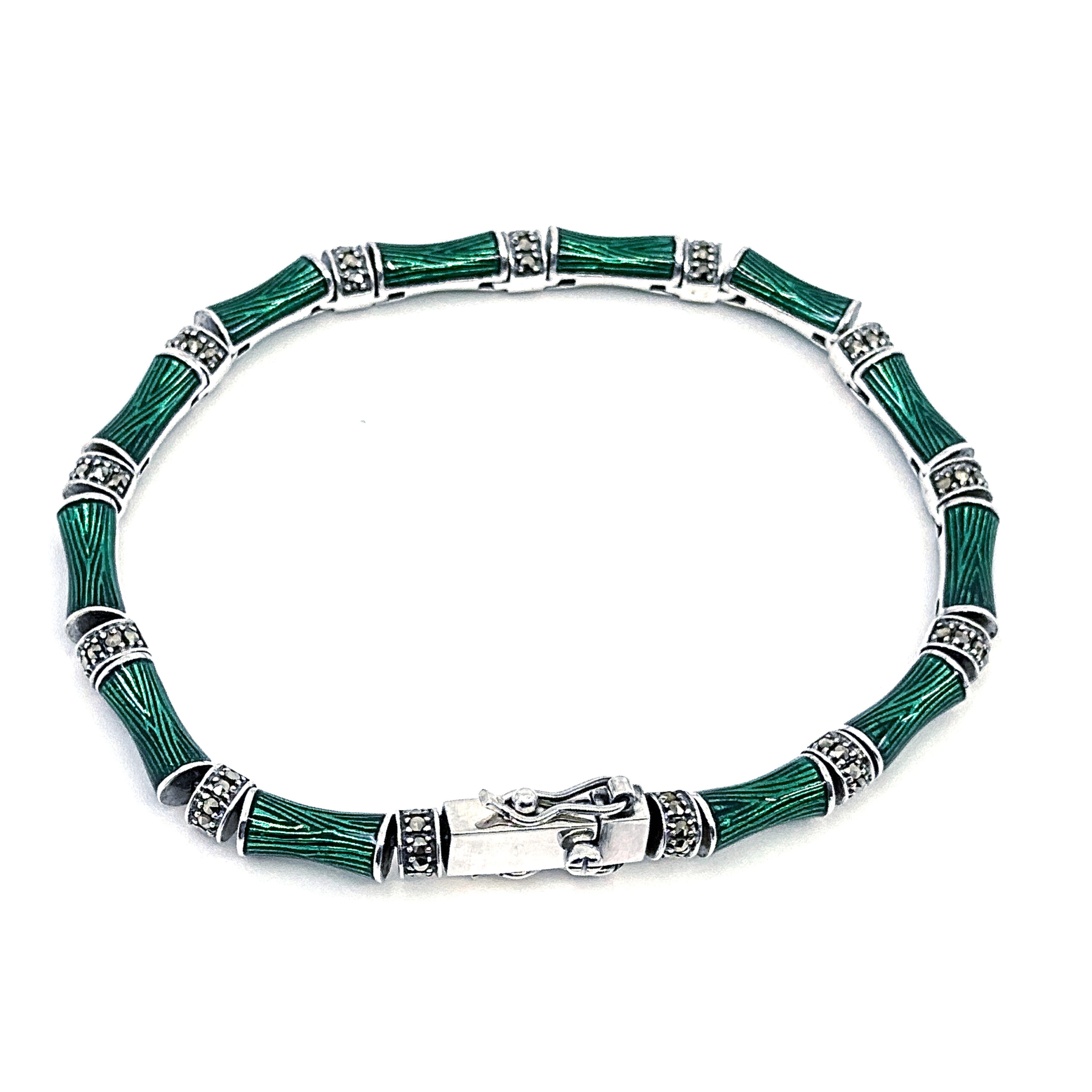 Inspired by the natural form of bamboo, this bracelet presents a structured yet organic design, highlighted by rich green enamel and the subtle brilliance of marcasite. The segmented form reflects the rhythm of bamboo stems, creating a balanced and distinctive aesthetic suitable for both day and evening wear.