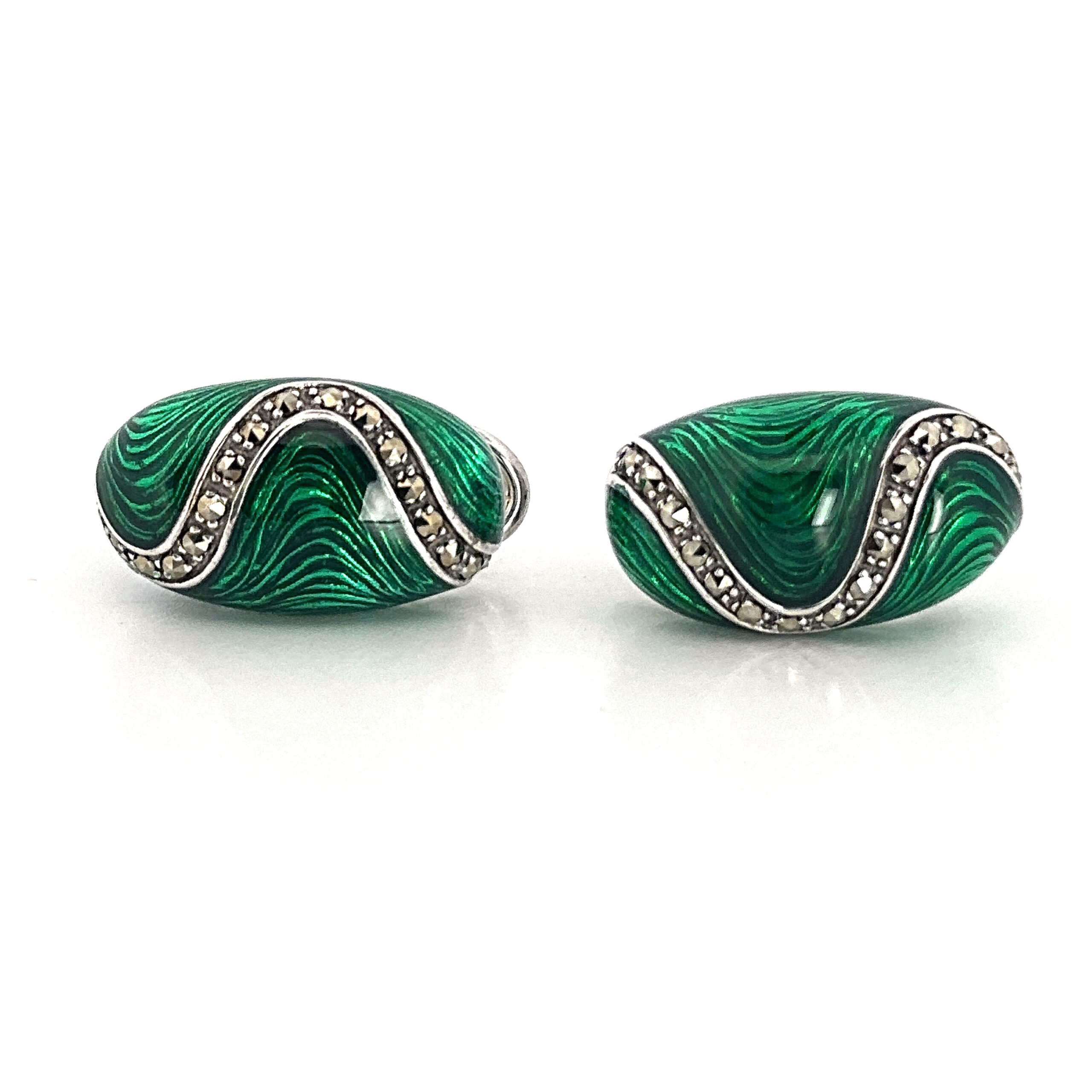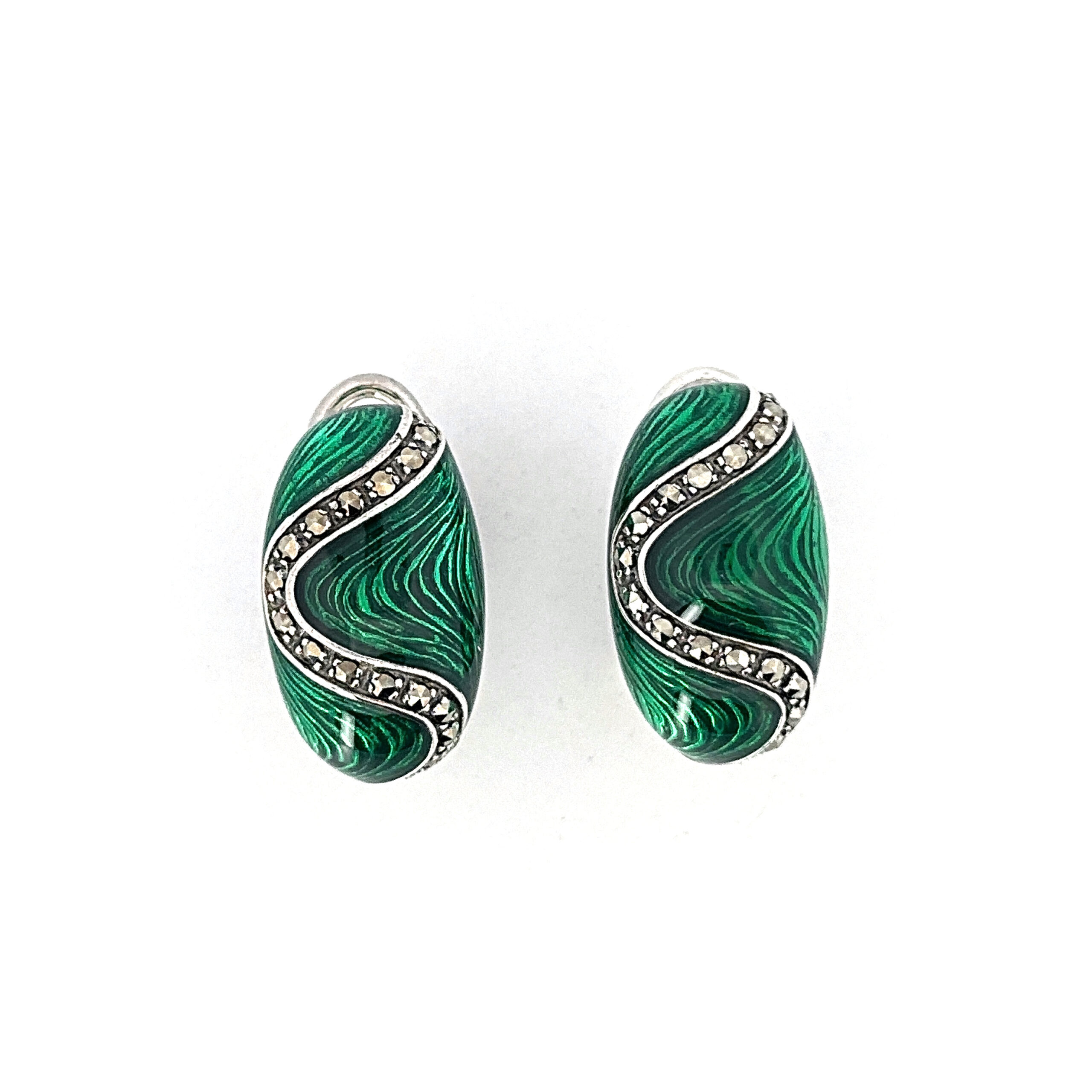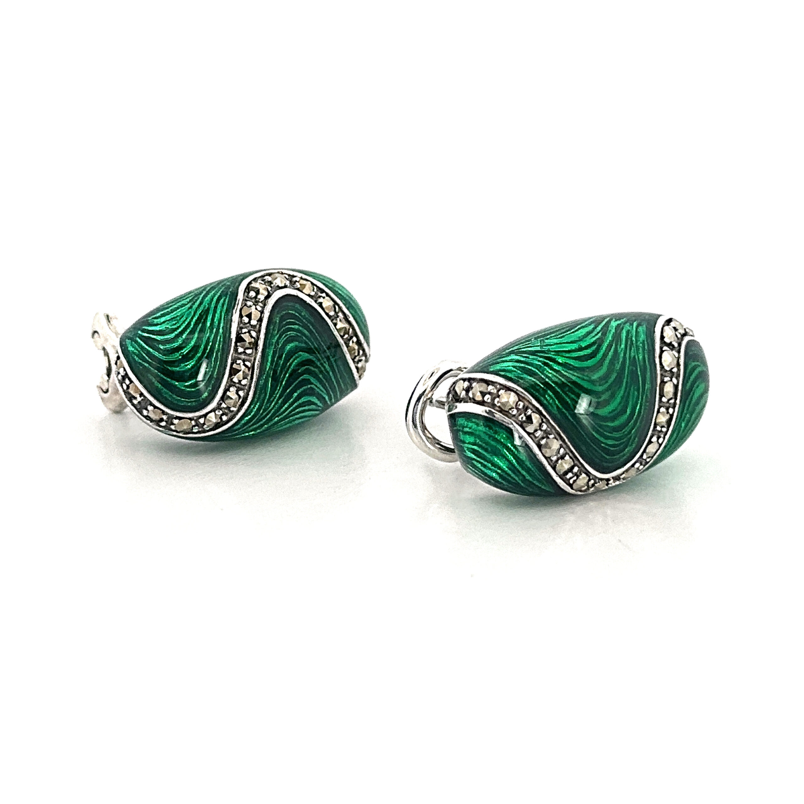 Green enamel introduces a vivid contrast across the surface, while marcasite detailing adds texture and depth. The drop form allows for subtle movement, enhancing the composition while maintaining a refined and composed appearance.