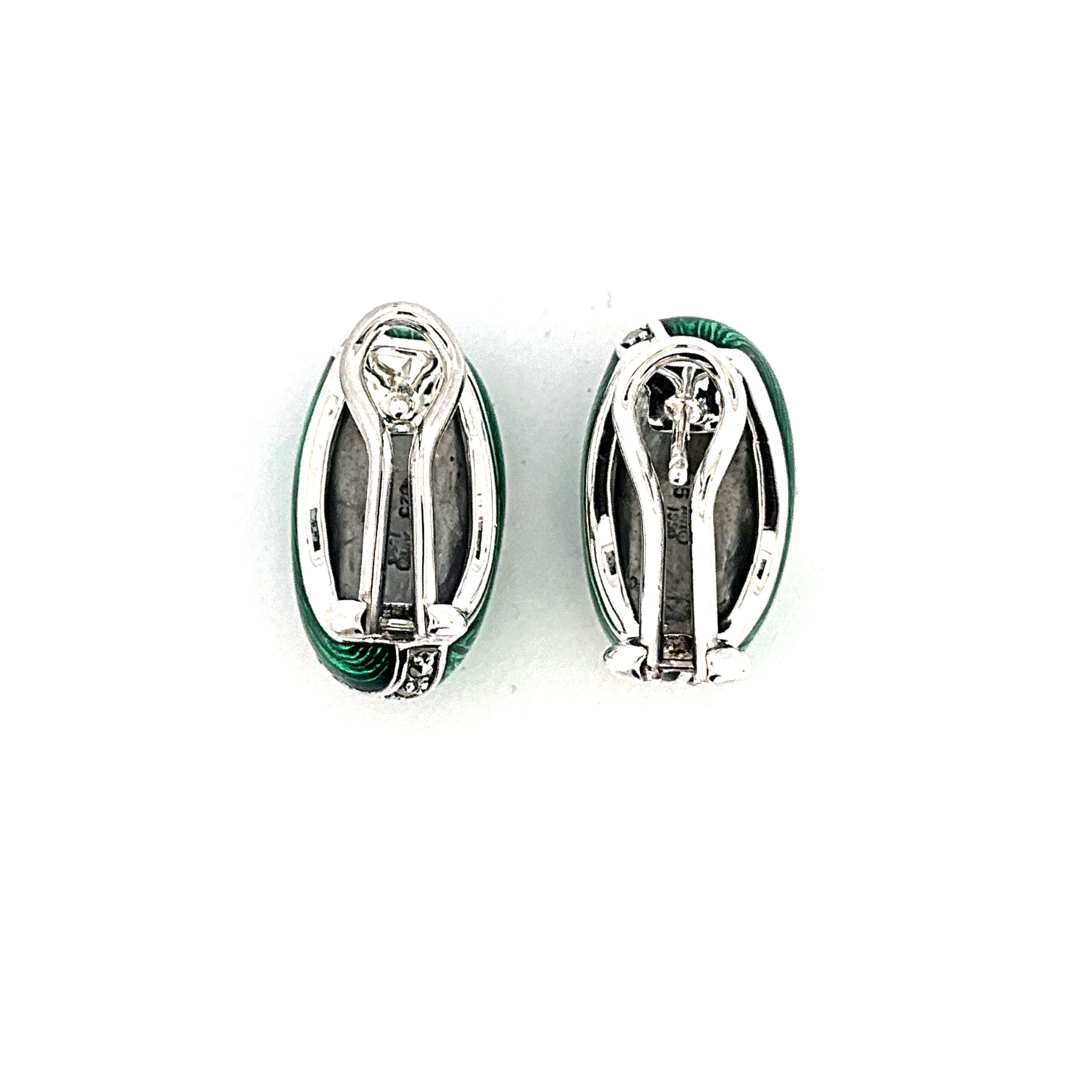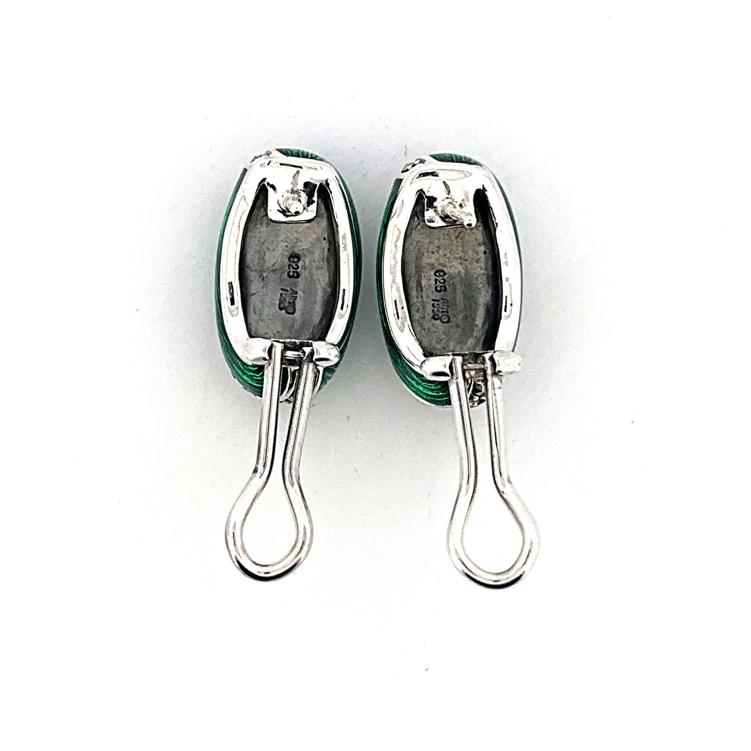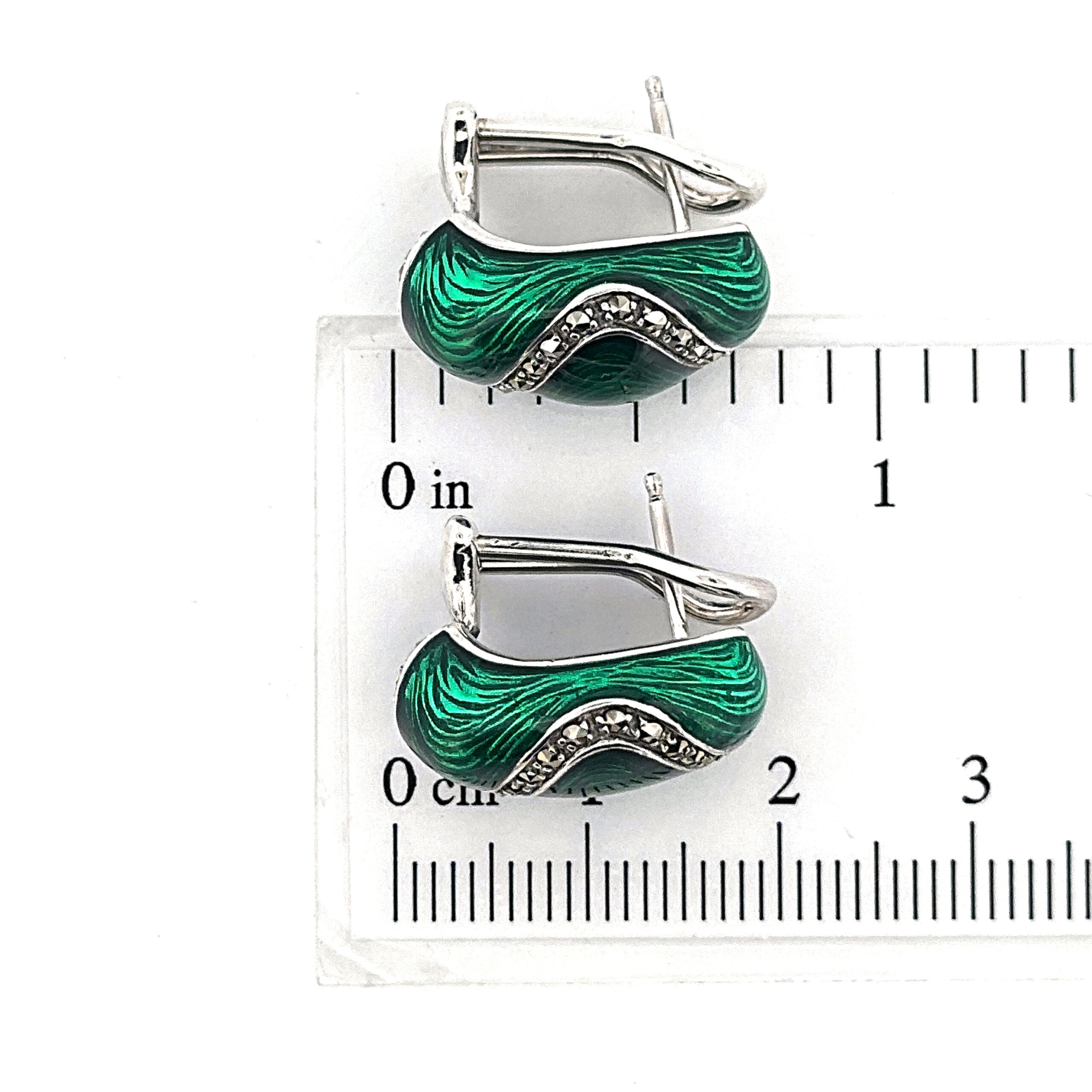 Green enamel introduces a vivid contrast across the surface, while marcasite detailing adds texture and depth. The drop form allows for subtle movement, enhancing the composition while maintaining a refined and composed appearance.
