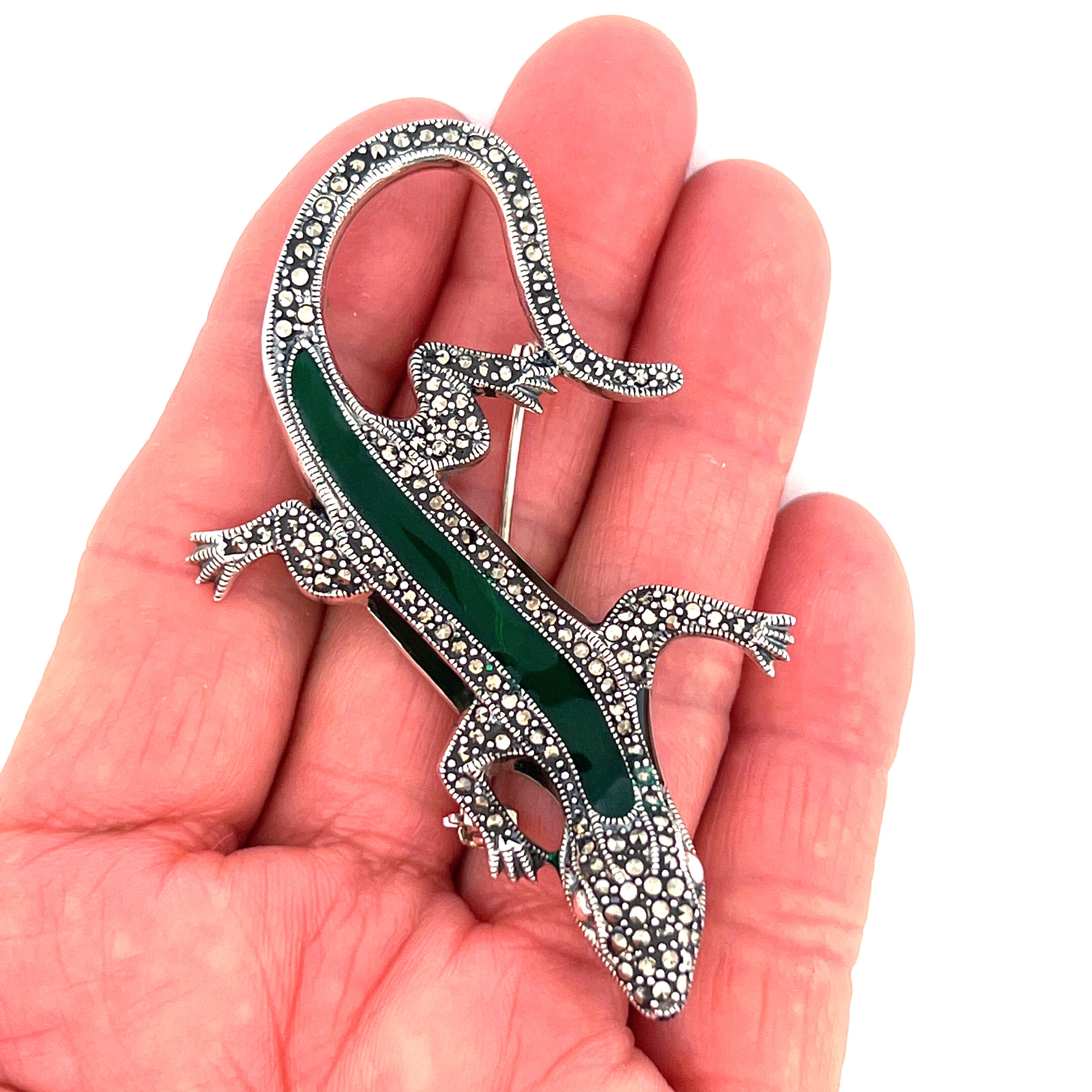 This gecko pin brooch features a striking reptile form decorated with green enamel and set with shimmering marcasite stones. The curved body and outstretched limbs create a dynamic silhouette, while the textured surface of the marcasite adds depth and subtle sparkle.