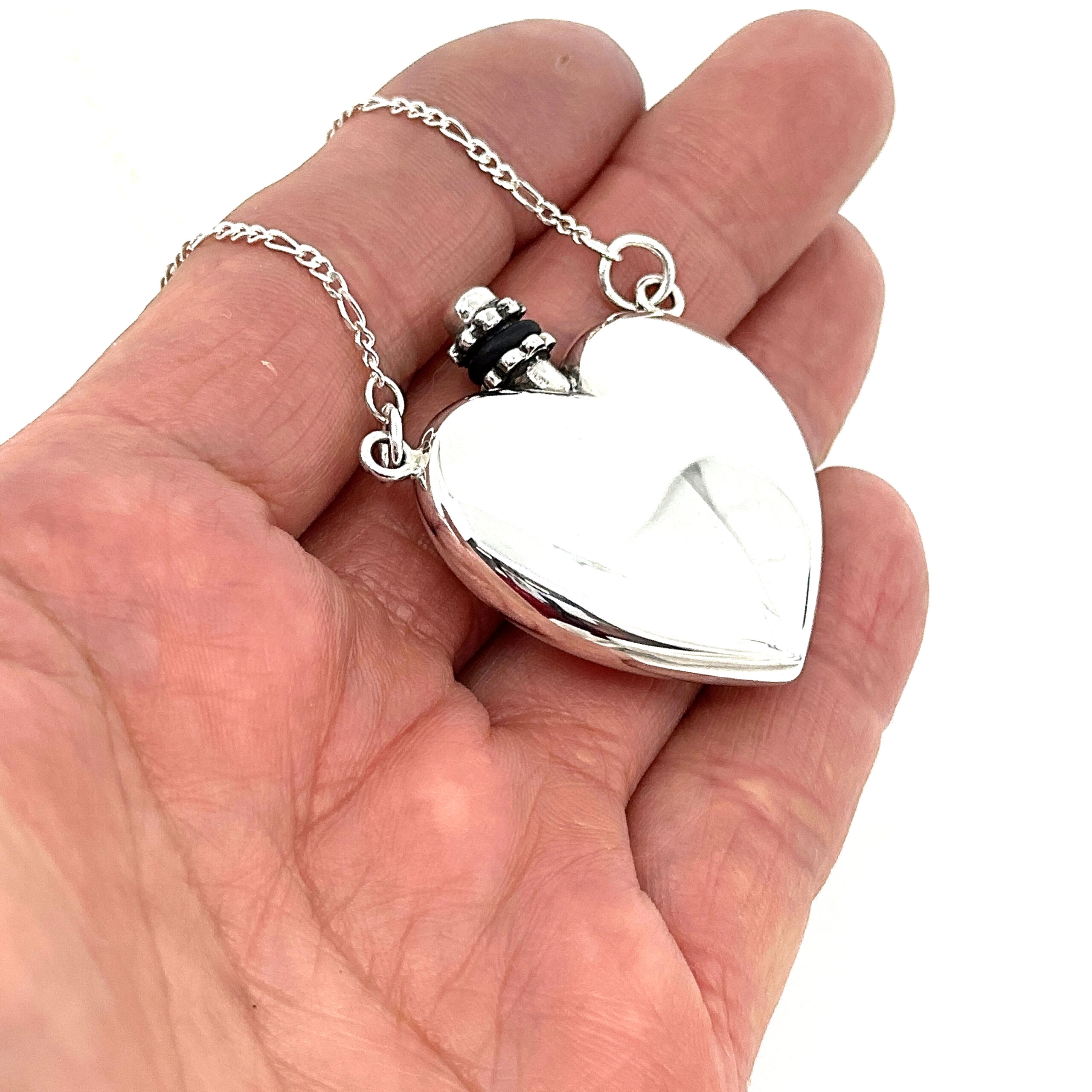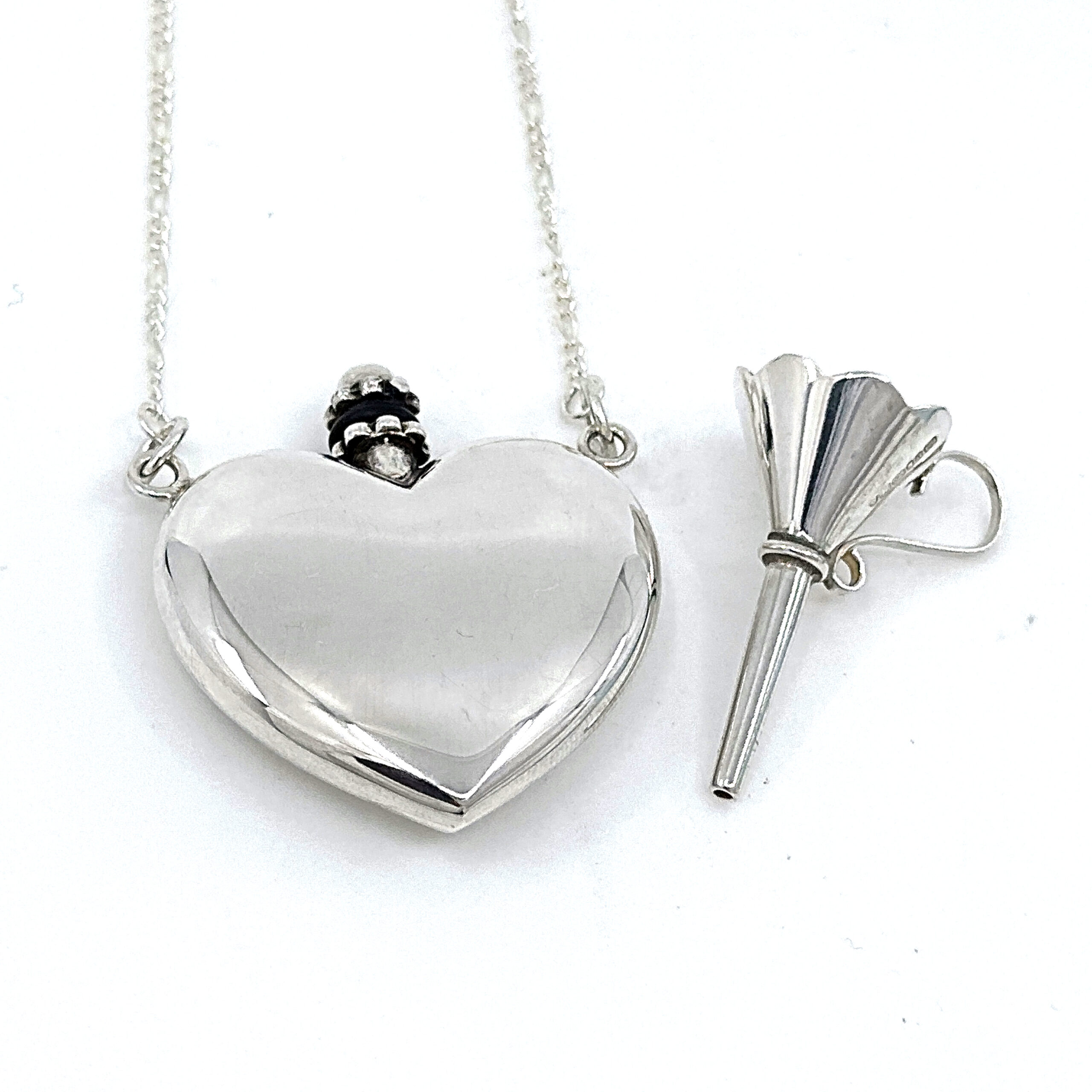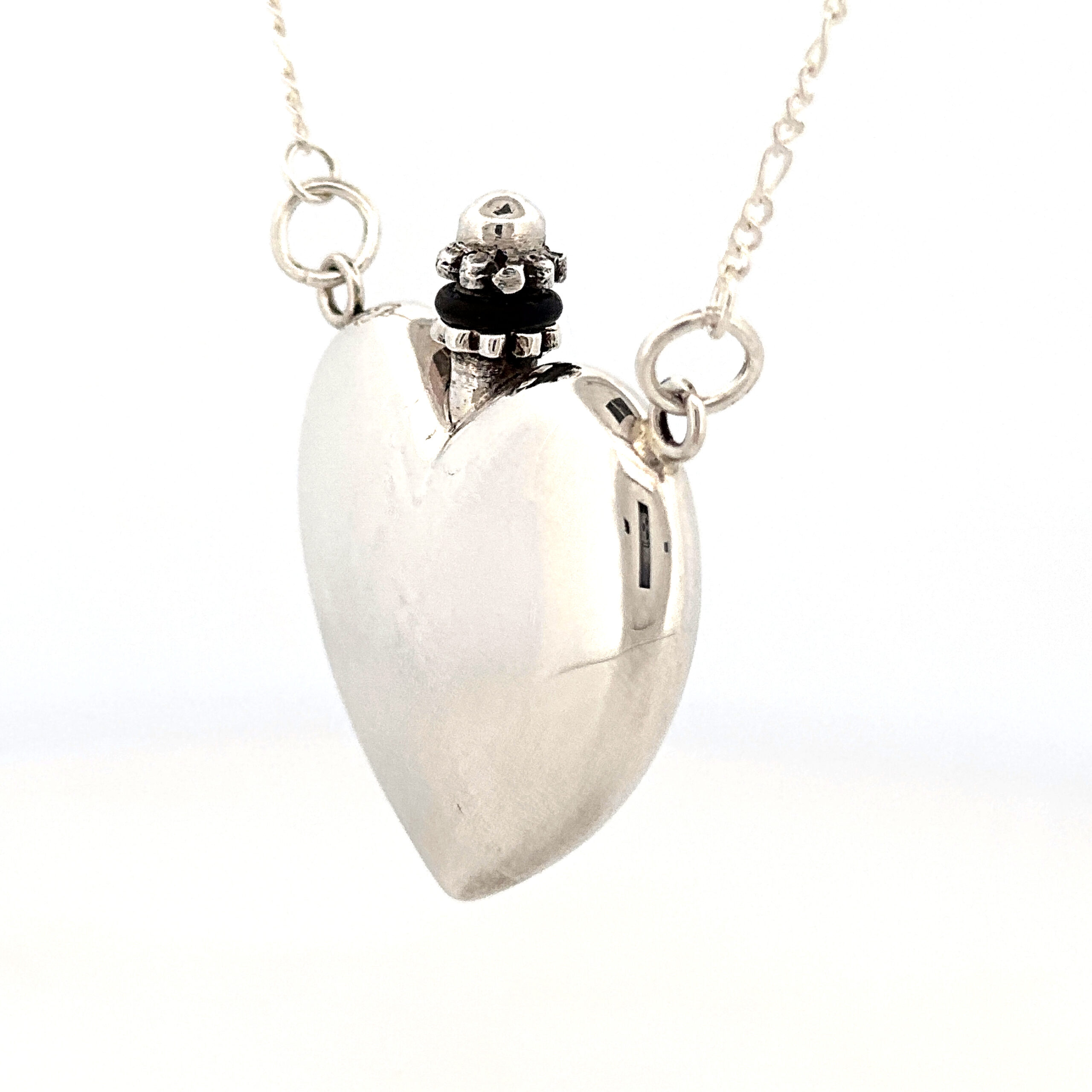 Handcrafted in sterling silver, the perfume bottle is carefully constructed to ensure a secure closure and durable finish. The surfaces are finely polished to highlight the contours of the heart form, while the accompanying funnel is proportioned to allow precise filling. The trace chain complements the scale and weight of the pendant for balanced wear.