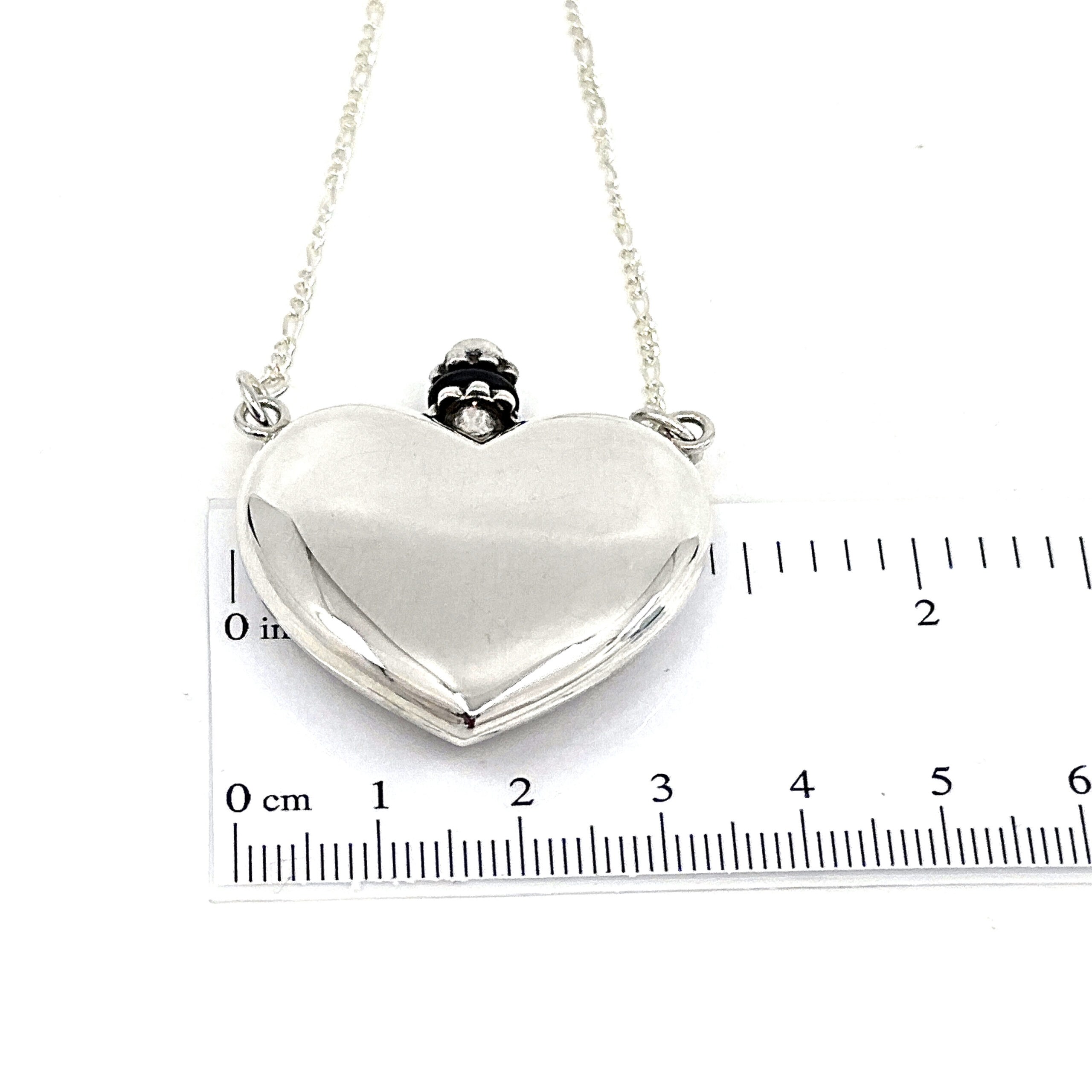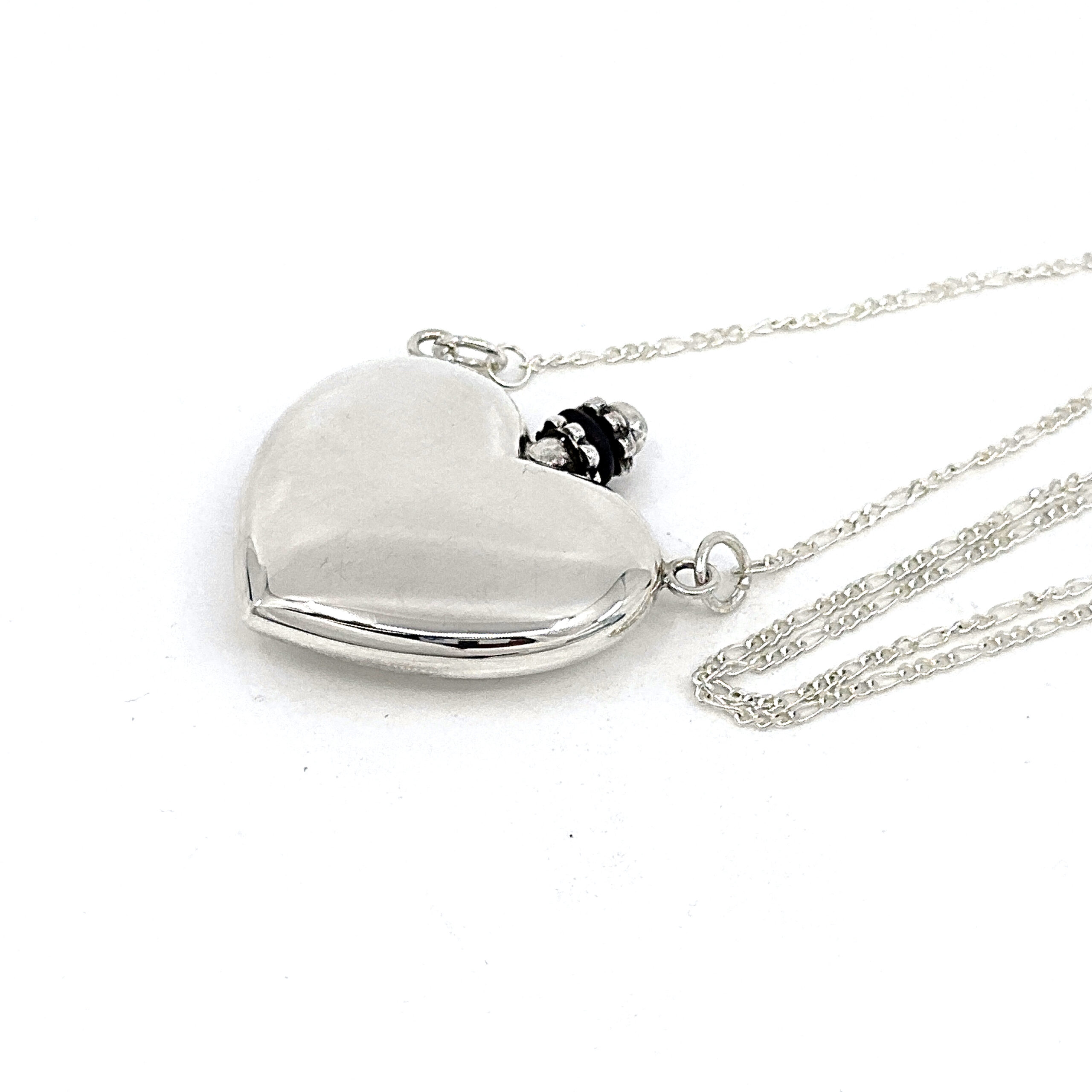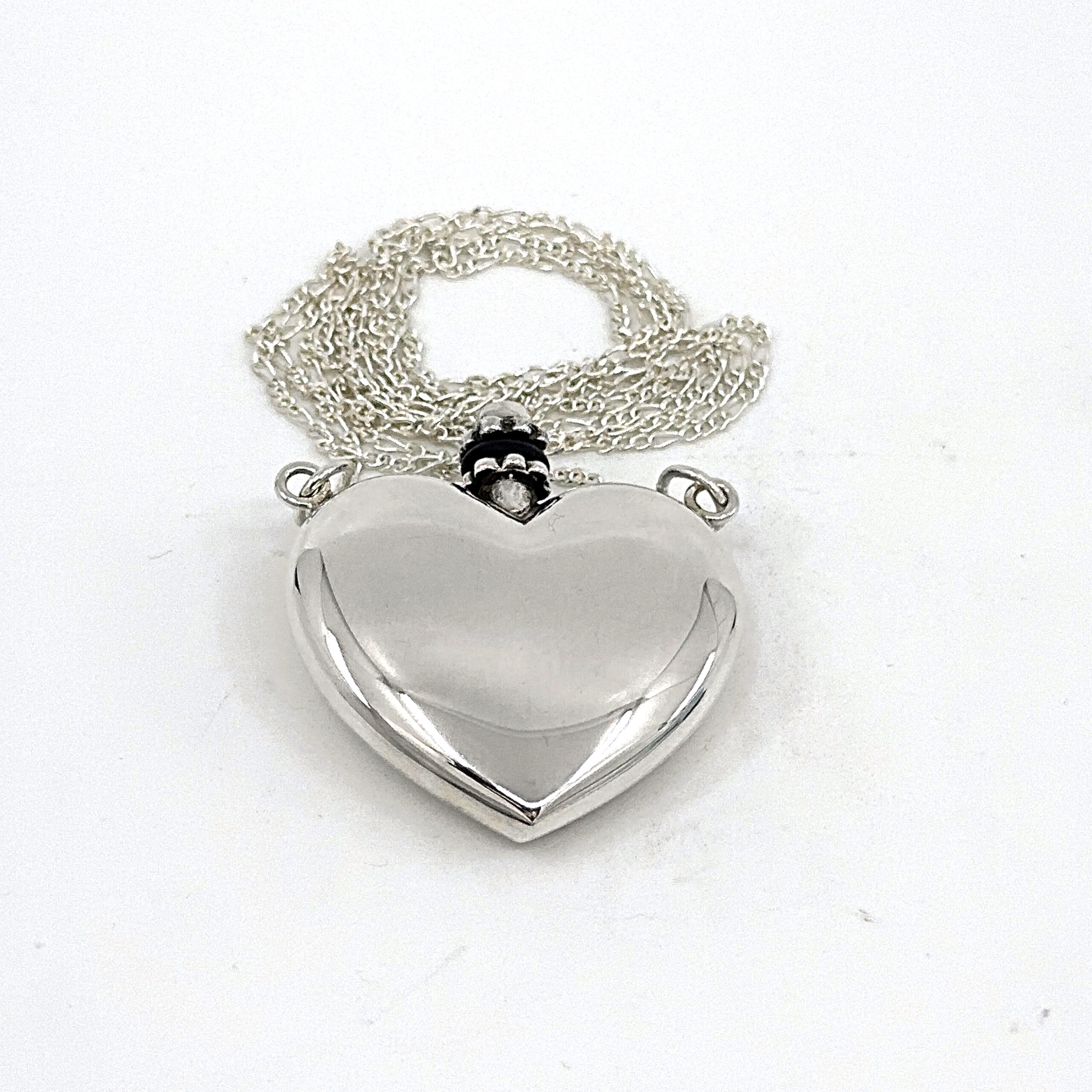 Handcrafted in sterling silver, the perfume bottle is carefully constructed to ensure a secure closure and durable finish. The surfaces are finely polished to highlight the contours of the heart form, while the accompanying funnel is proportioned to allow precise filling. The trace chain complements the scale and weight of the pendant for balanced wear.