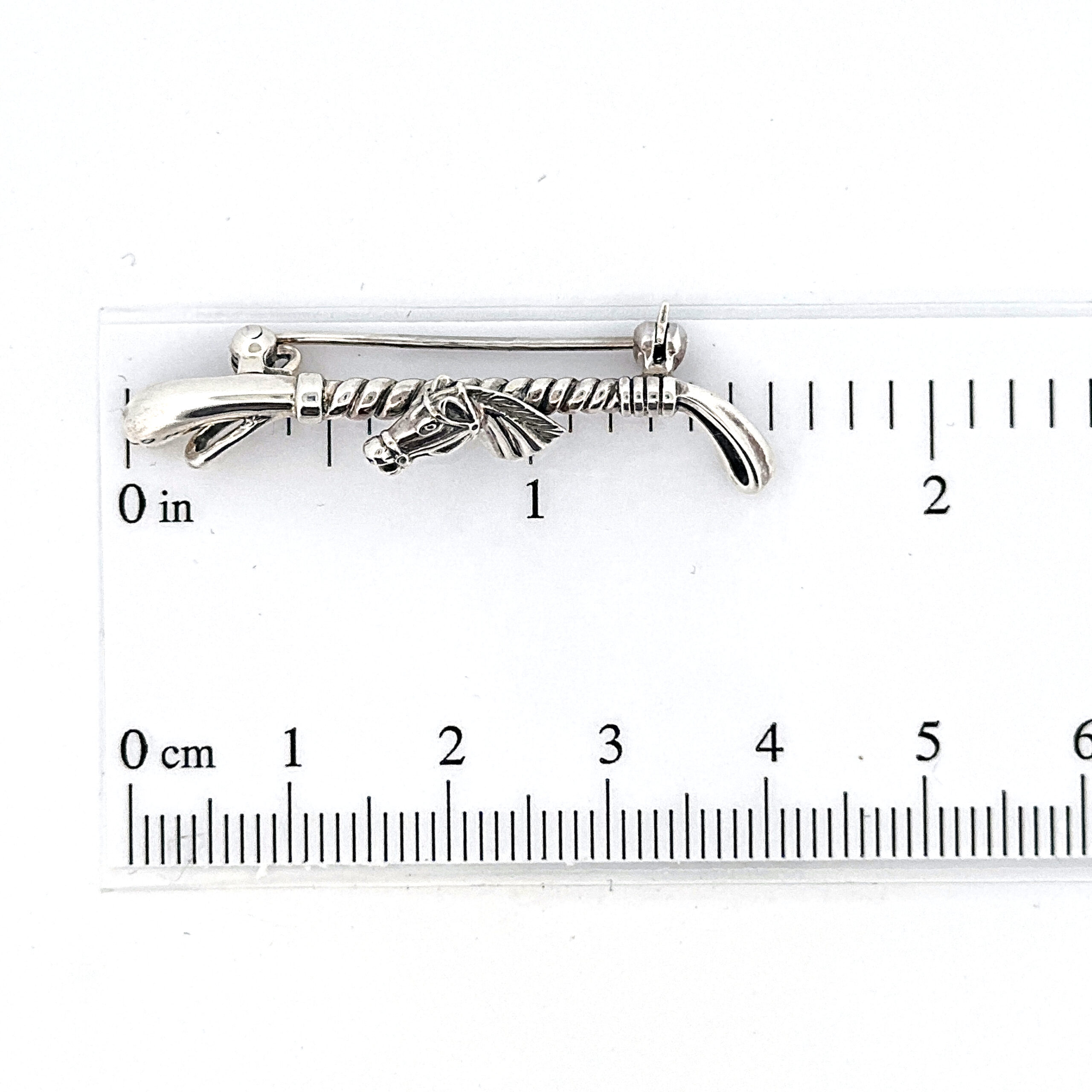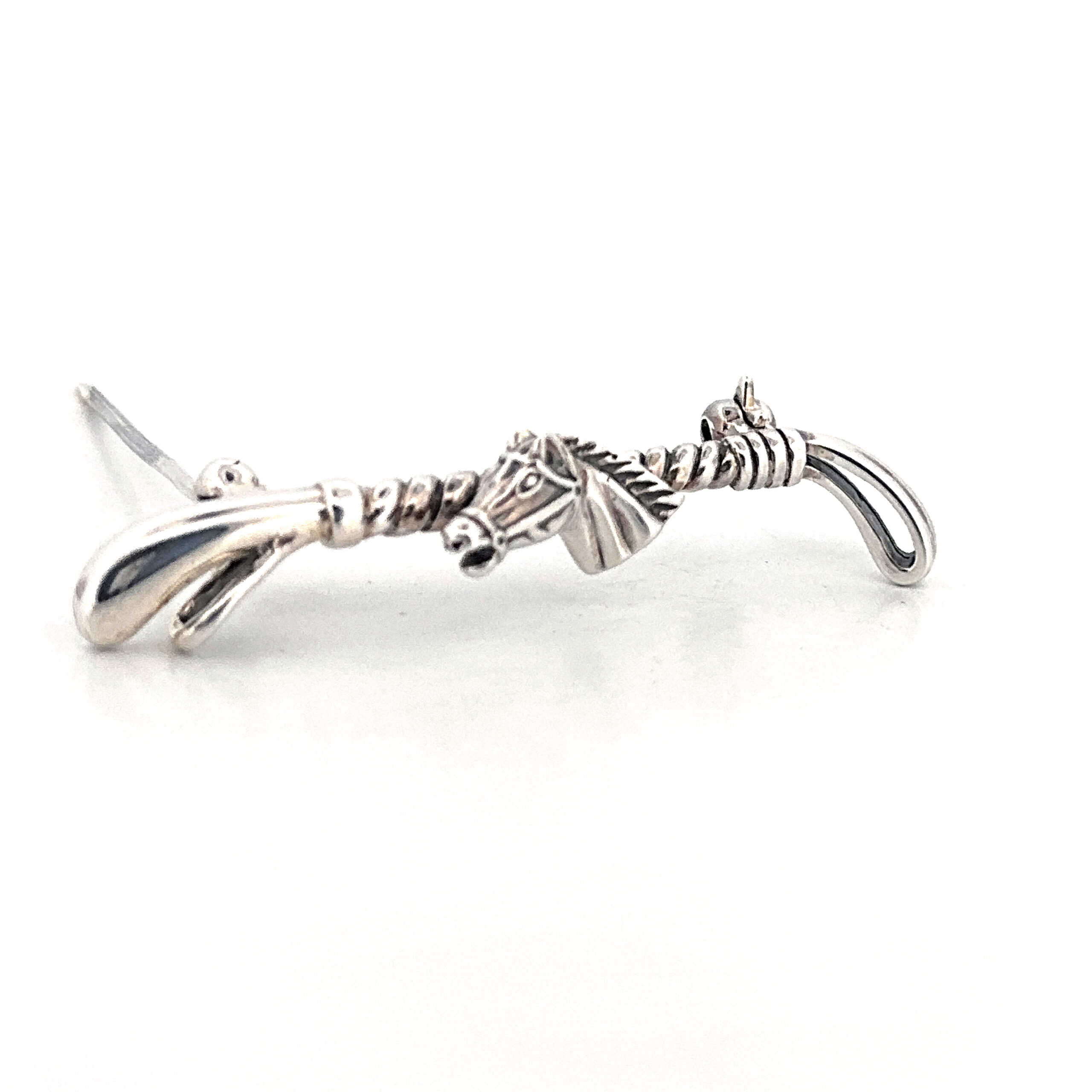 This brooch features a horse head set upon a riding crop, combining two traditional equestrian elements into a single, balanced composition. The design presents the subject with clarity, using a compact arrangement that highlights both form and symbolism.