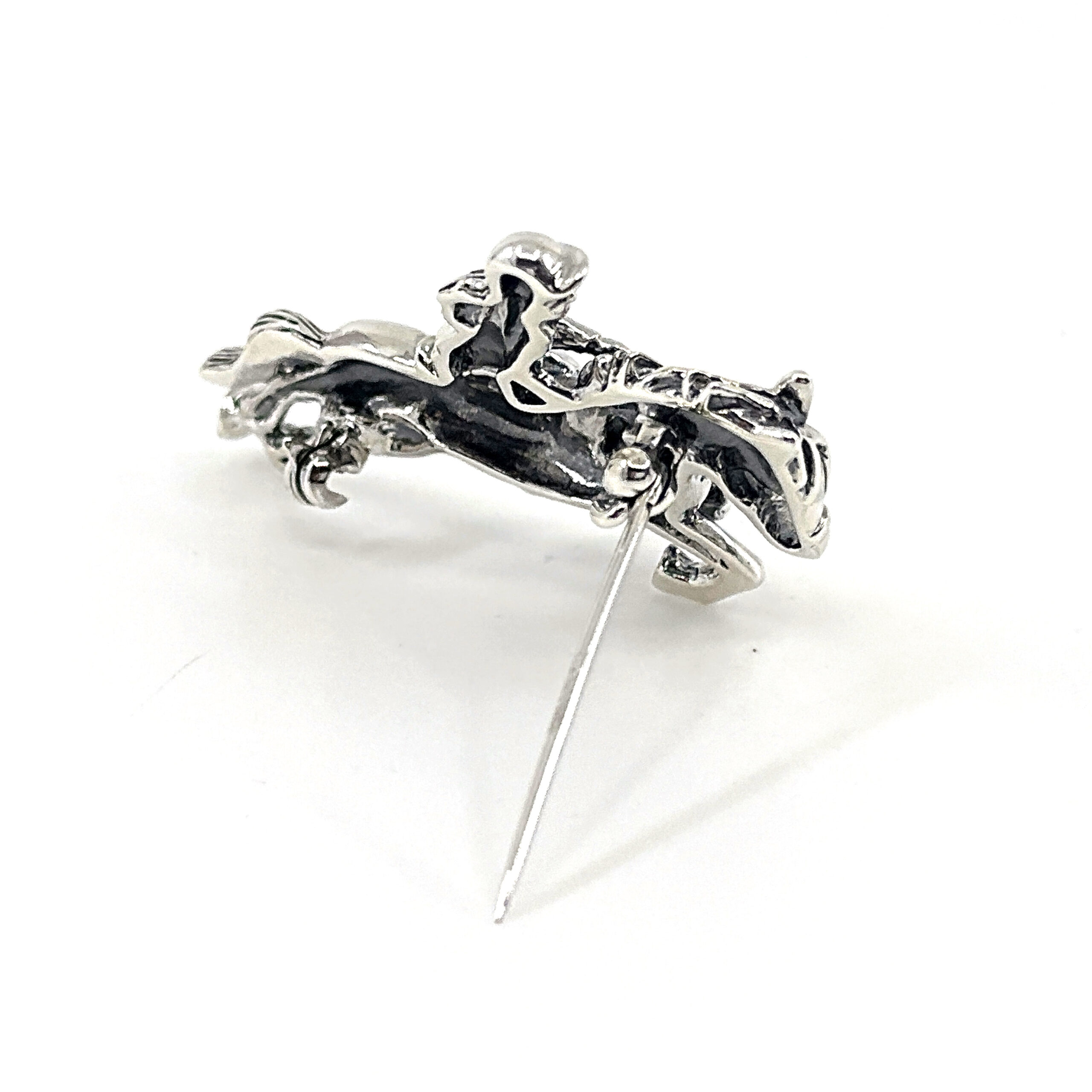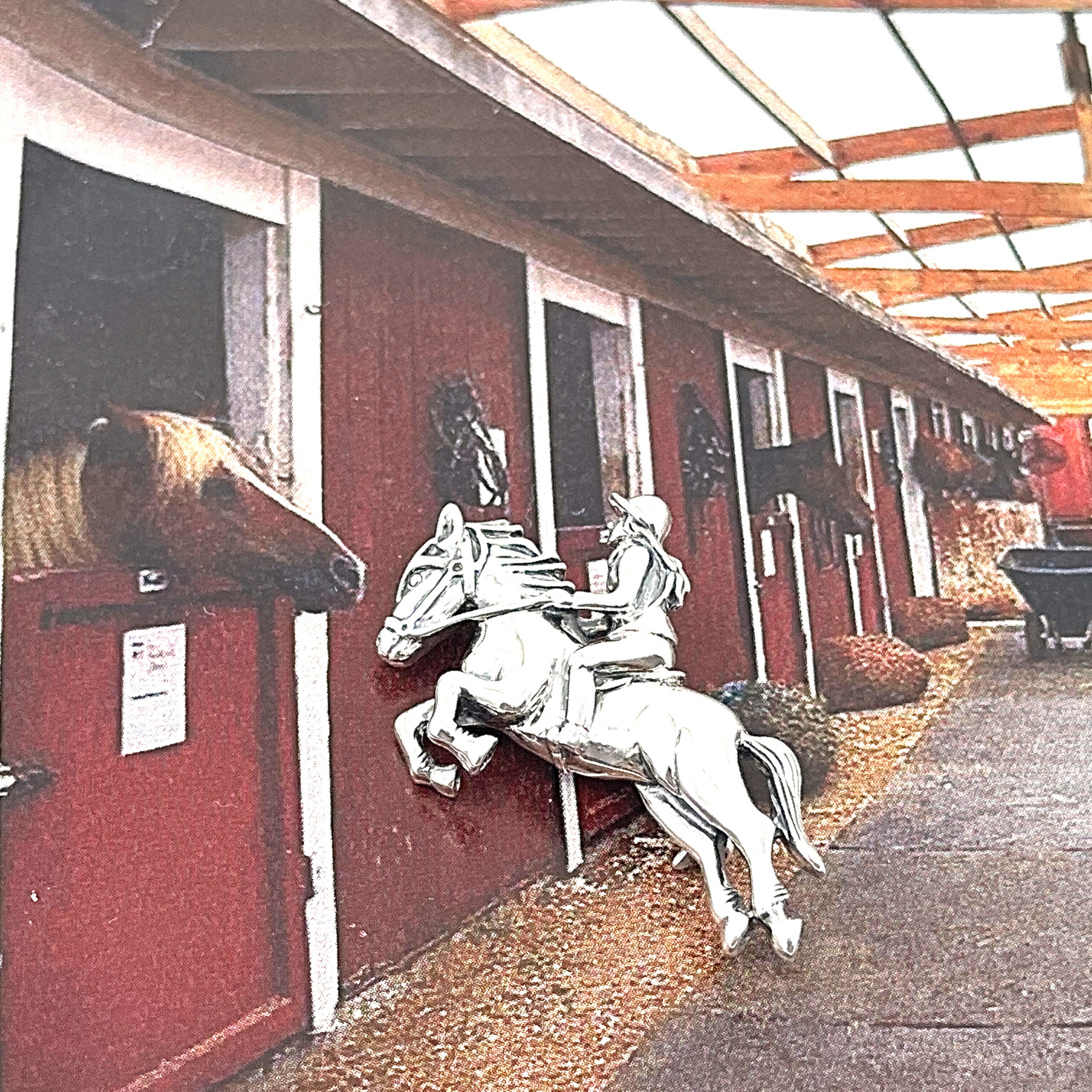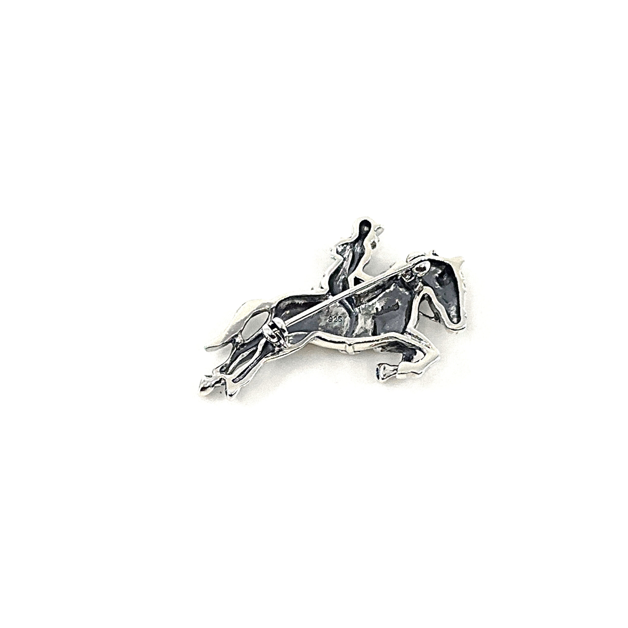 The design focuses on proportion and silhouette, allowing the interaction between horse and rider to remain the central visual element. Its structured form ensures it sits neatly when worn, while retaining a sense of movement and narrative within the piece.