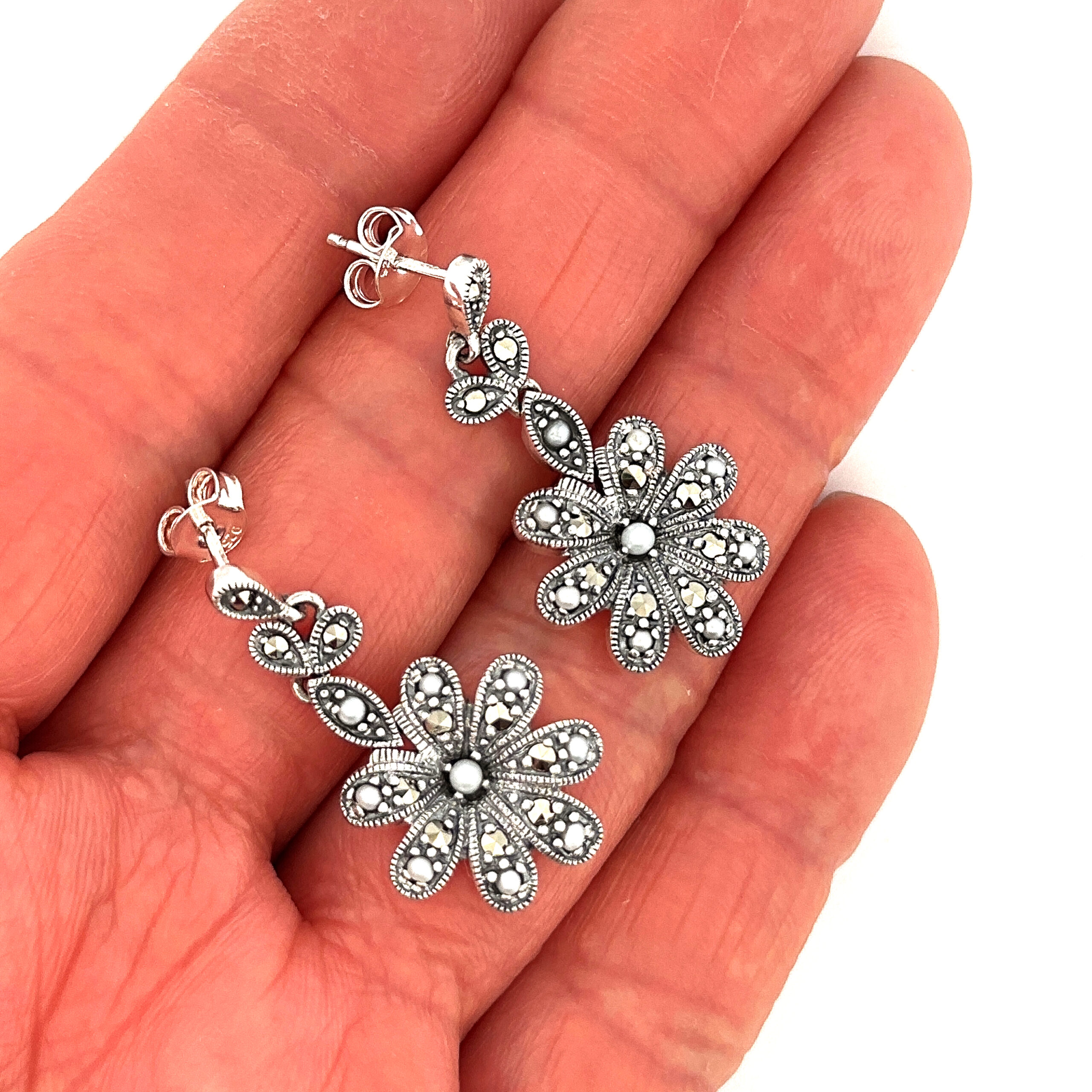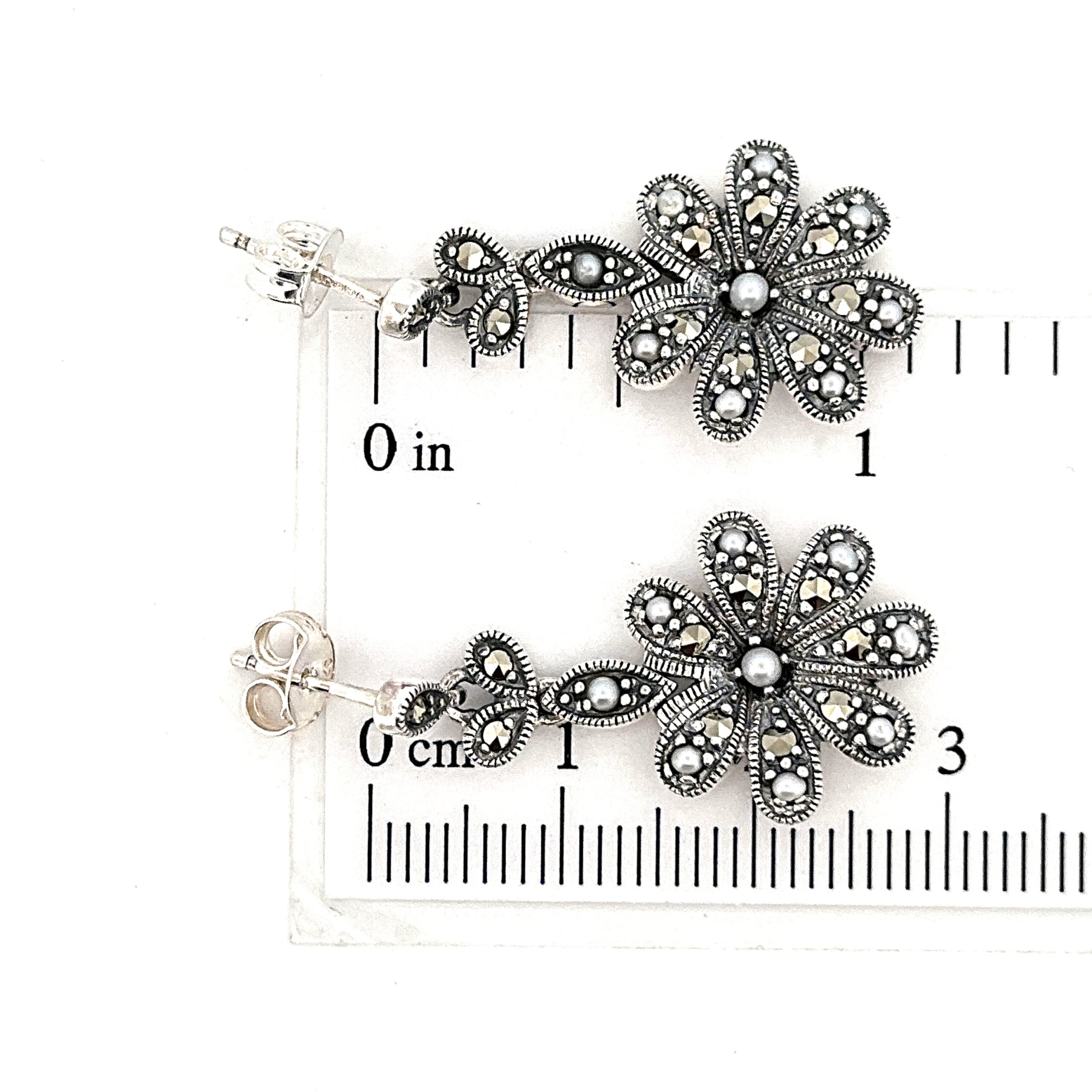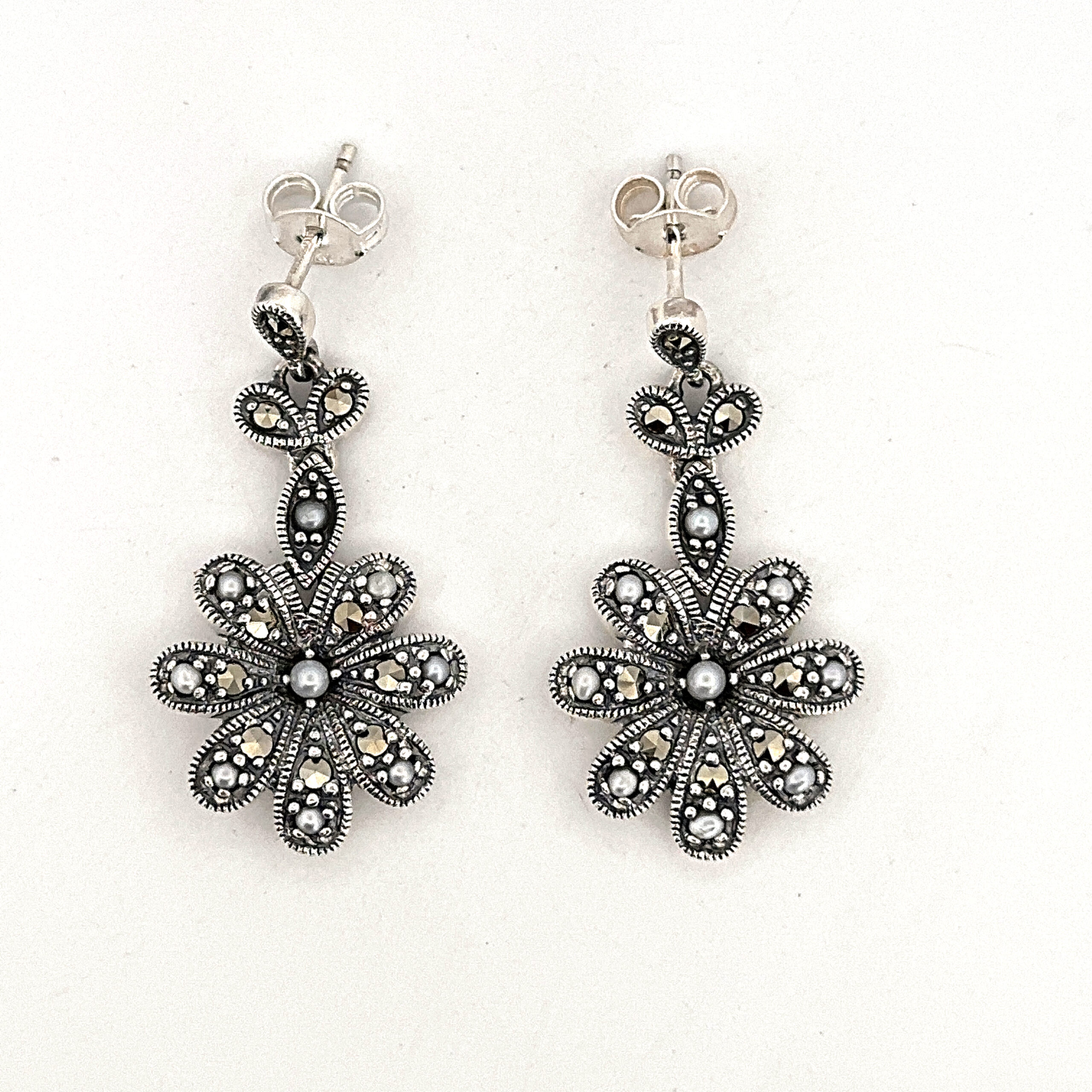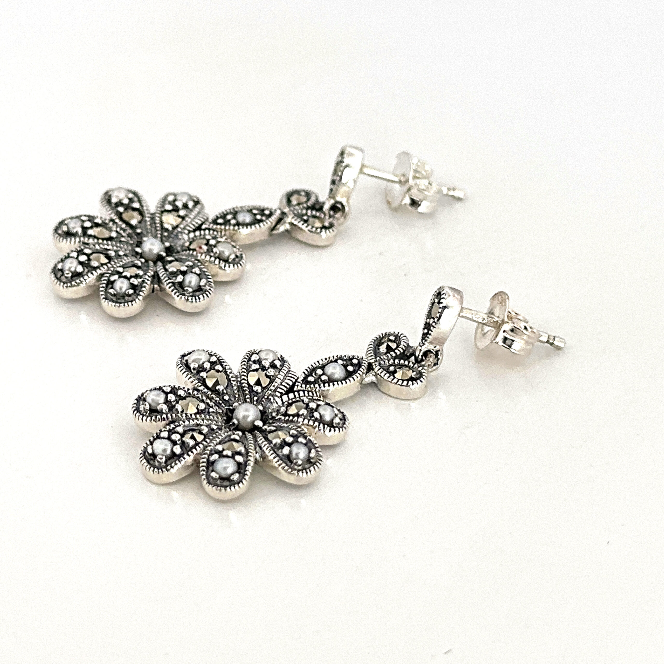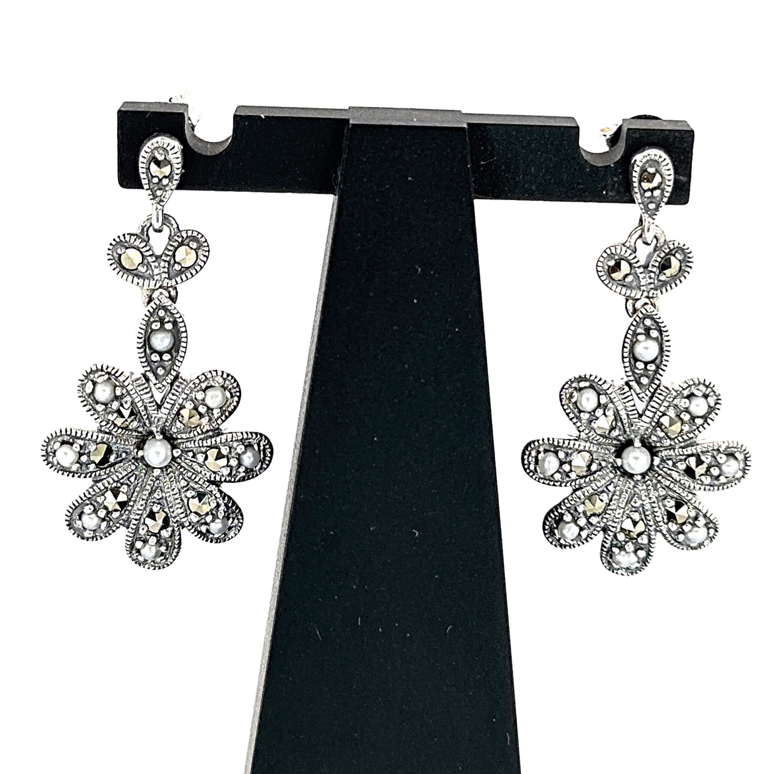 Marcasite elements define the petals, while pearl accents introduce contrast and a softer lustre. The drop format adds gentle movement, enhancing the overall composition while maintaining a composed and elegant appearance.
