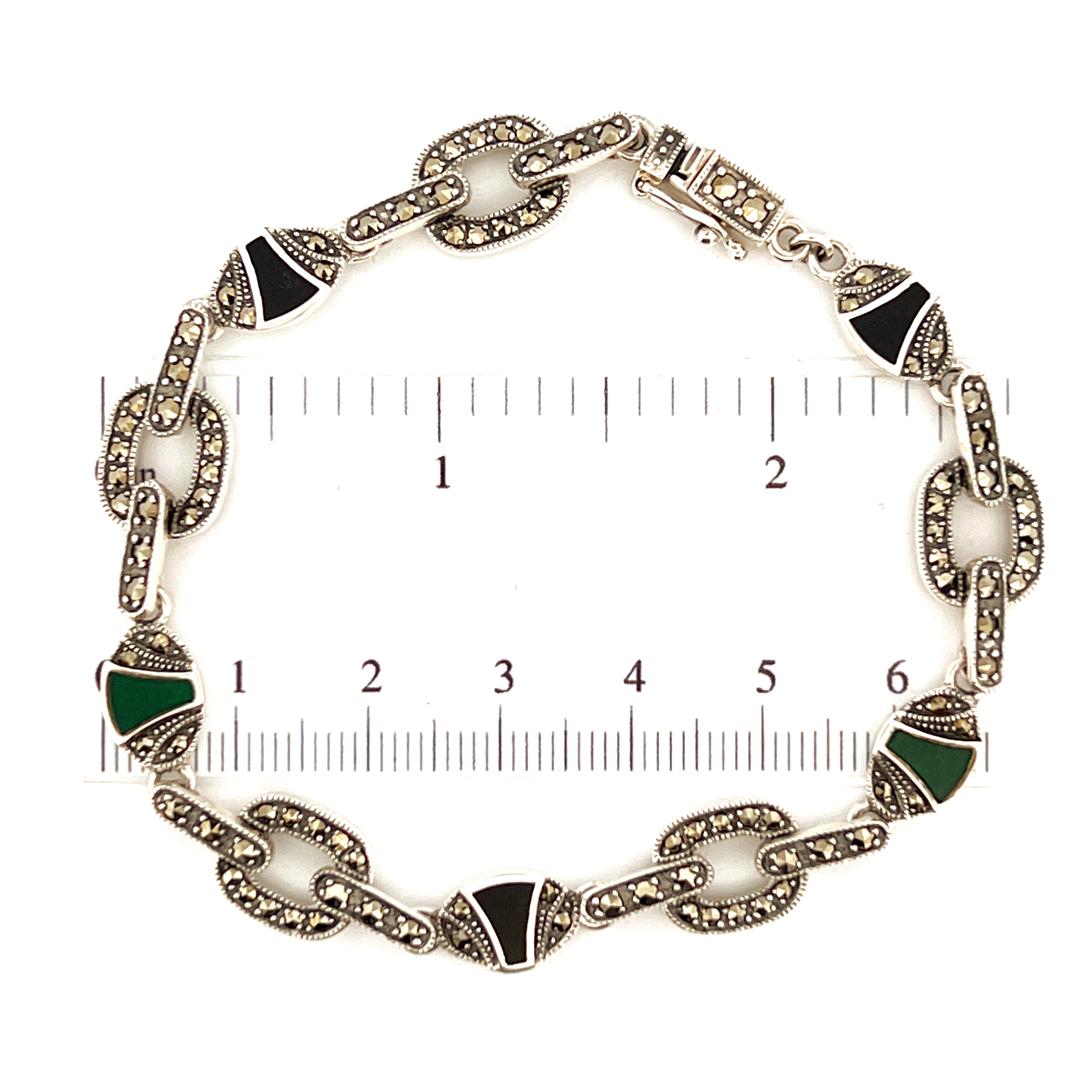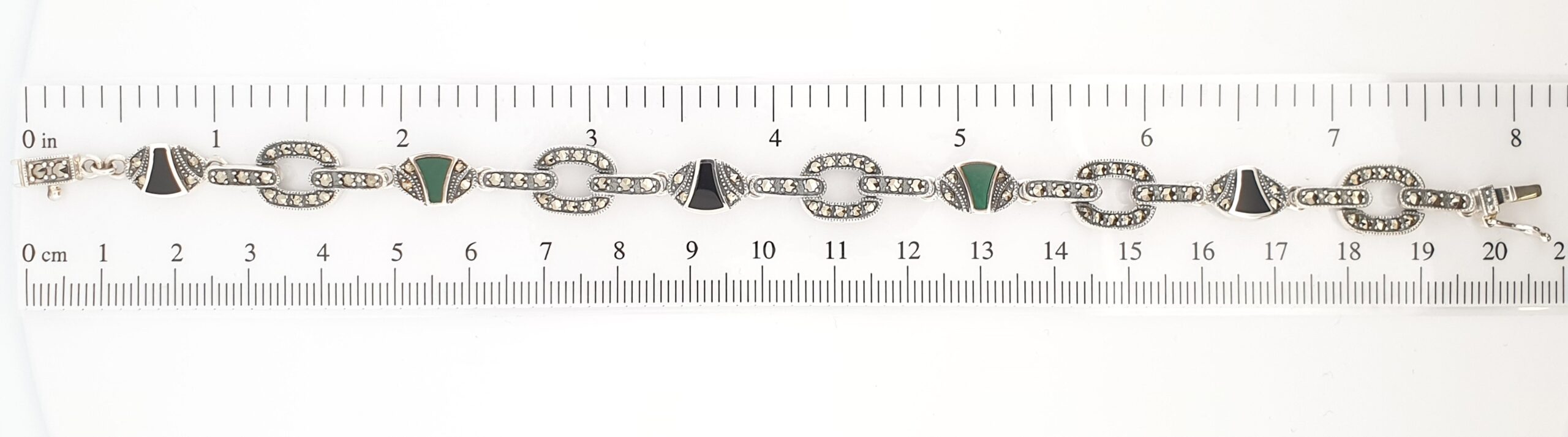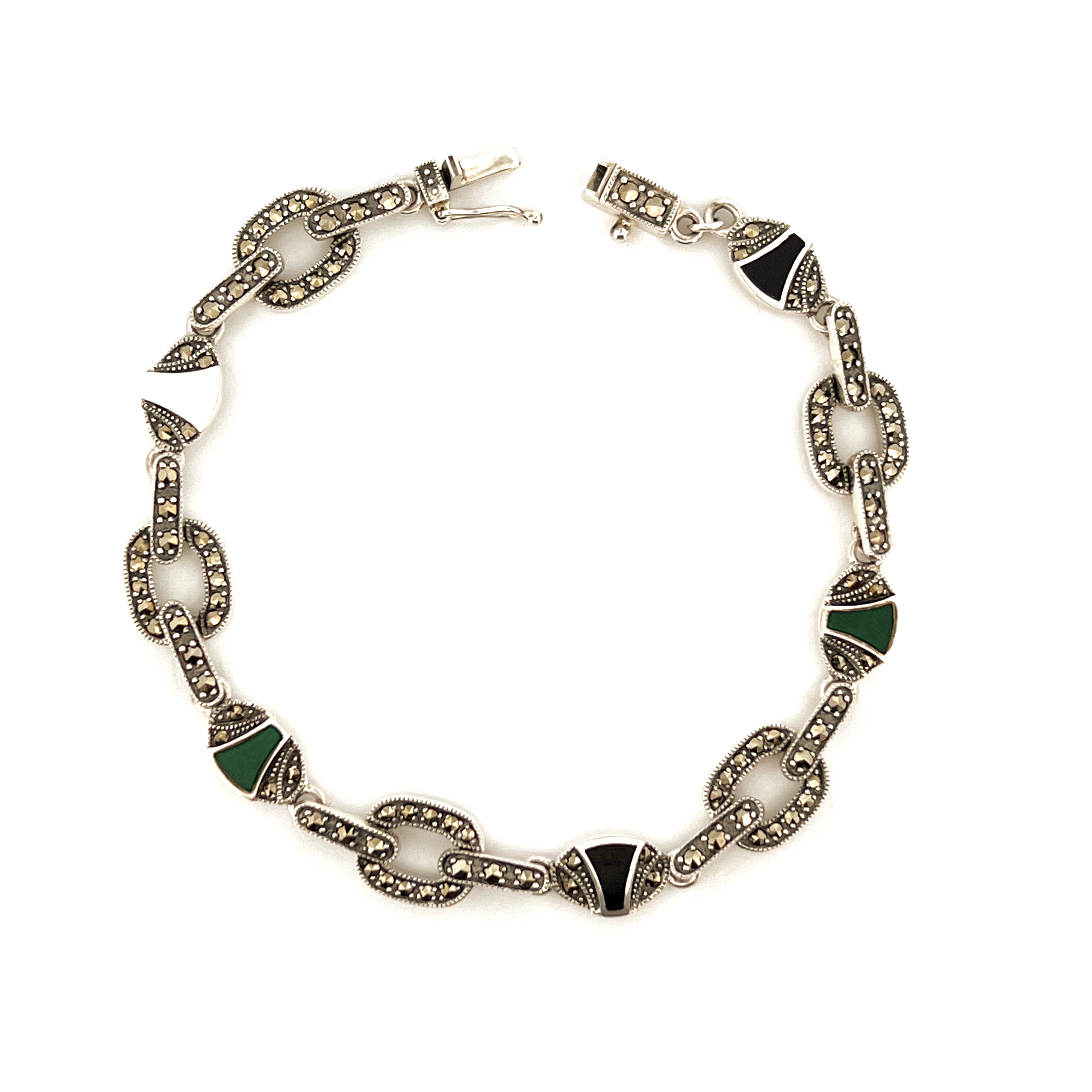 This bracelet presents a refined composition of black onyx, green agate, and marcasite, arranged in a structured sequence that reflects the precision and balance of Art Deco design. The contrast between the deep tones of the stones and the intricate detailing creates a measured and elegant visual rhythm.