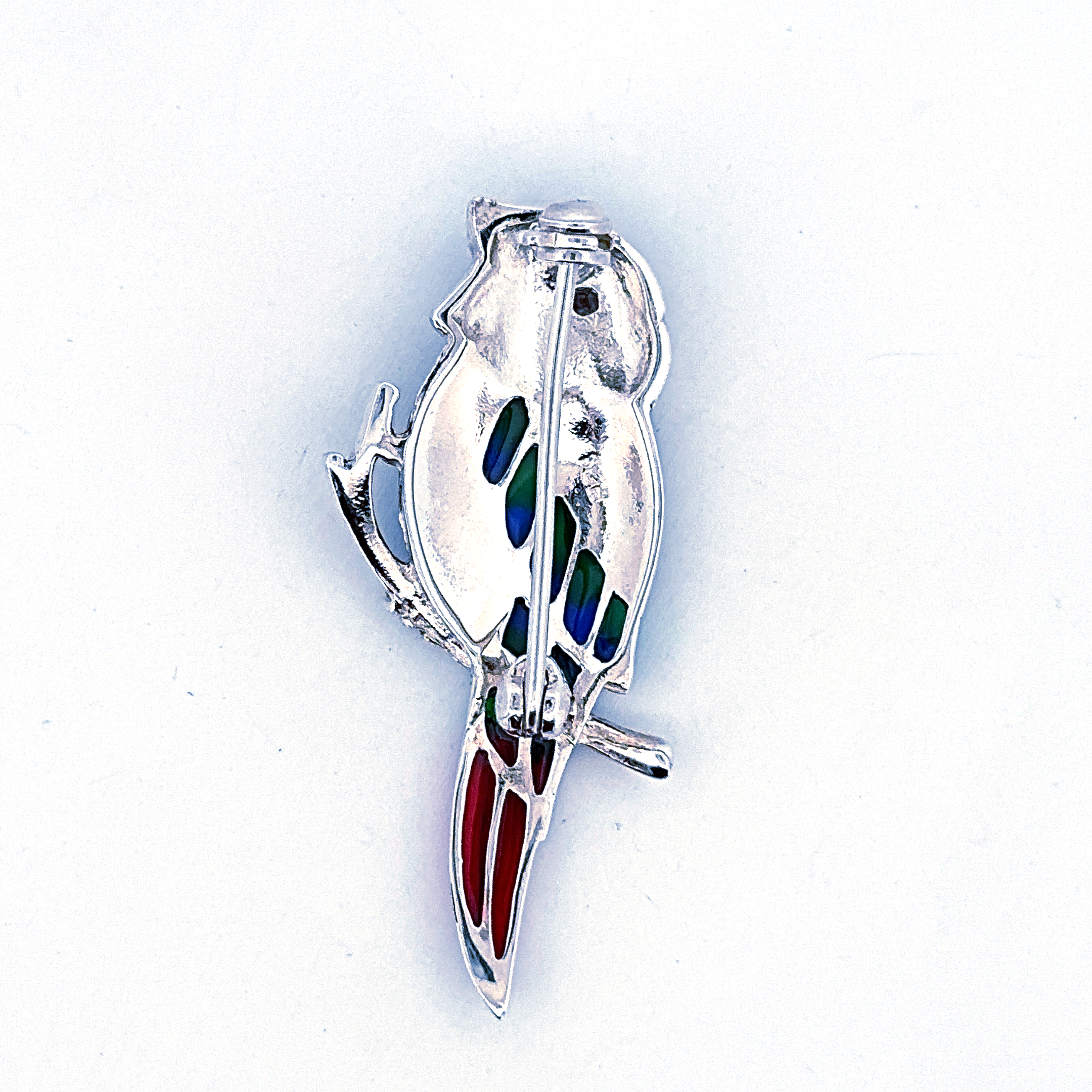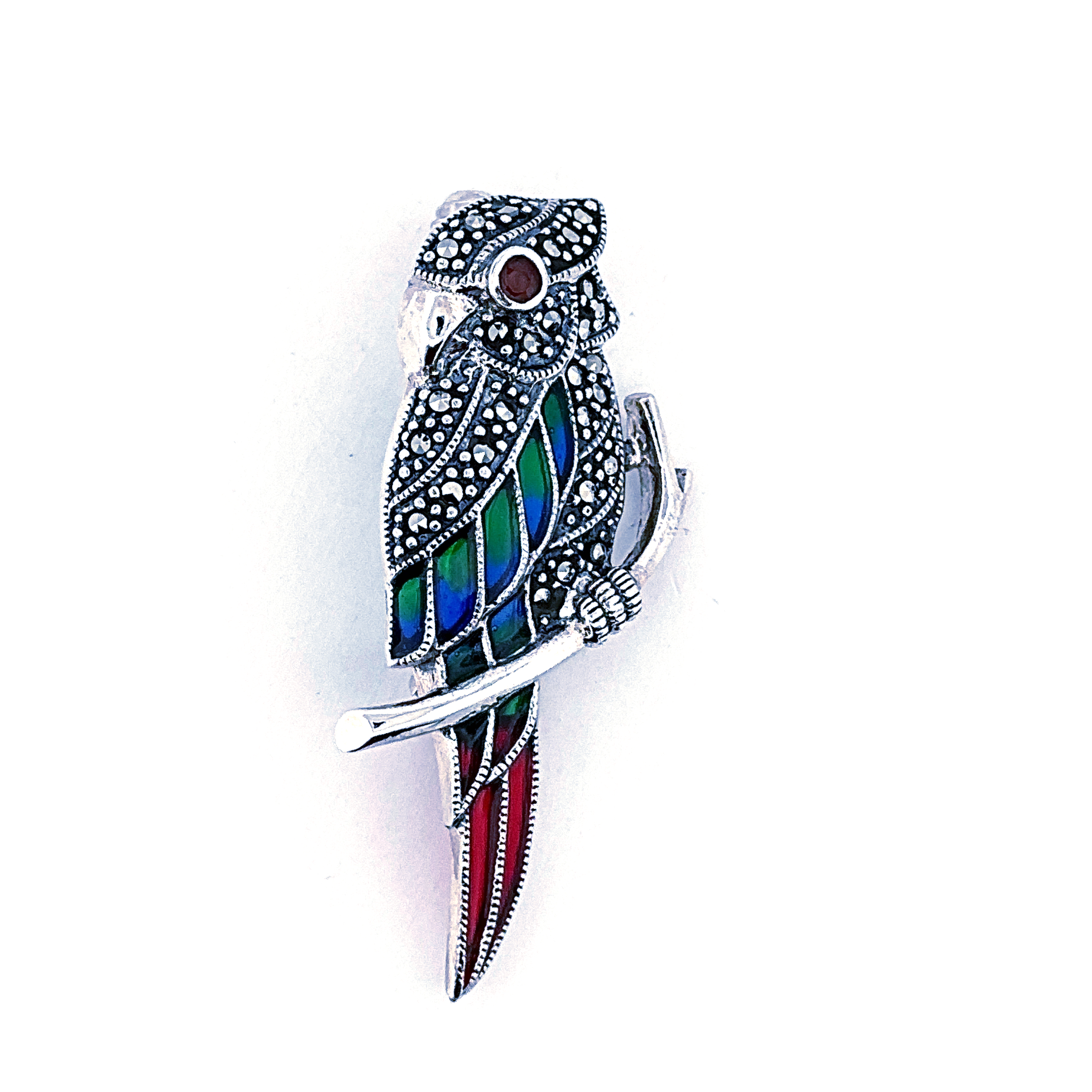 The decorative composition highlights the natural elegance of the parrot through flowing lines and detailed ornamentation. The contrast between the colourful enamel, the sparkle of the marcasite and the polished silver creates a distinctive and lively jewellery piece.
