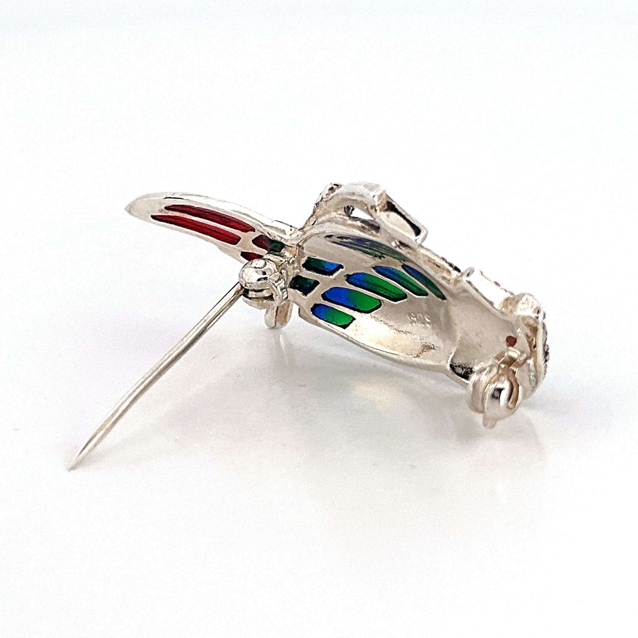 This brooch is handcrafted in sterling silver using traditional jewellery-making techniques. The enamel colours are carefully applied to the feathered details, the marcasite stones precisely set across the design, and the garnet eyes positioned to enhance the character of the bird. The piece is hand finished and polished to achieve a refined surface.