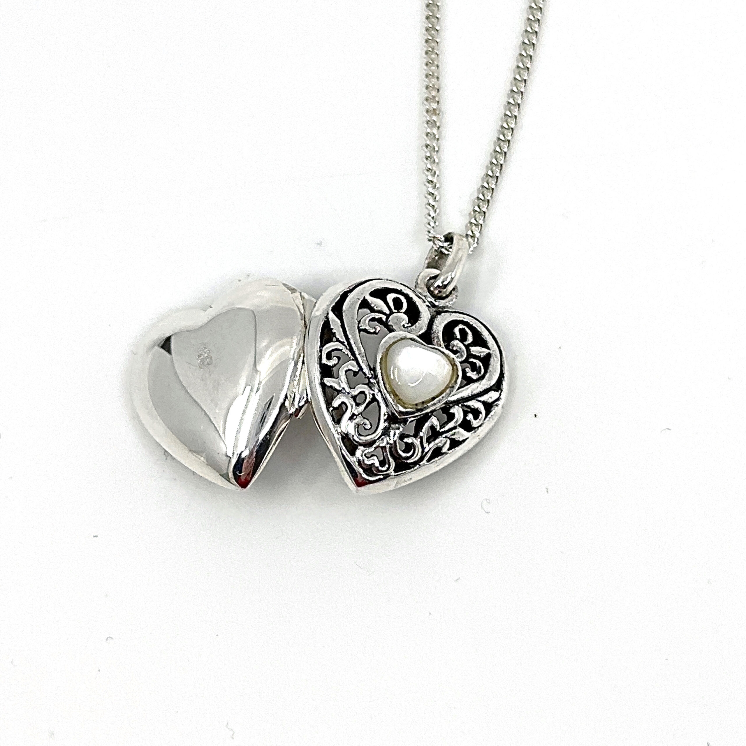 Handcrafted in sterling silver, the pendant is carefully formed to achieve fine filigree detailing across the heart-shaped frame. The mother of pearl is securely mounted to create a smooth and luminous centre, while the hinged construction allows the interior space to hold a photograph. The coordinating curb chain provides strength and proportion in wear.