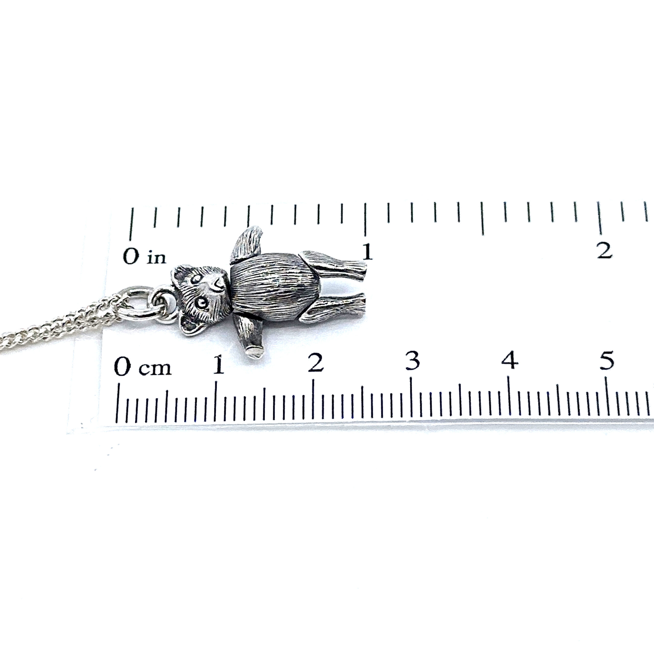 Handcrafted in sterling silver, the teddy bear figure is carefully formed with an articulated section designed to allow movement while maintaining durability. The surfaces are finely finished and polished to highlight the contours of the design. The coordinating chain complements the scale and weight of the pendant for balanced wear.
