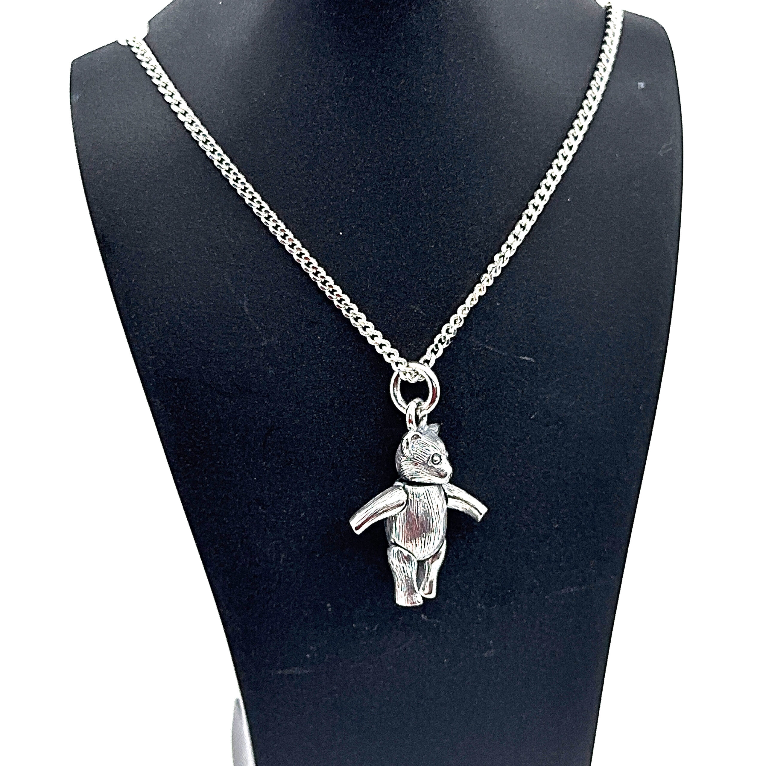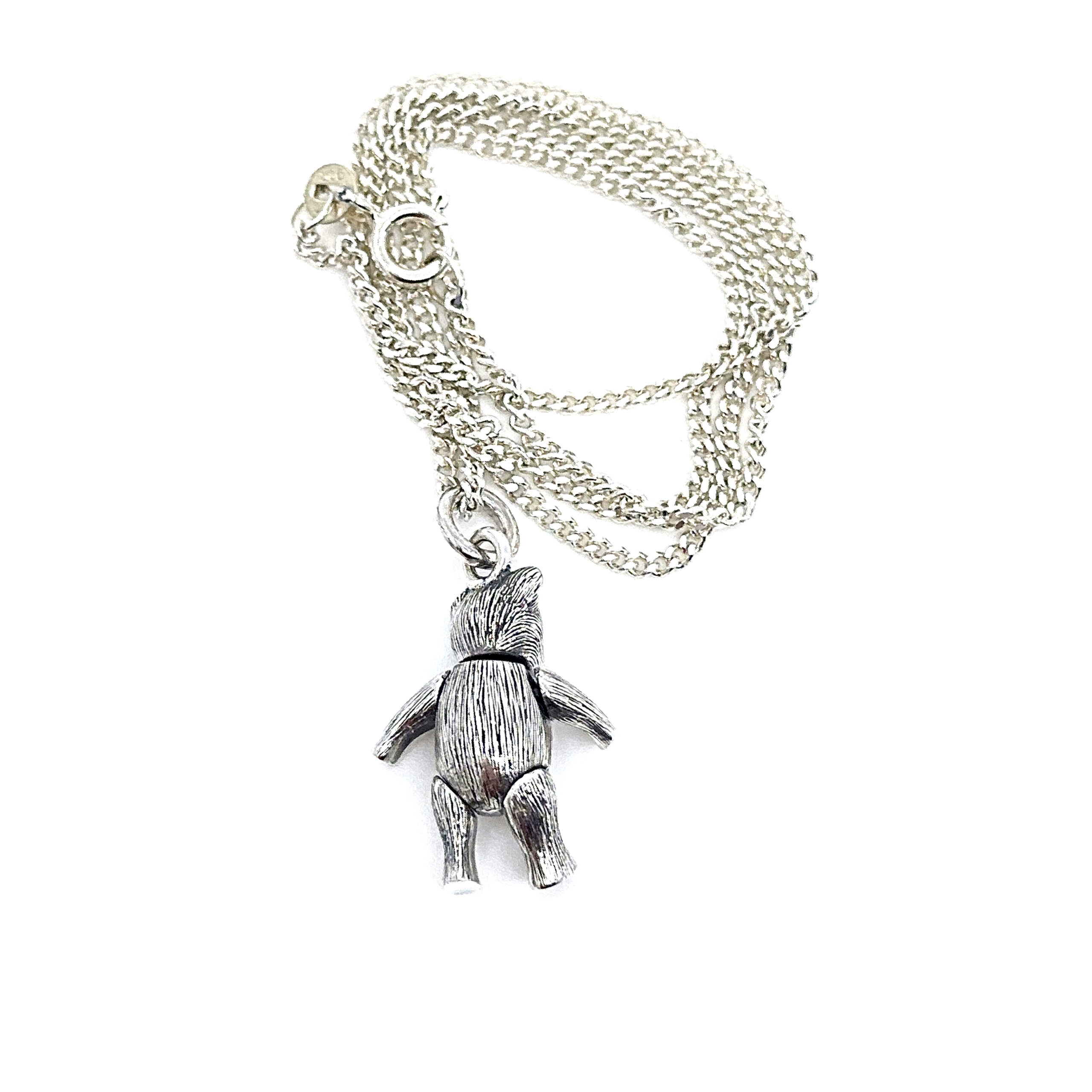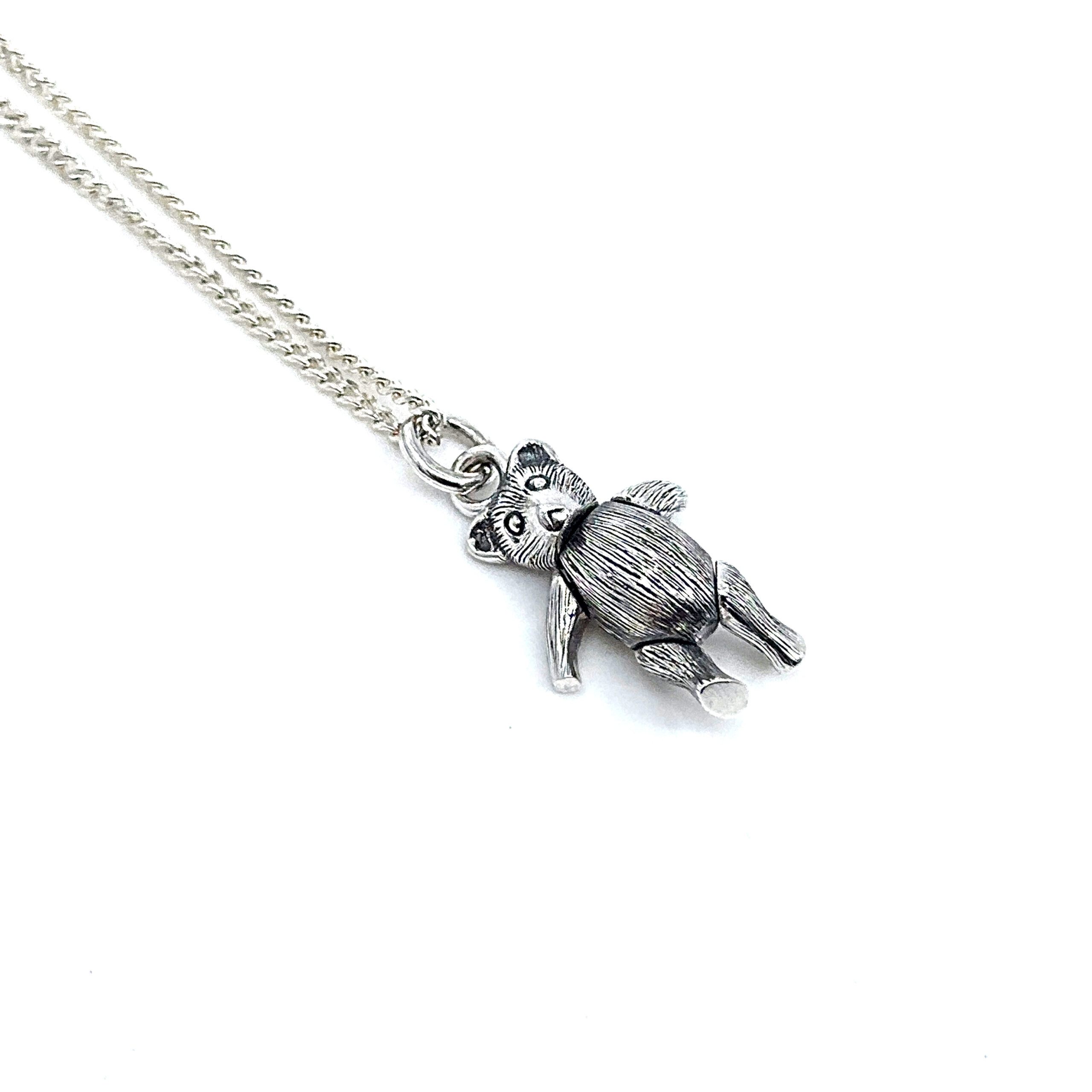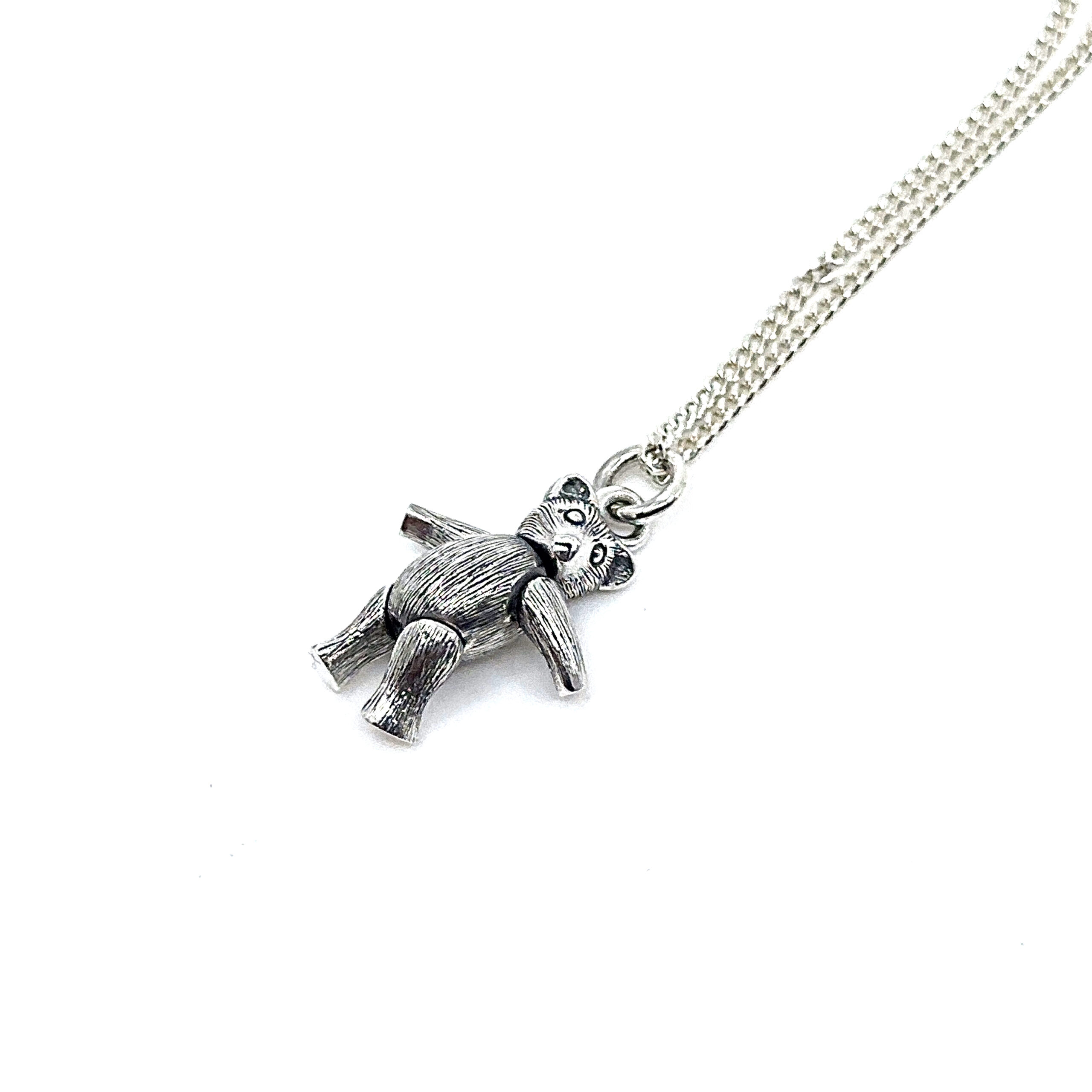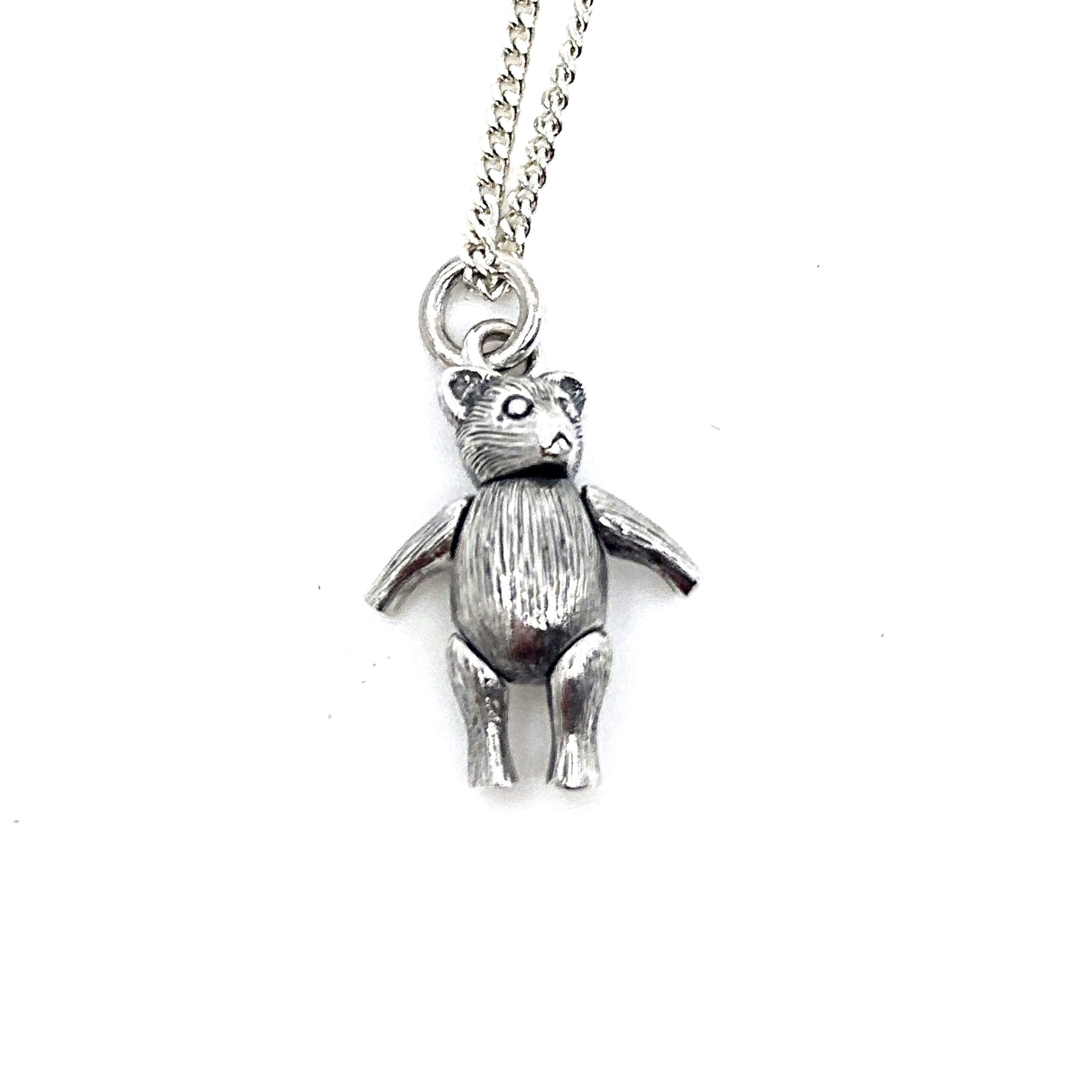 This pendant features a teddy bear motif designed with an articulated element that allows gentle movement when worn. The sculpted figure captures the familiar outline of the teddy bear in a simple and balanced form, giving the piece a playful and recognisable character.