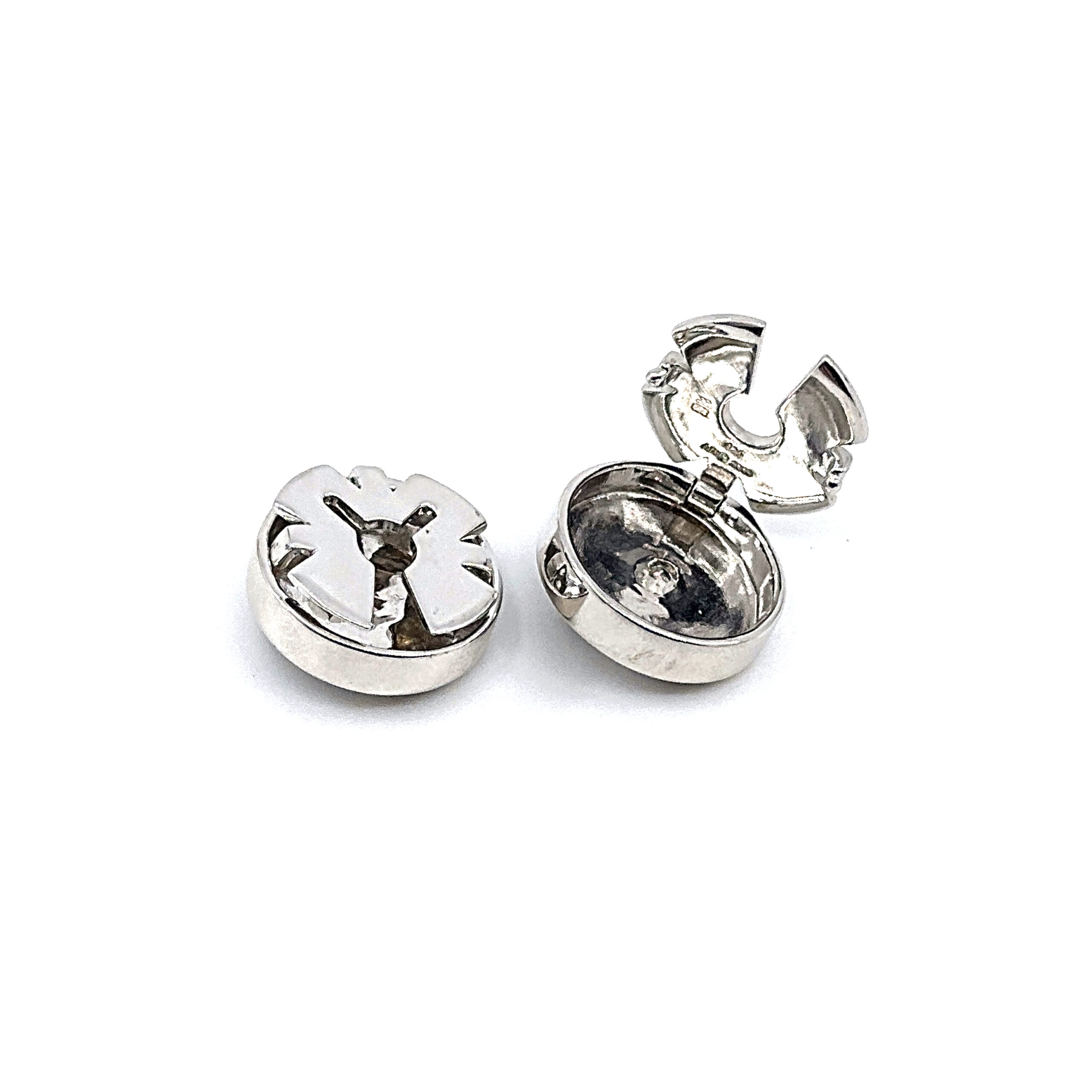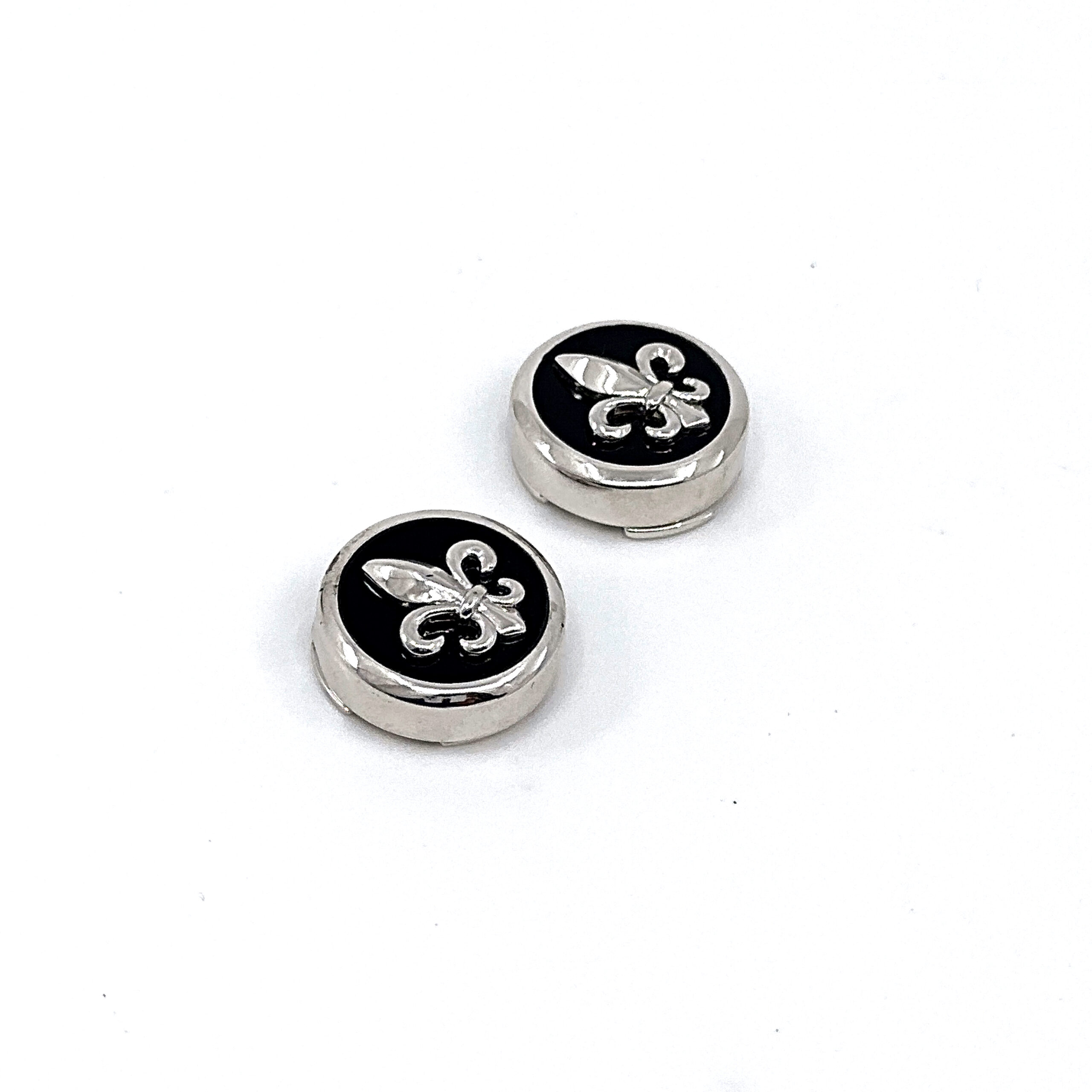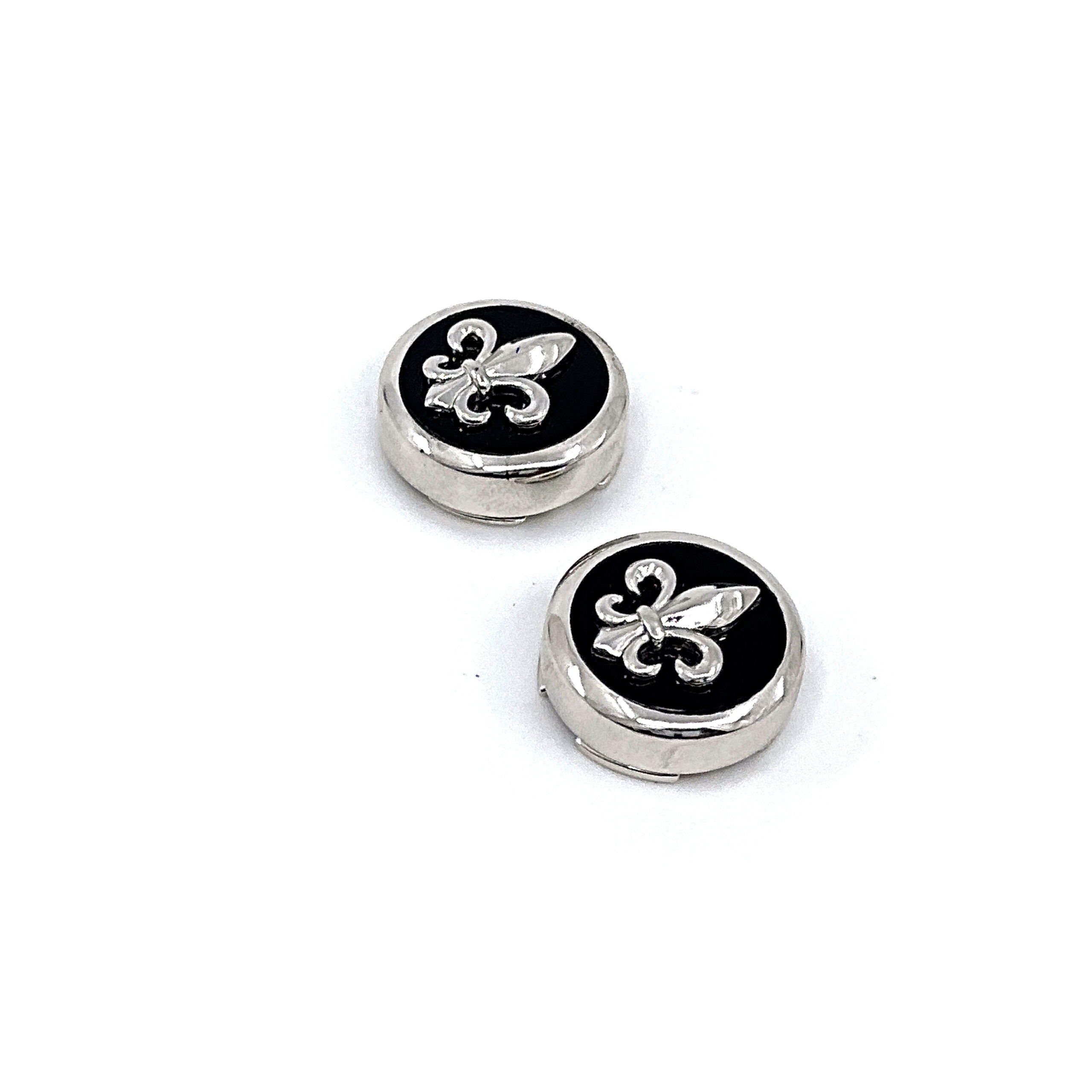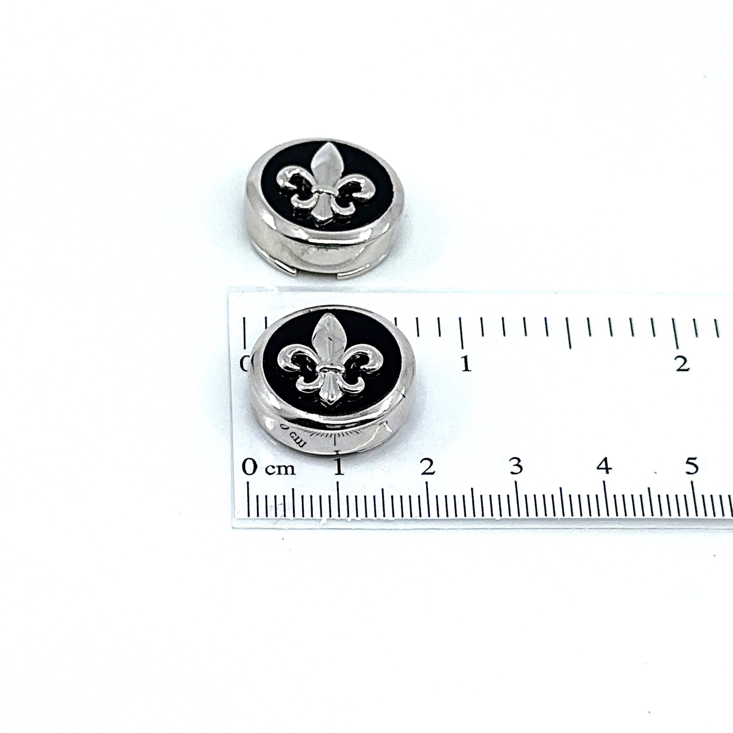 These Fleur De Lys button covers are designed to bring decorative detail and refinement to formal shirts and cuffs. The round form frames the classic Fleur De Lys motif against a dark enamel ground, creating a strong contrast and a clean, distinguished finish.
