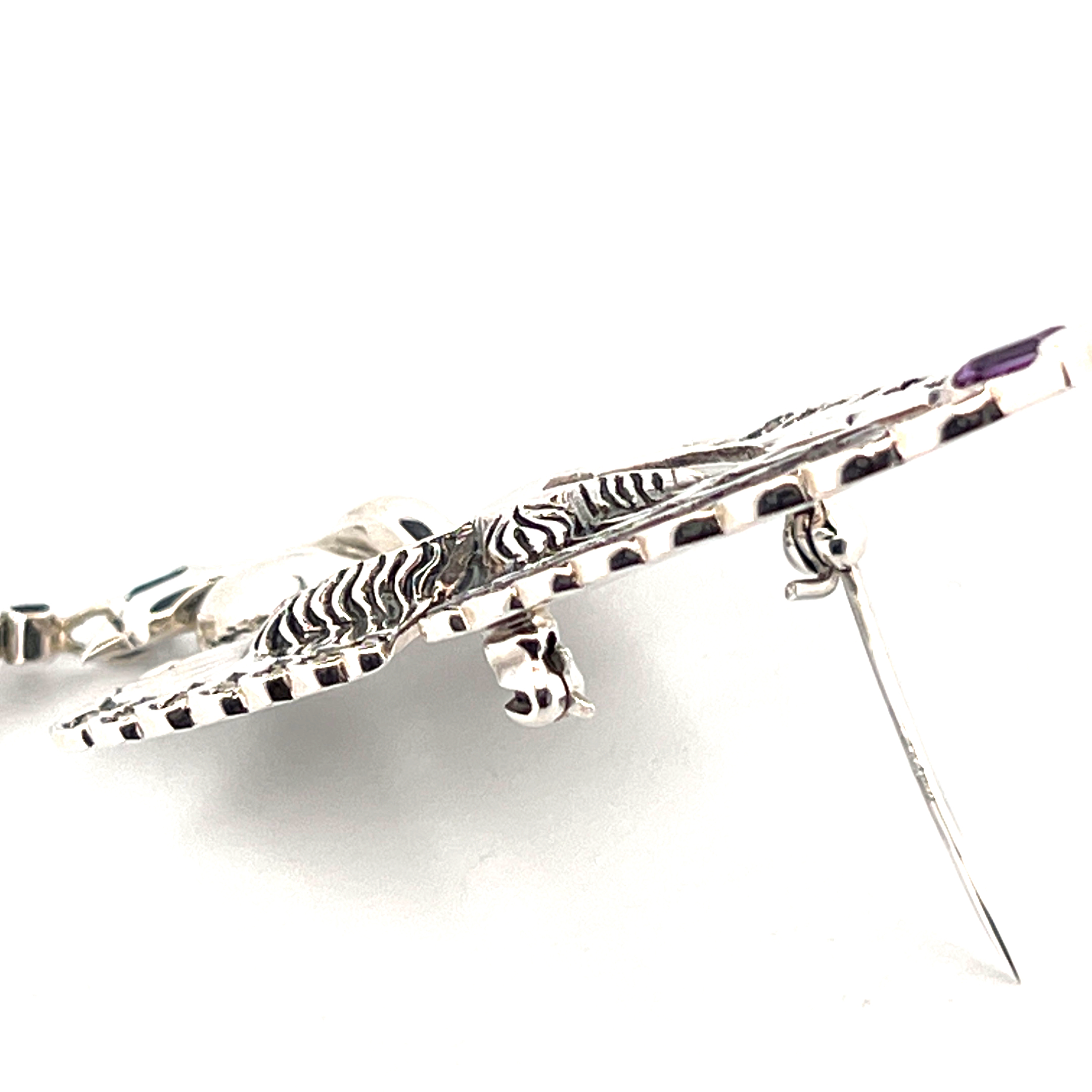 This brooch is handcrafted in sterling silver using traditional jewellery-making techniques. The gemstones and marcasite stones are carefully set to follow the contours of the design, while the cultured pearl drop is precisely attached. The piece is hand finished and polished to highlight the intricate detail and refined surface.