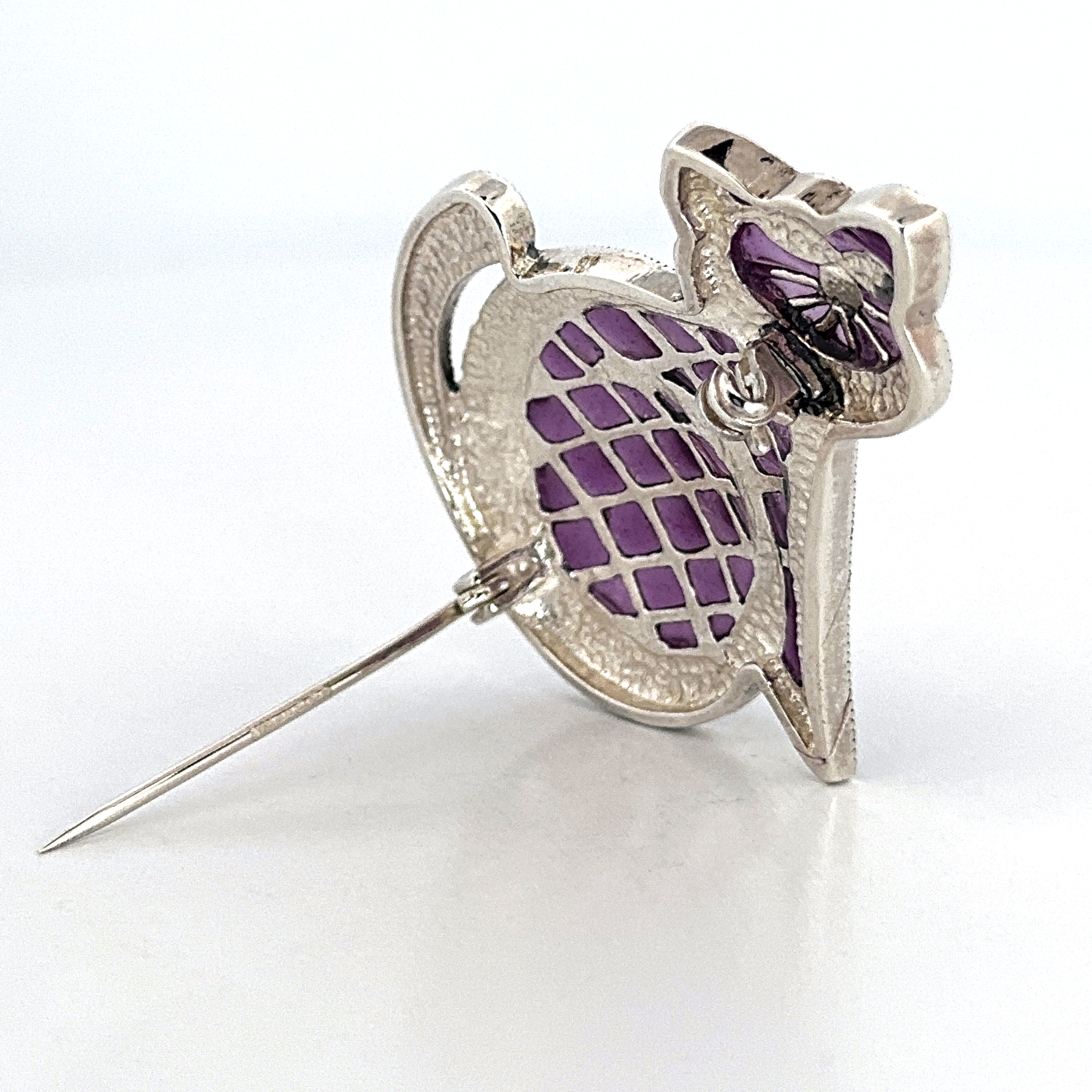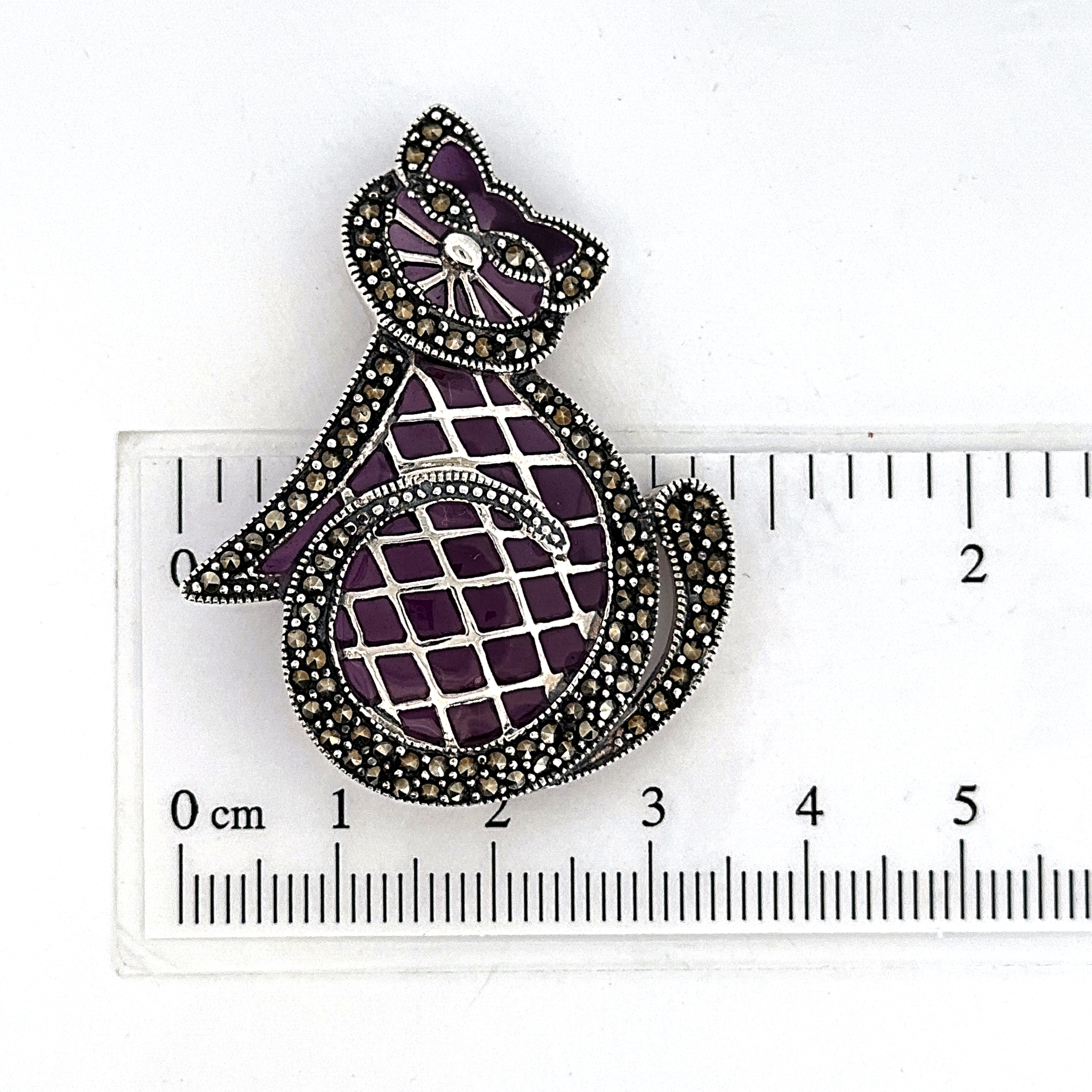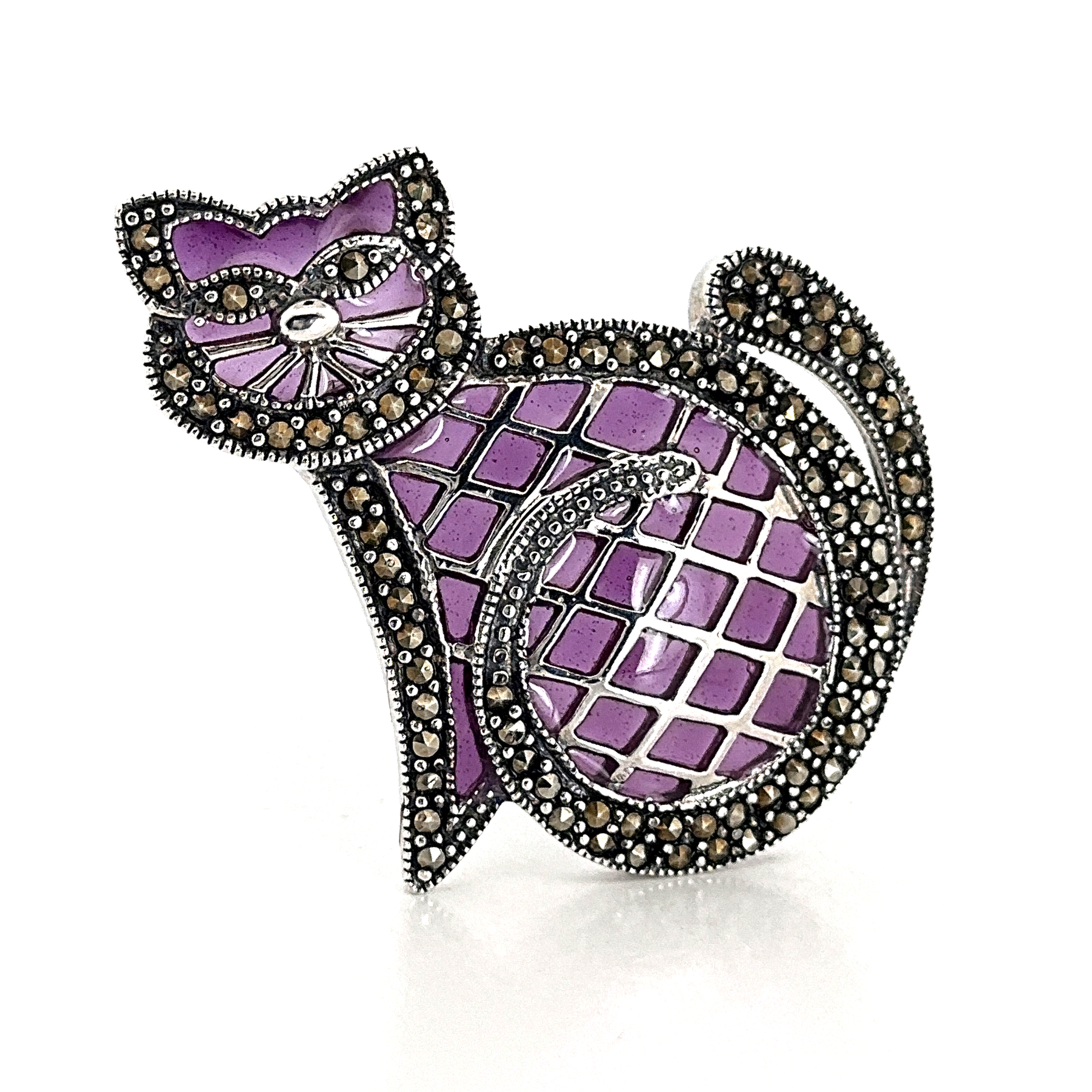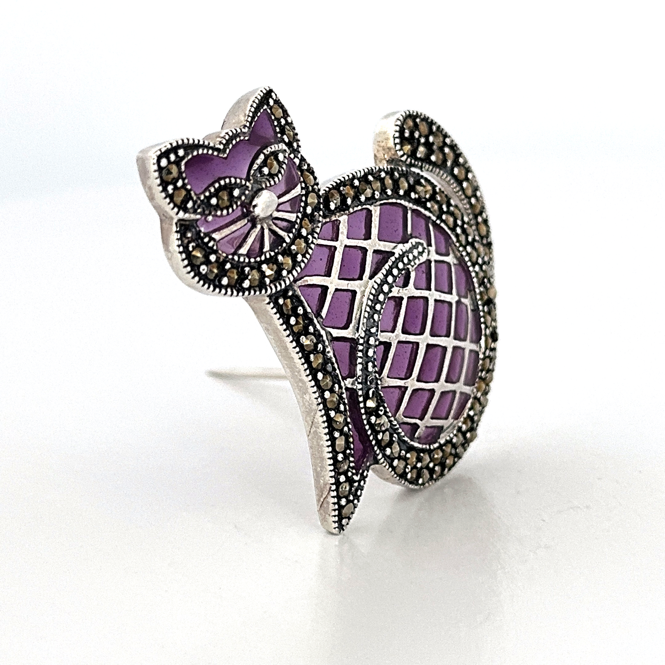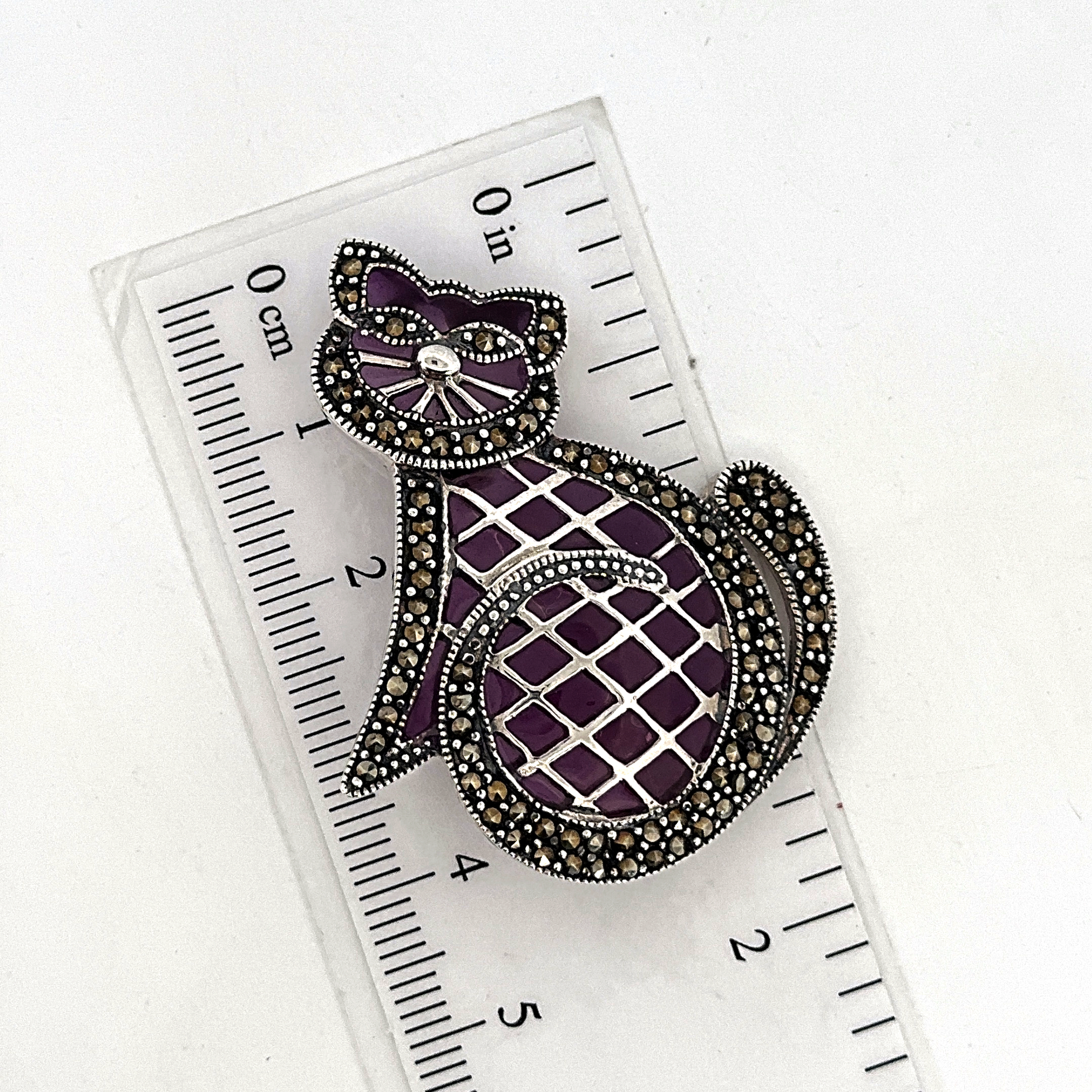 This cat brooch is designed in the structured manner of Art Deco styling, presenting a stylised feline form with clean lines and balanced proportions. The use of purple enamel introduces depth and contrast, highlighting the contours and defining the character of the piece.