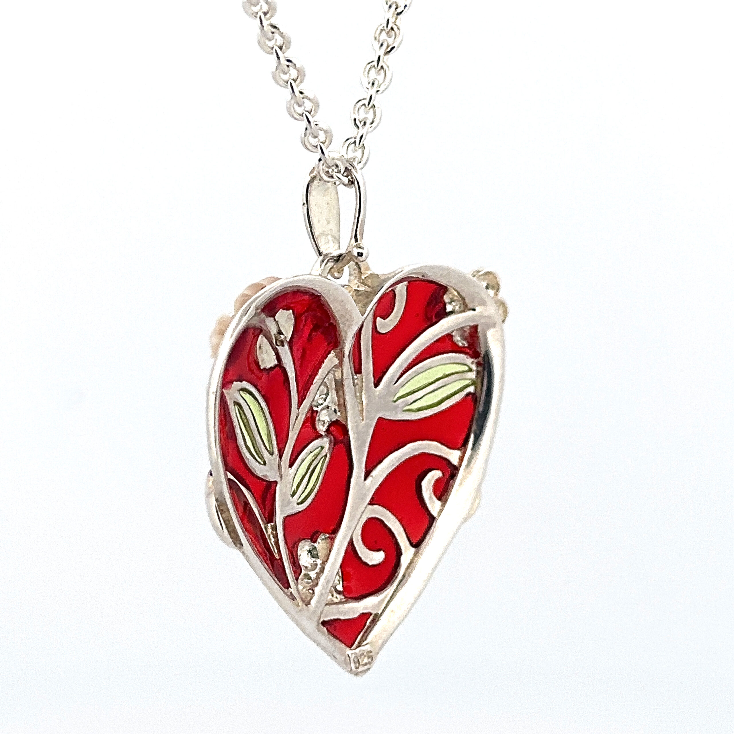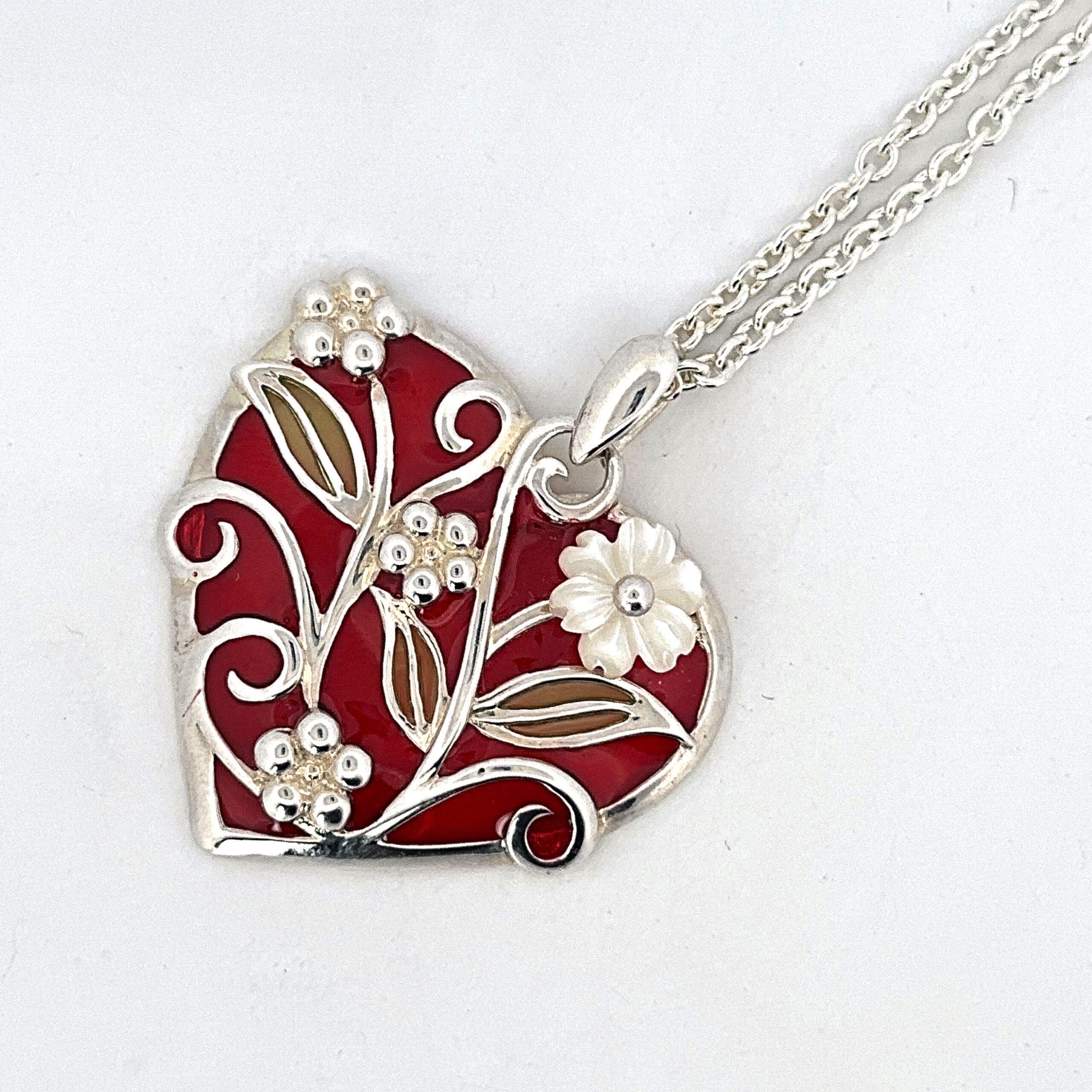 This necklace is designed around a heart shaped pendant with a floral motif, combining soft curves with decorative surface detail. The form is balanced to sit comfortably at the neckline while allowing the design to remain clearly defined.