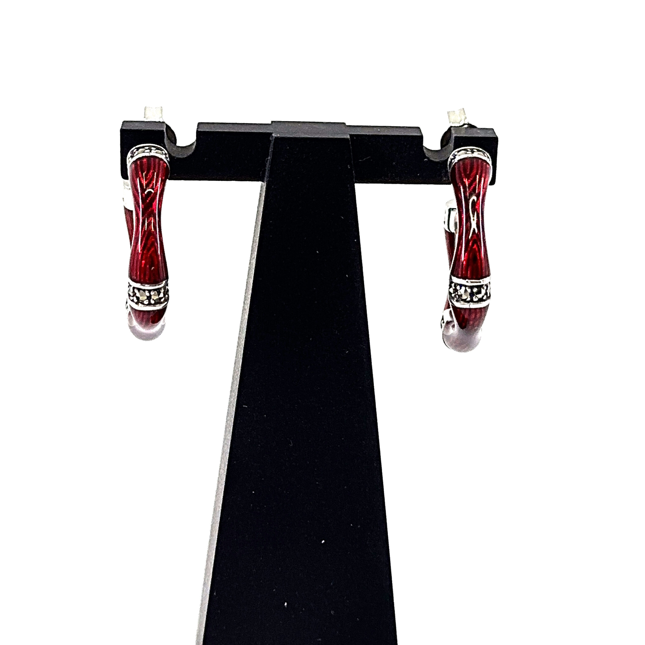 Red enamel introduces a vivid contrast across the segmented sections, while marcasite adds texture and definition. The combination of materials enhances the depth of the design while maintaining a clear and structured appearance.