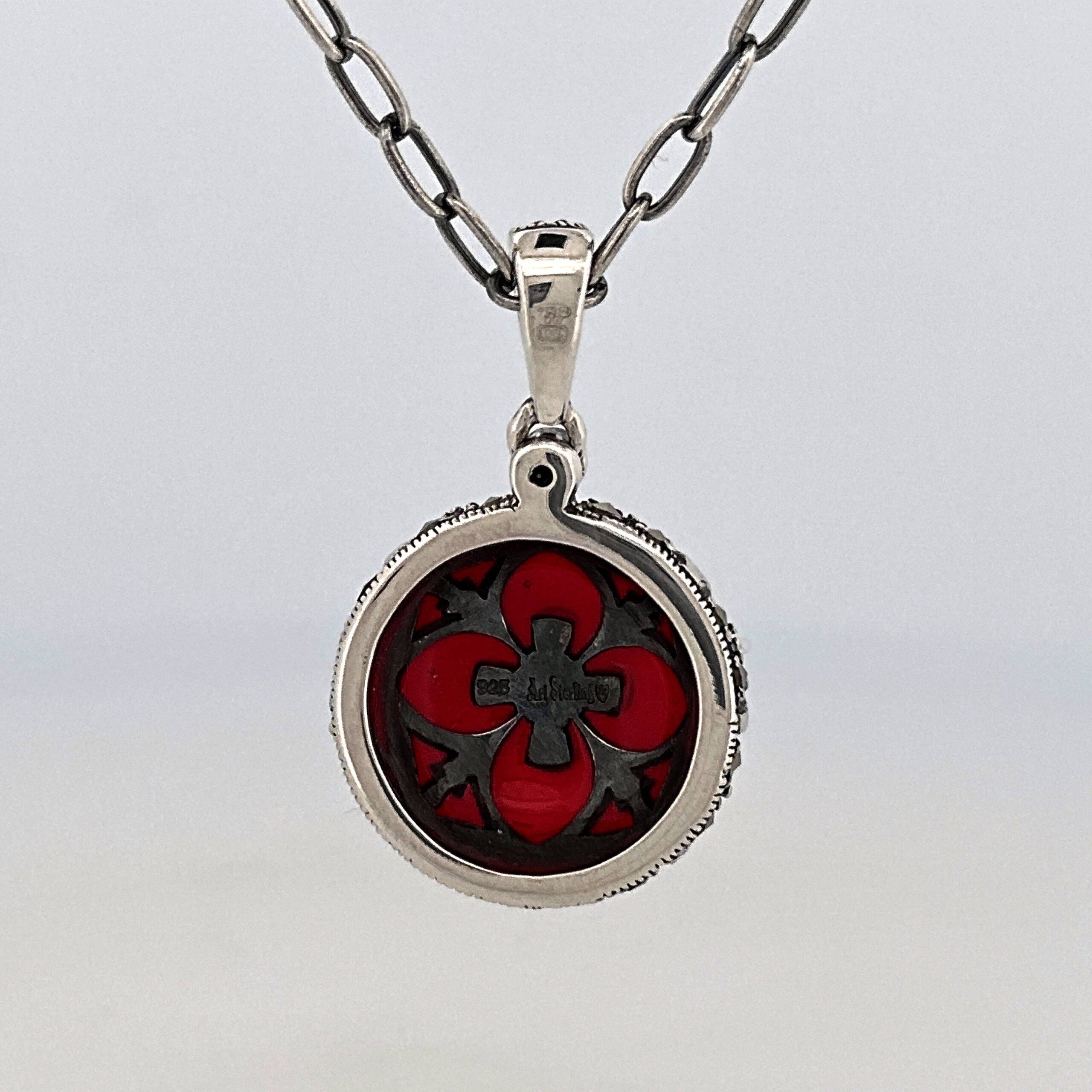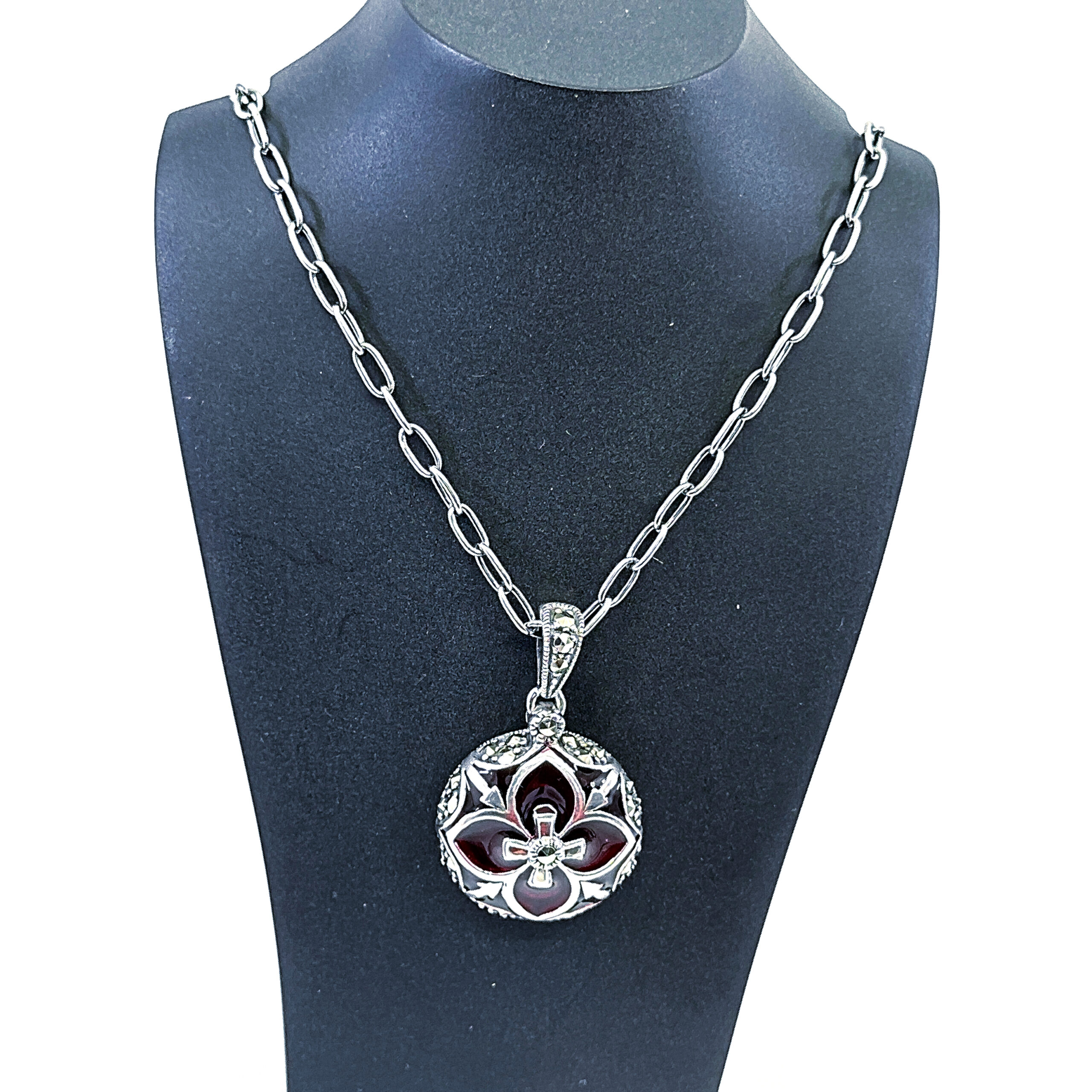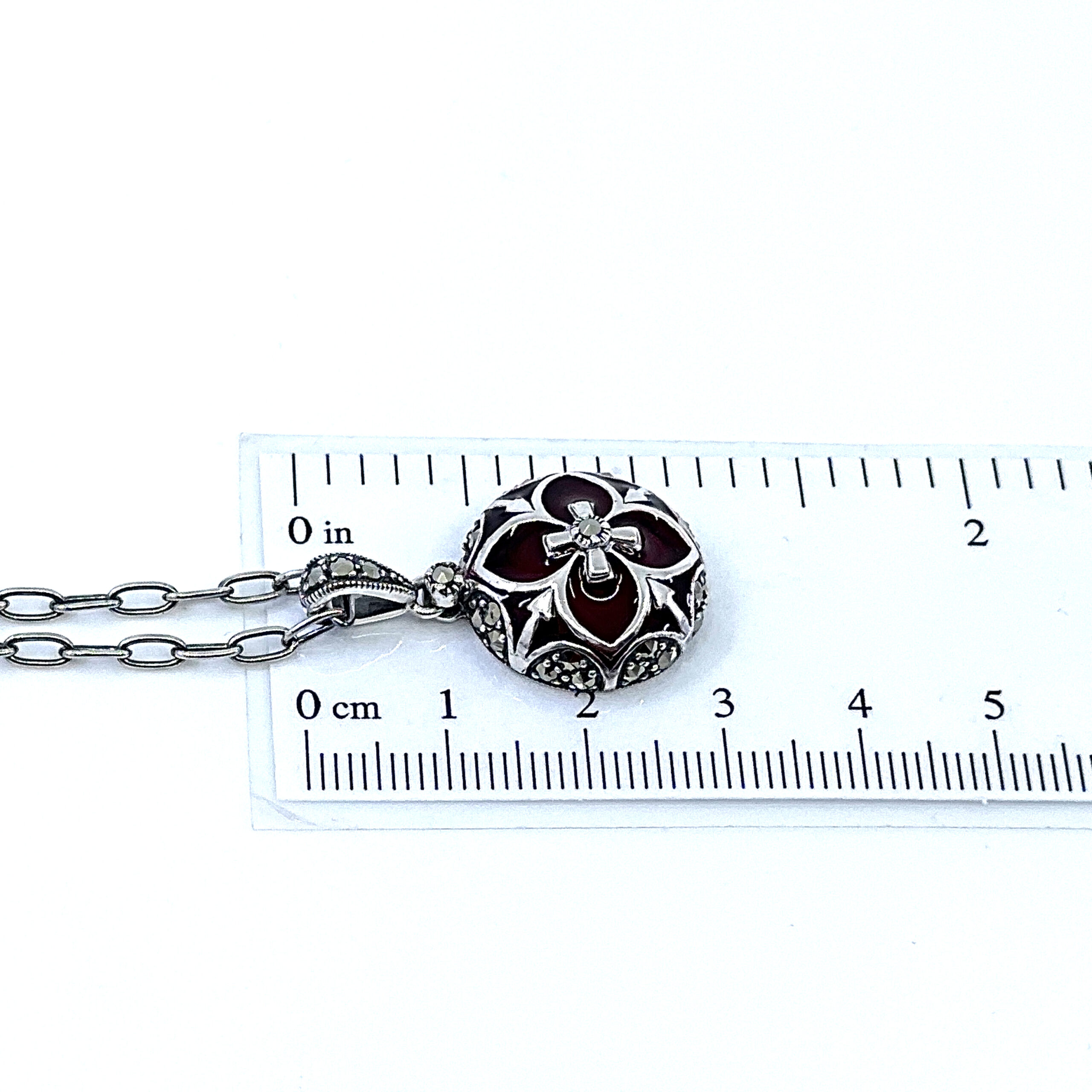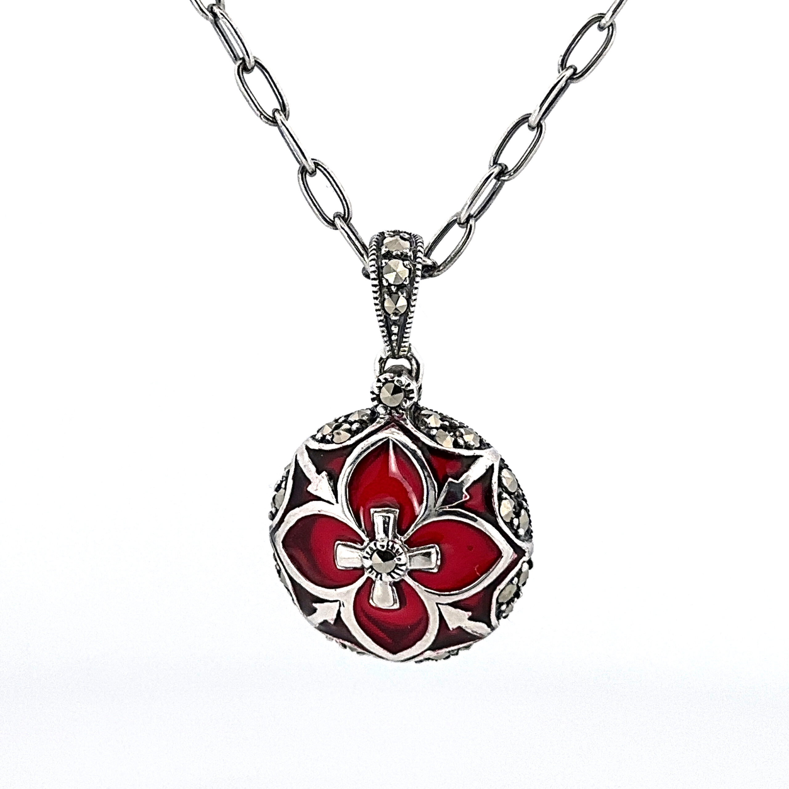 An Elizabethan style necklace handcrafted in hallmarked sterling silver, featuring a red enamel pendant with marcasite detailing and suspended from an adjustable decorative chain.