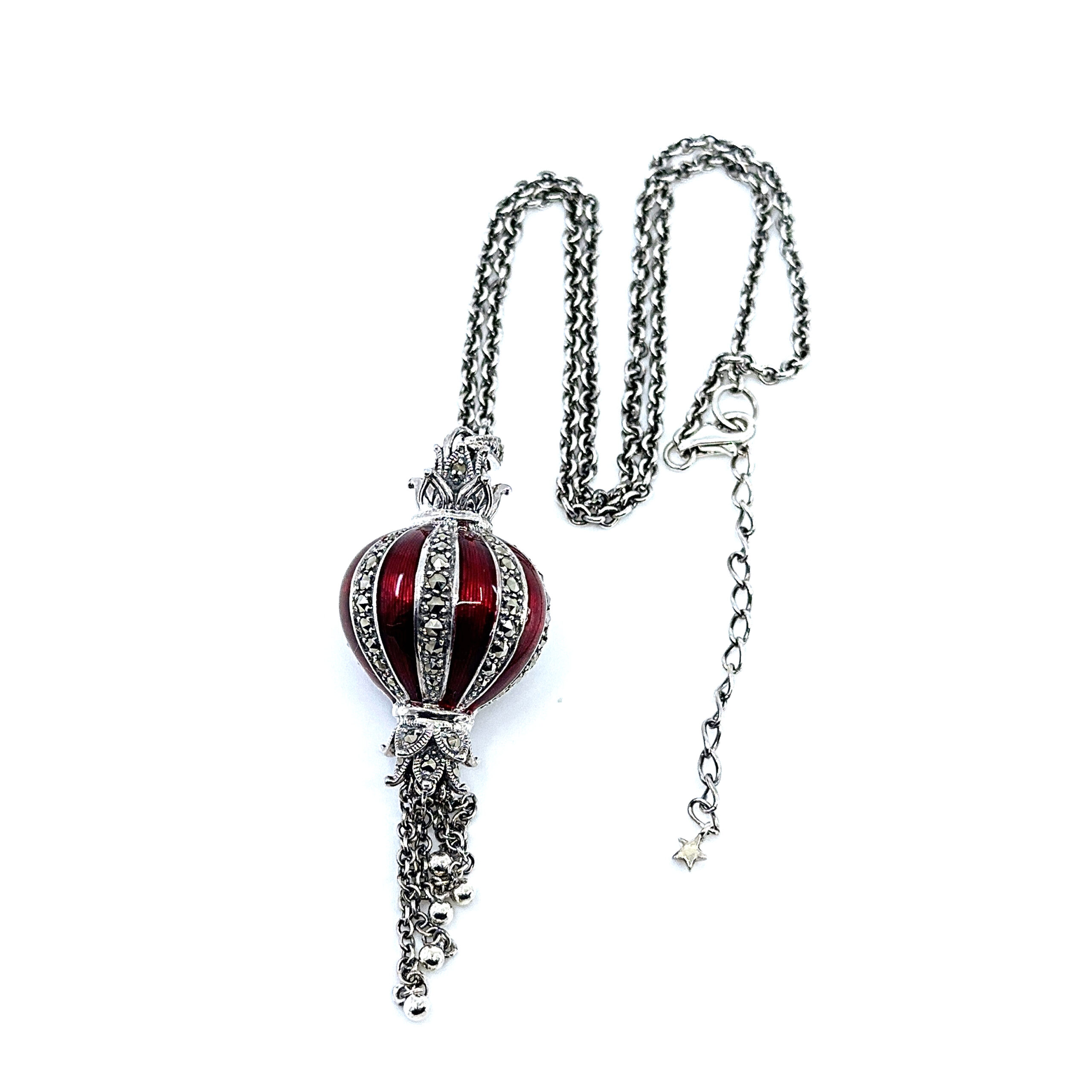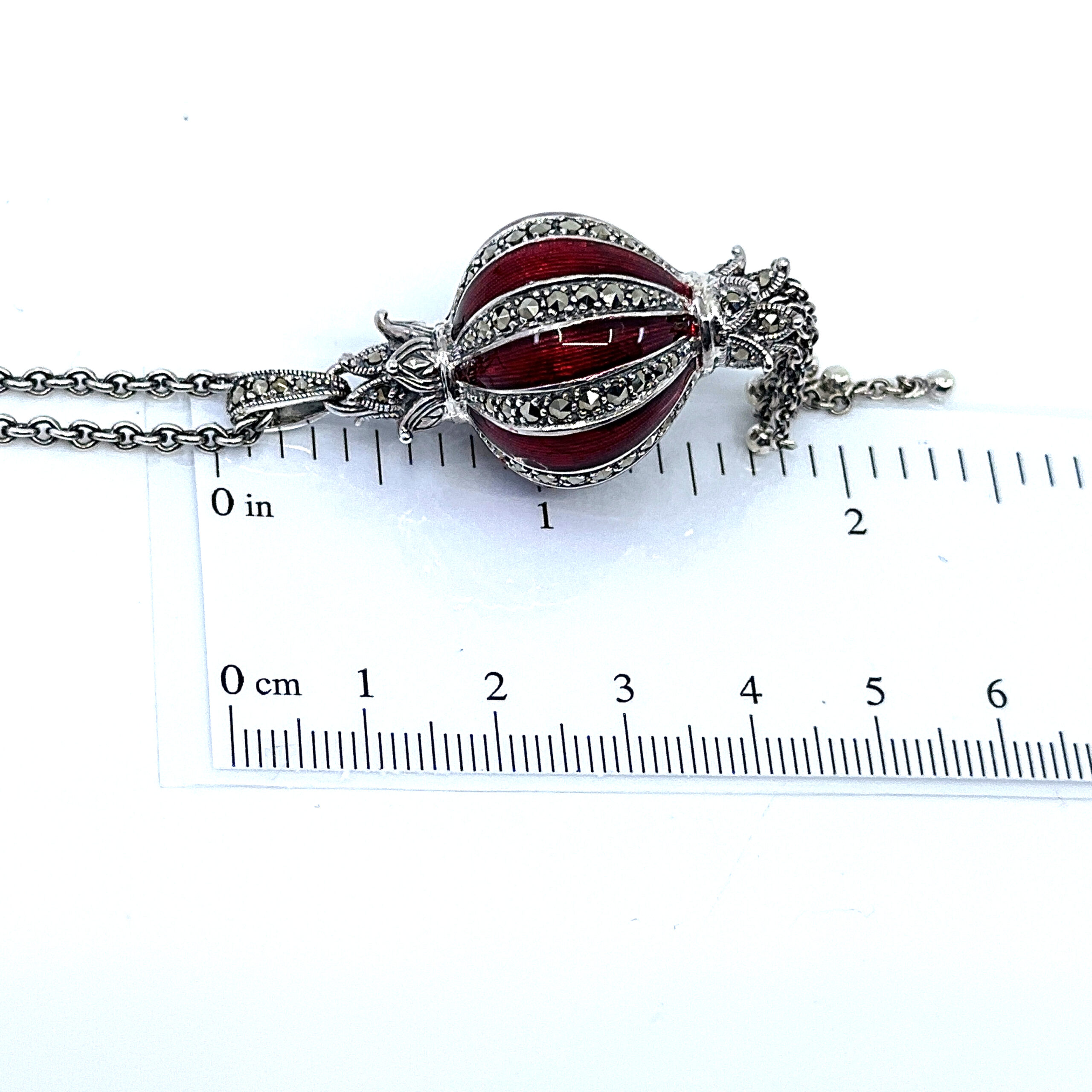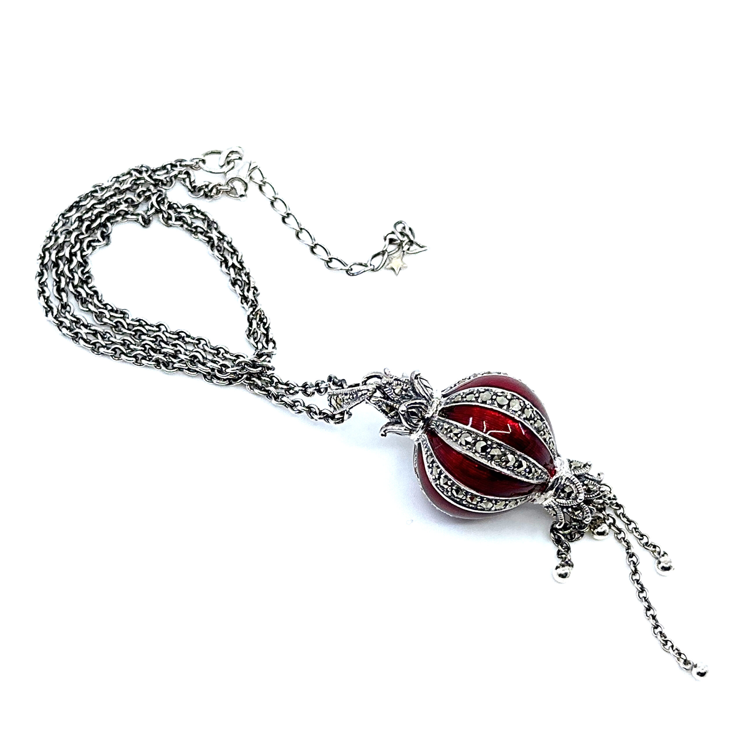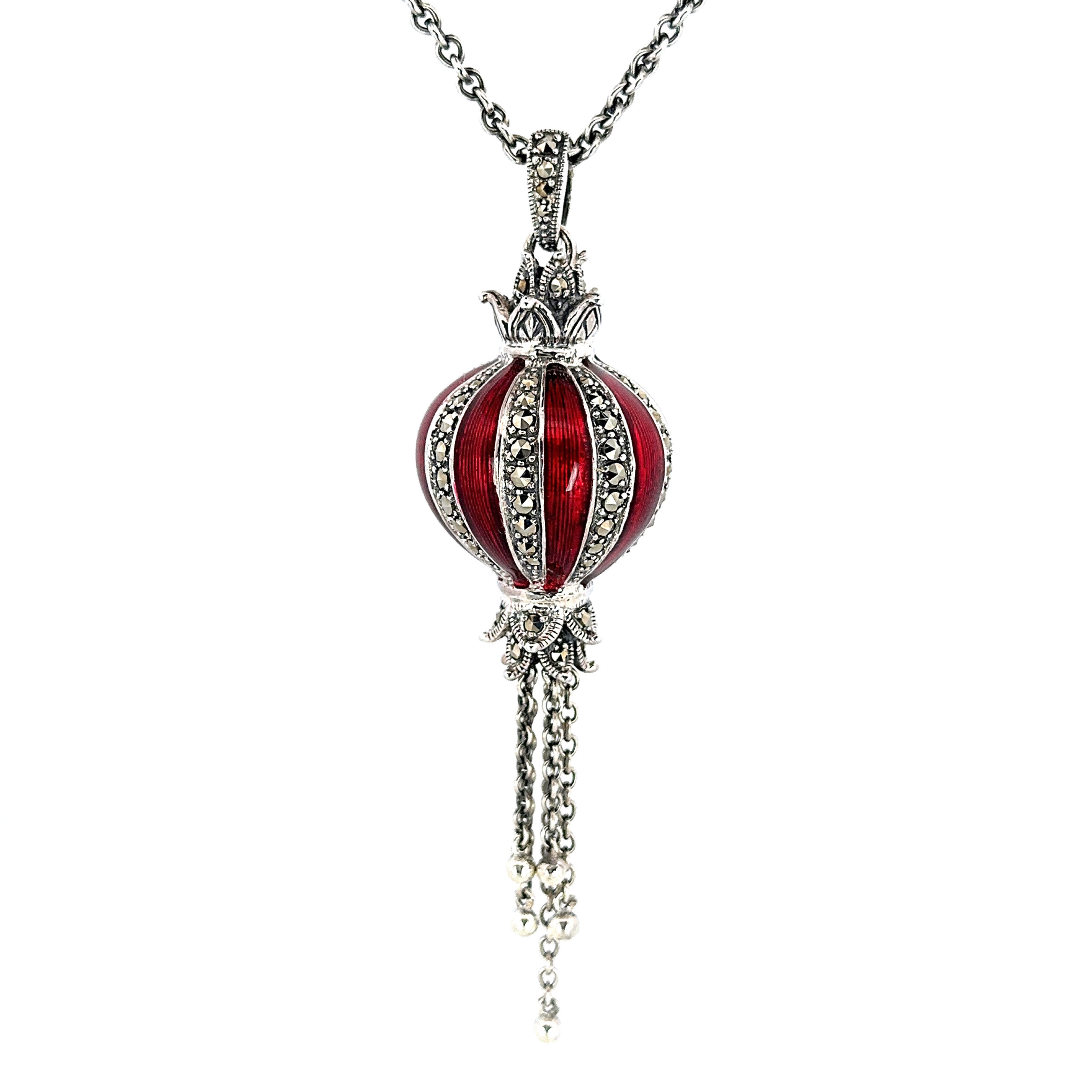 Red enamel detailing is combined with marcasite accents to add contrast and surface interest. The result is a distinctive design that balances colour, structure, and period influence without excessive ornamentation.