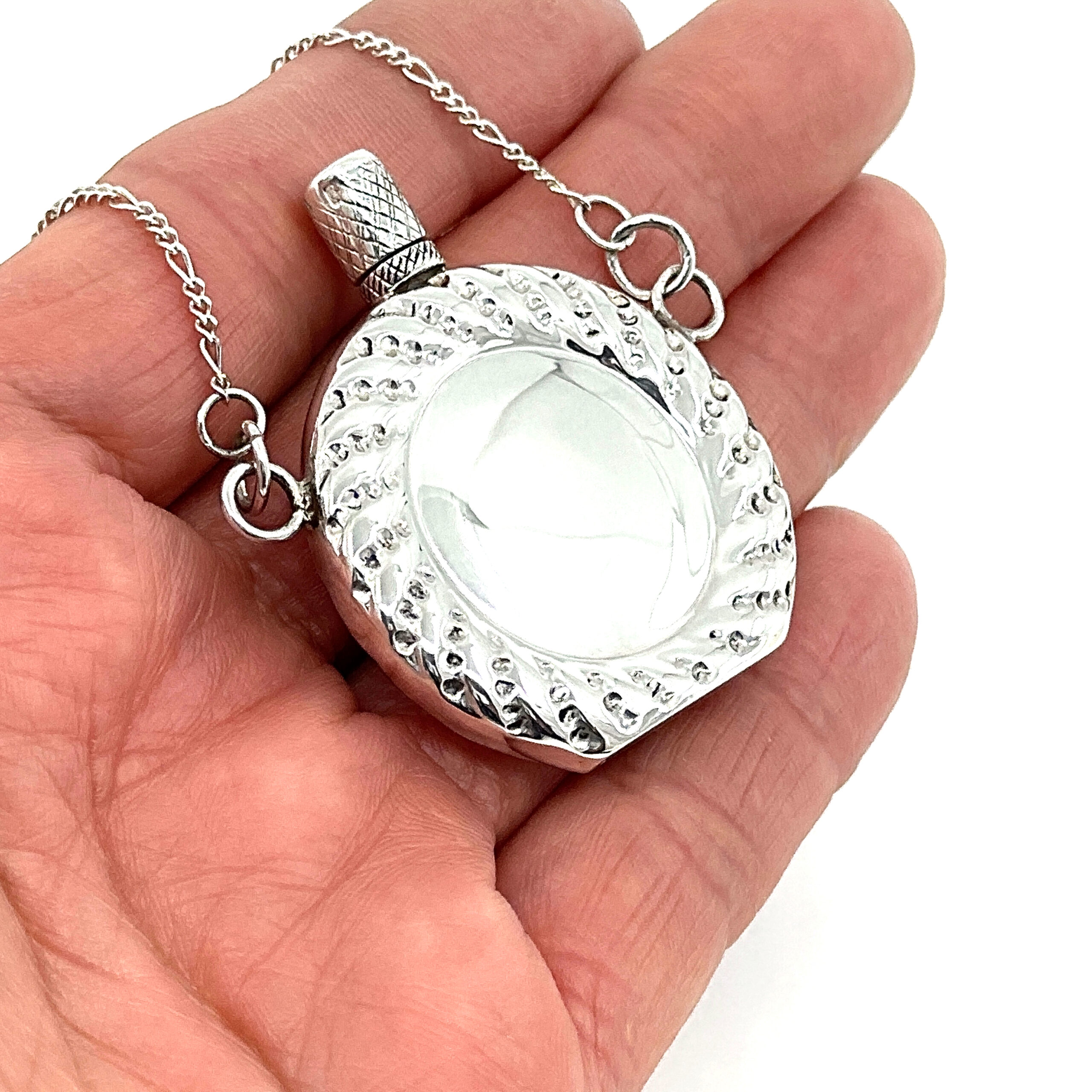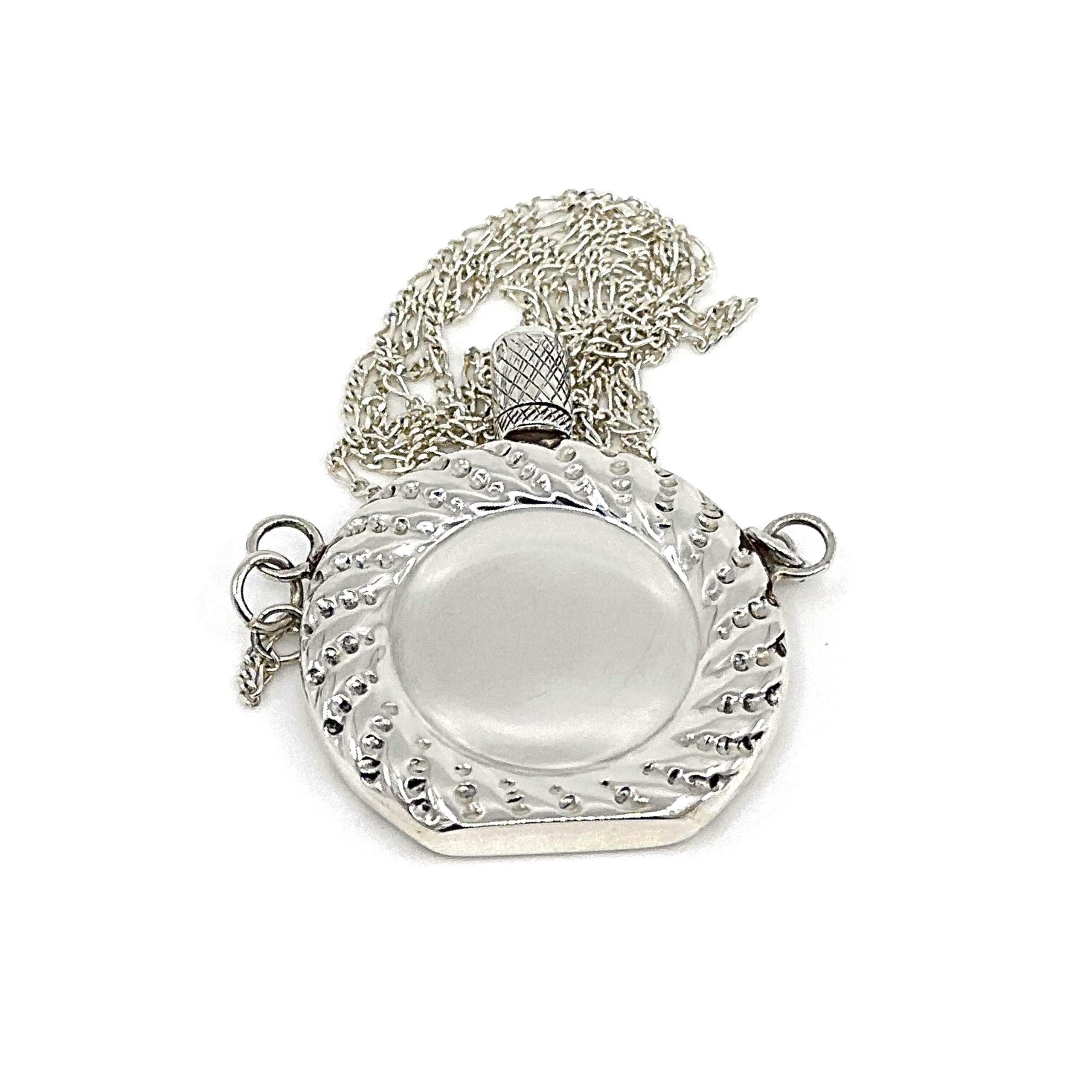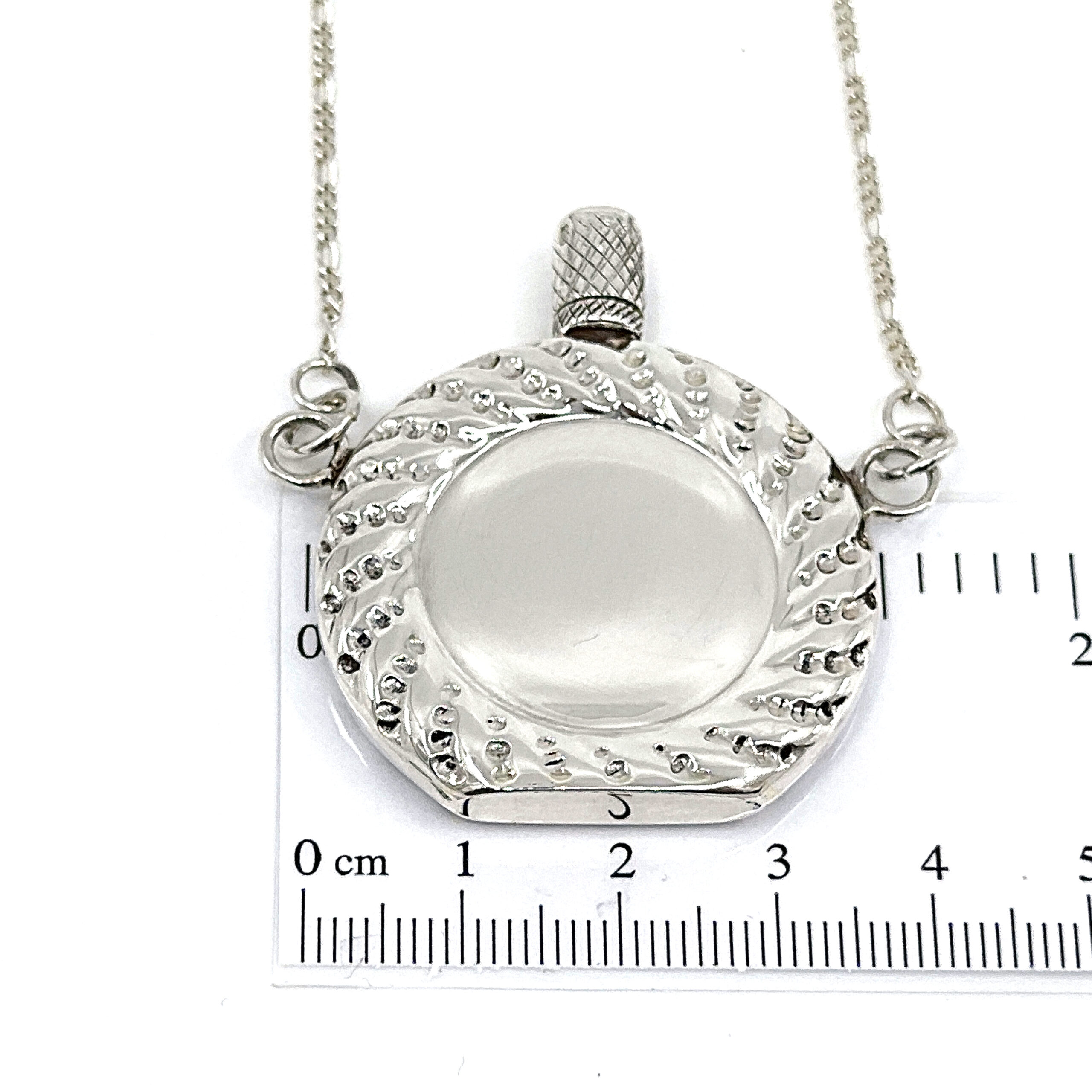 This rope design perfume bottle pendant draws inspiration from Victorian scent containers, combining decorative detail with practical function. The elongated form is framed with a rope-style border that adds depth and character to the surface, while the bottle opens to hold a small quantity of fragrance. Suspended from a trace chain, the pendant sits comfortably when worn.