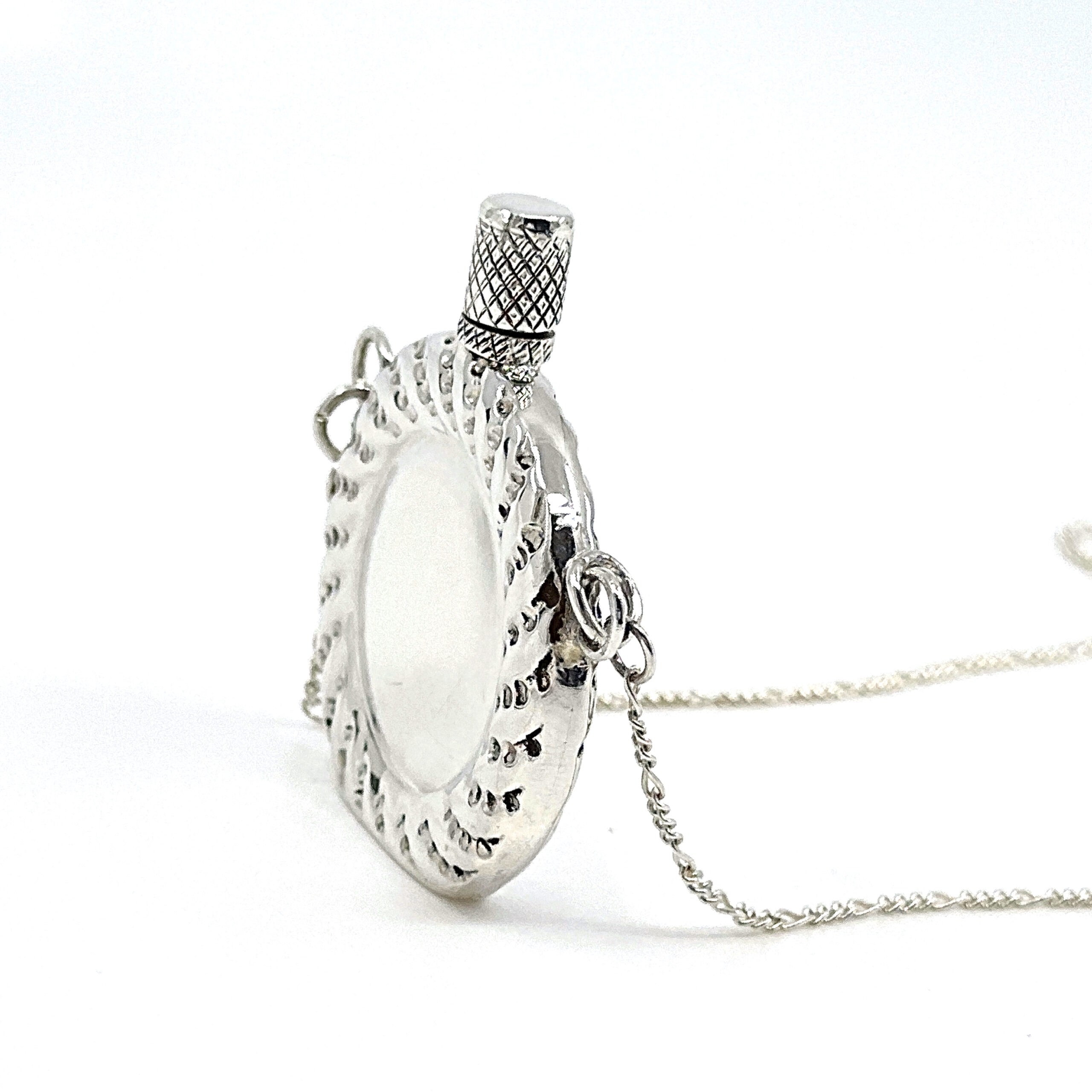 A Victorian style rope design perfume bottle pendant supplied with filling funnel, suspended from a trace chain and finished in 925 English Hallmarked Sterling Silver.