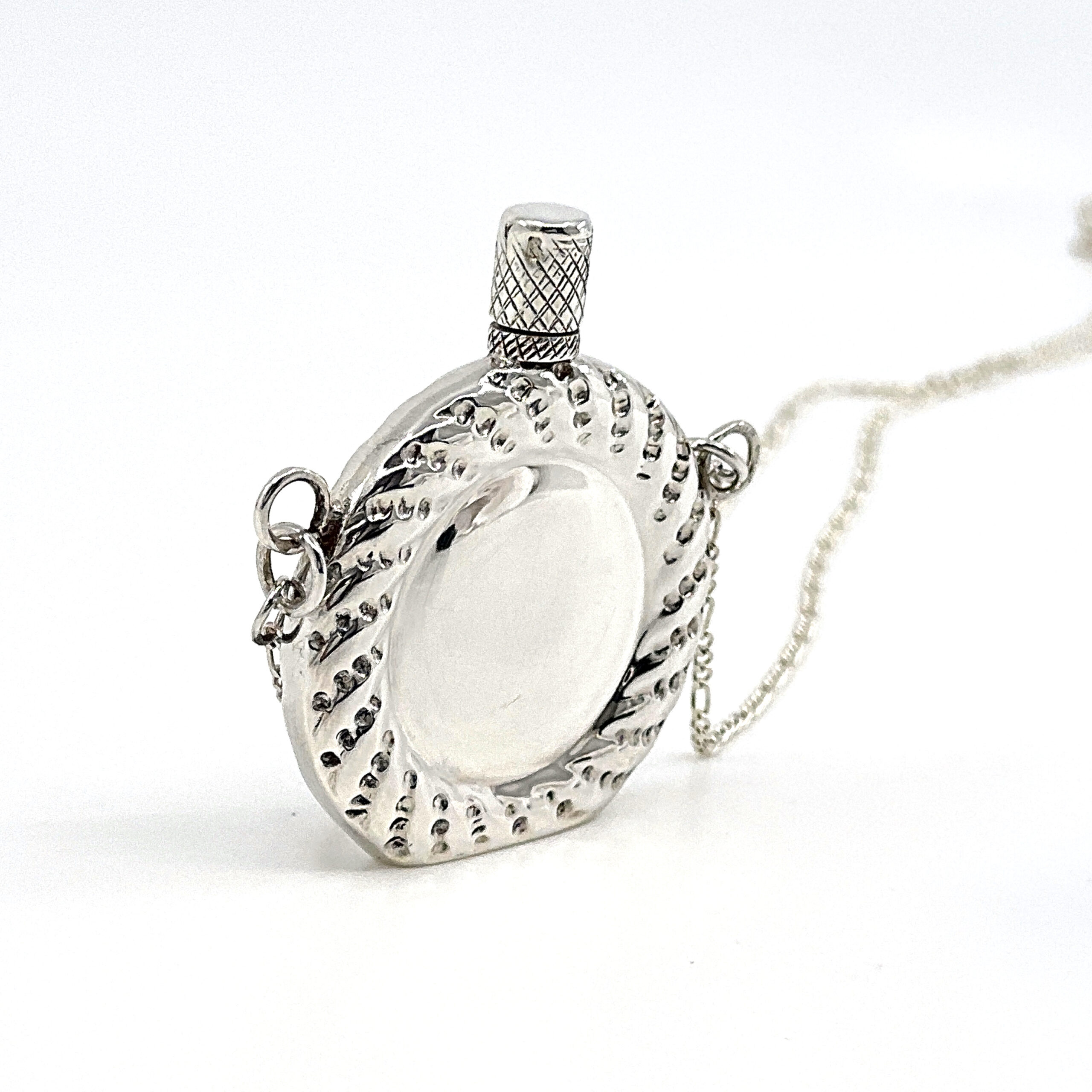 Handcrafted in sterling silver, the perfume bottle is carefully constructed to ensure a secure closure and durable finish. The rope detailing is precisely formed to give definition around the frame, while the surfaces are polished to highlight the contours of the design. The accompanying funnel is proportioned for accurate filling, and the trace chain complements the scale of the pendant.