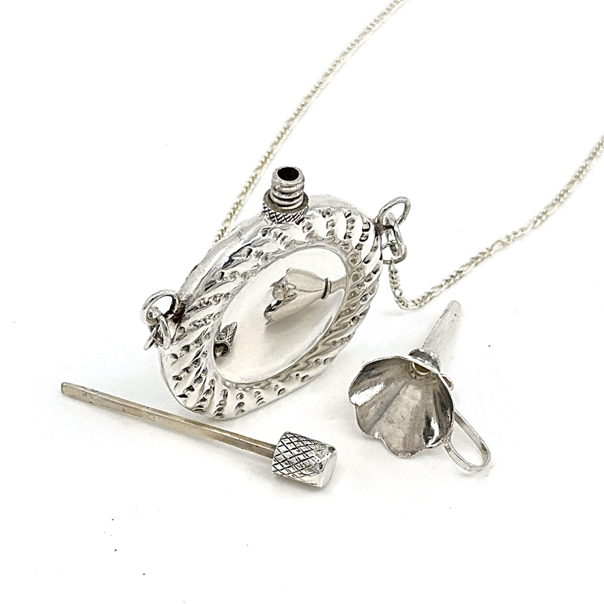 The design is accompanied by a small funnel to allow the bottle to be filled with ease. Perfume bottle pendants were historically worn as discreet scent holders, blending personal ritual with decorative jewellery in a refined and enduring form.