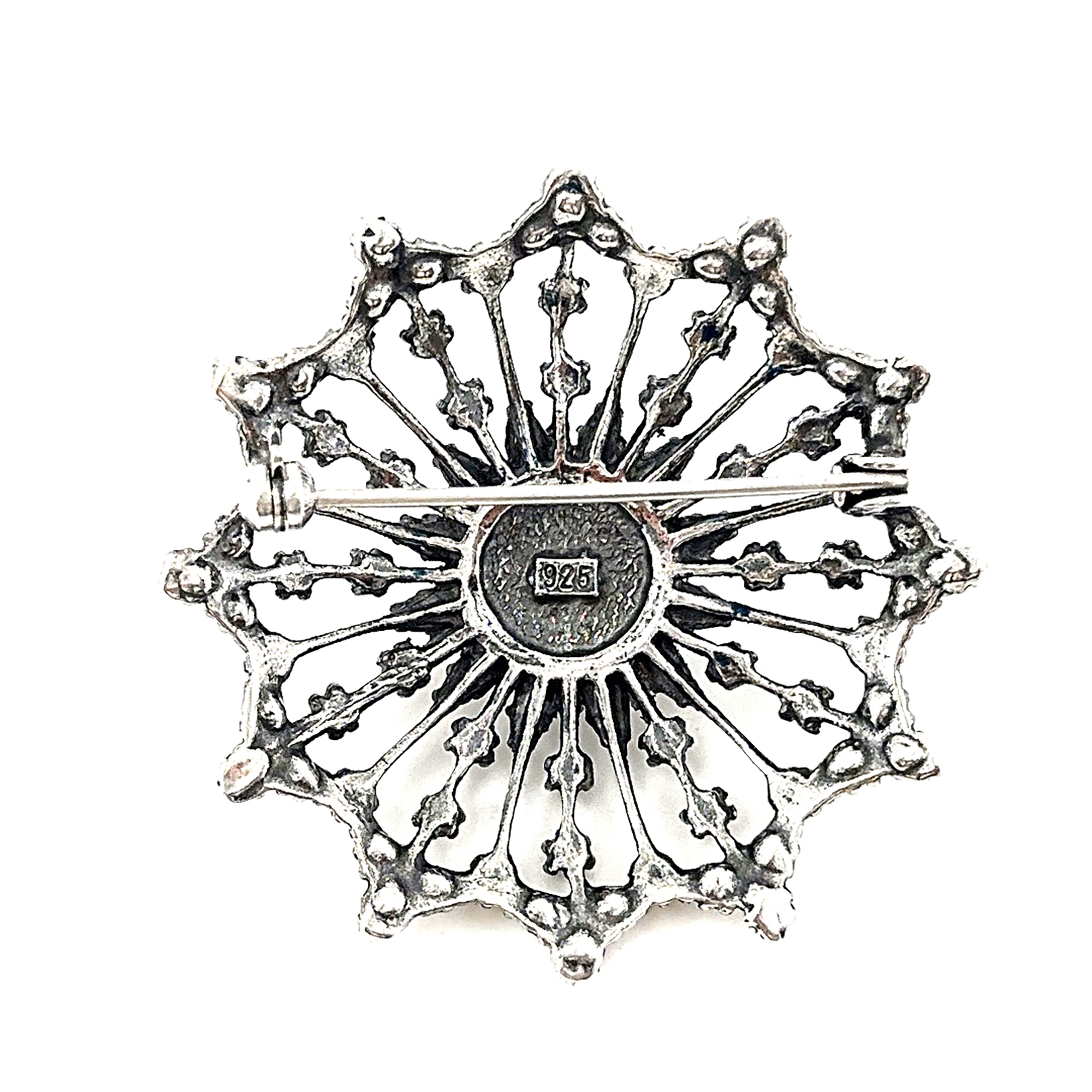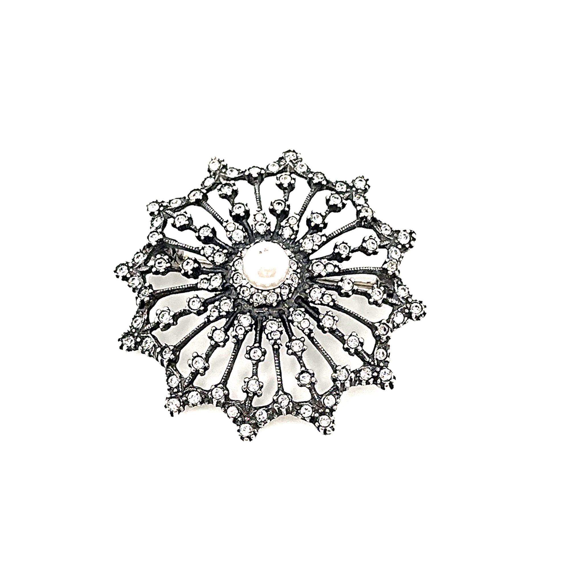 This starburst brooch is designed with a radiating openwork form, capturing the symmetry and balance of a star-inspired motif. The composition centres around a single pearl, with surrounding elements extending outward to create a structured and harmonious design.