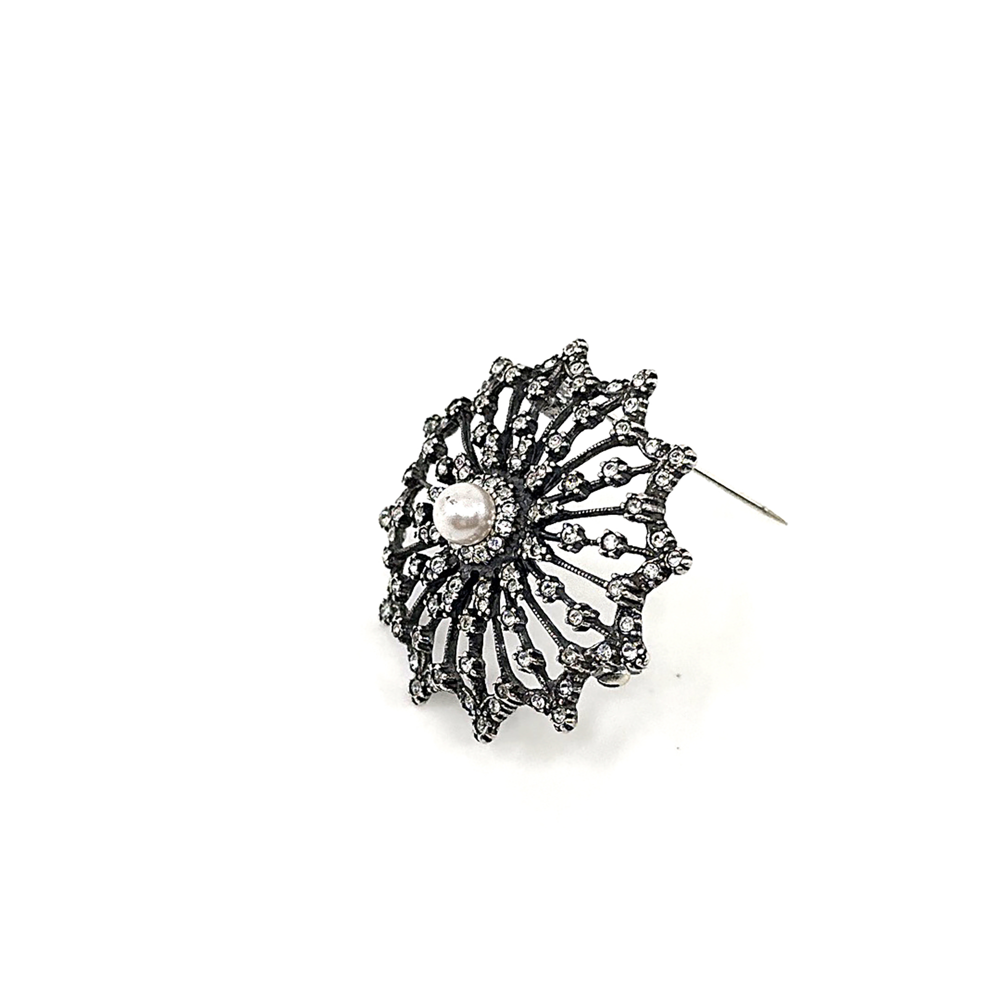 Crystals are set throughout the form, introducing a refined brilliance that enhances the geometry of the piece. The contrast between the central pearl and the surrounding sparkle creates a controlled interplay of texture and light, giving the brooch a clear and distinctive presence.