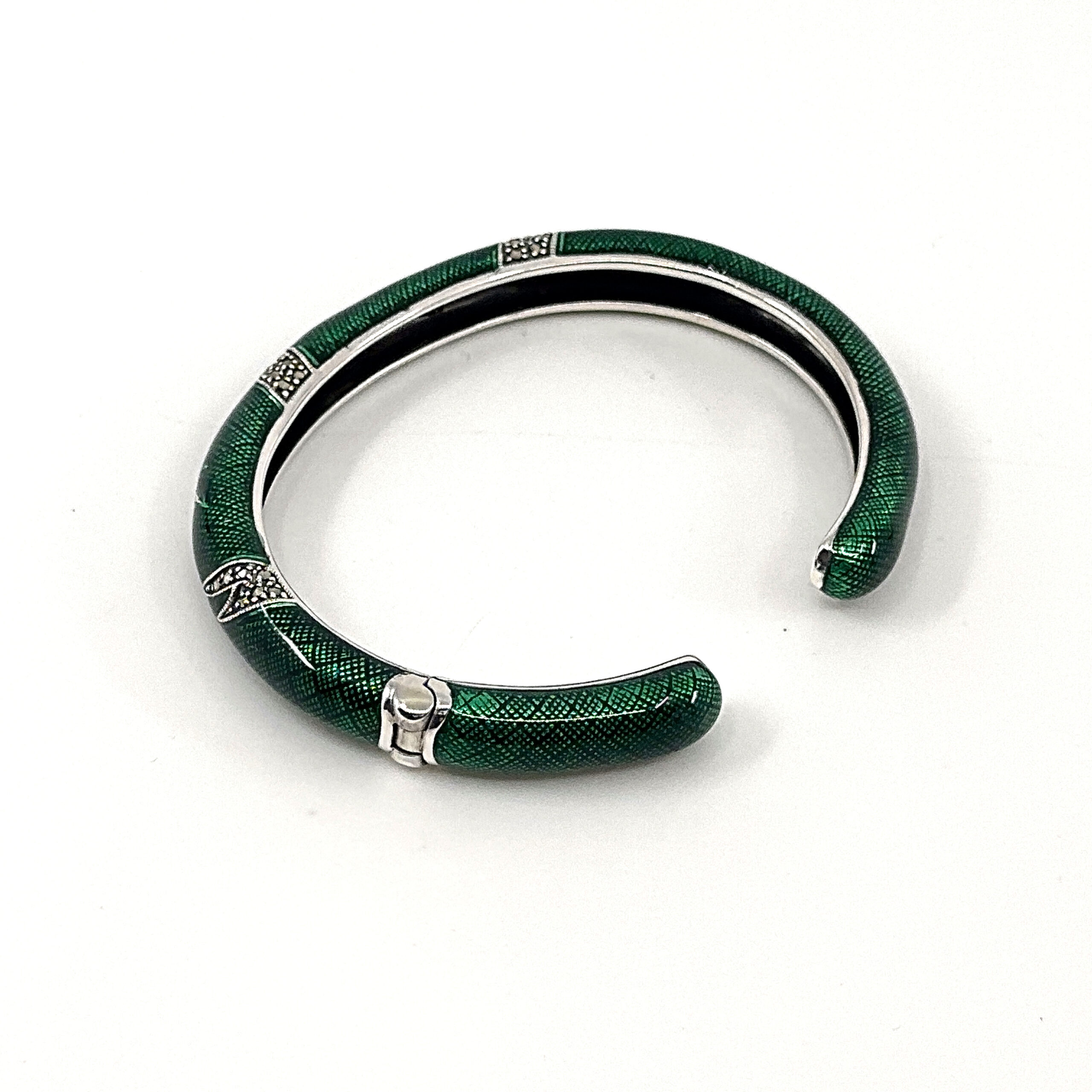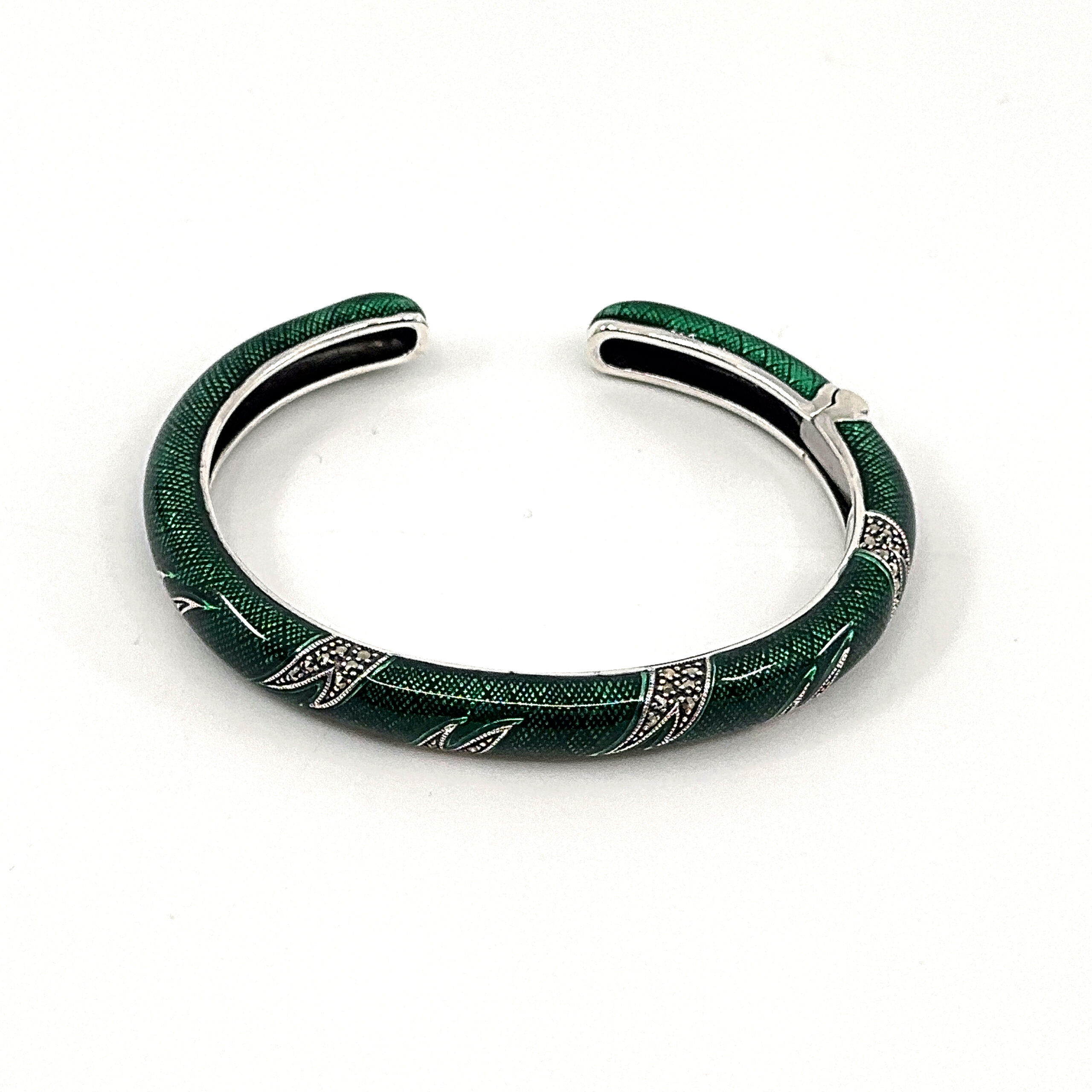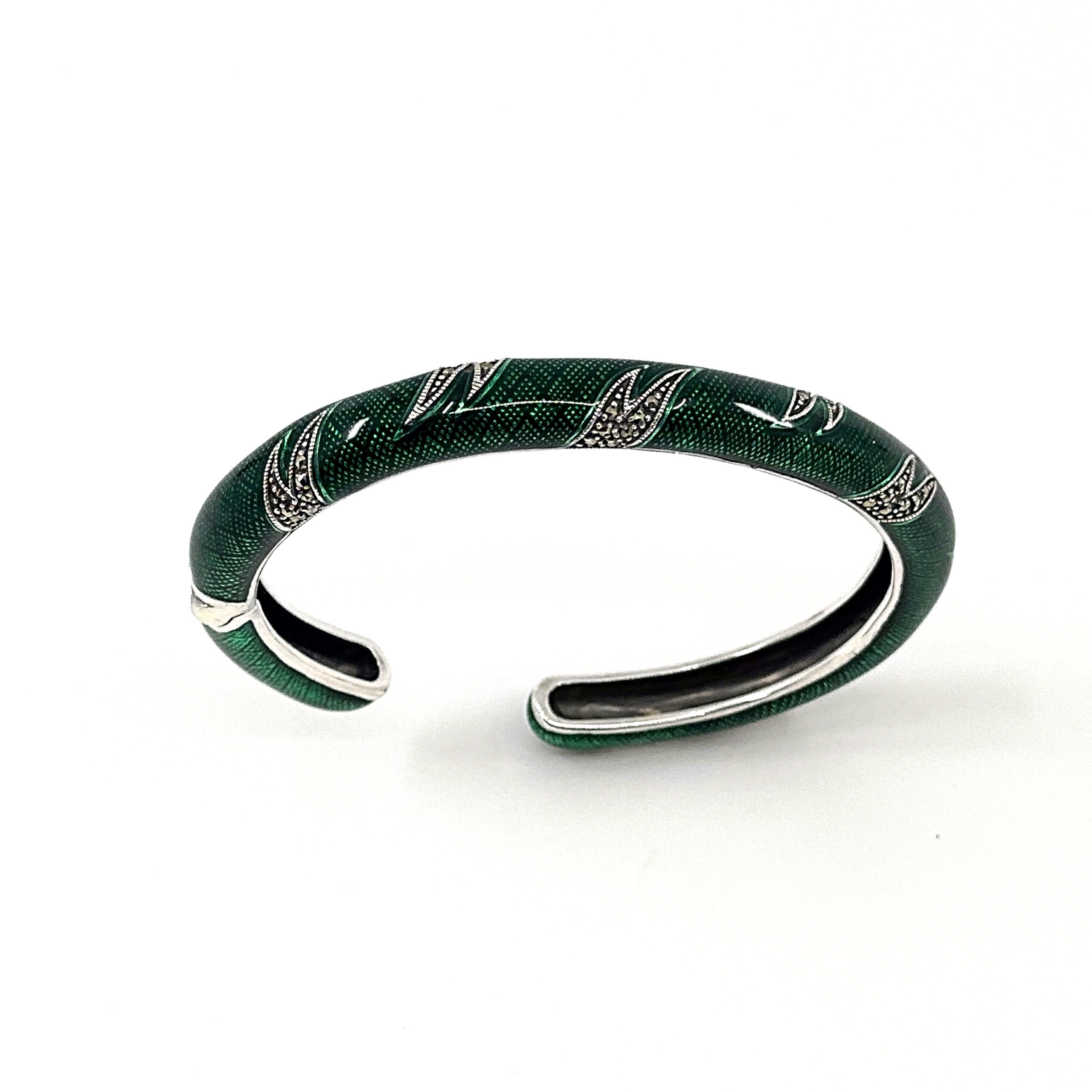 This cuff bangle is designed with a structured circular form, enhanced with green enamel and marcasite to create contrast and visual depth. The composition balances smooth surfaces with detailed accents, resulting in a clear and refined decorative piece.