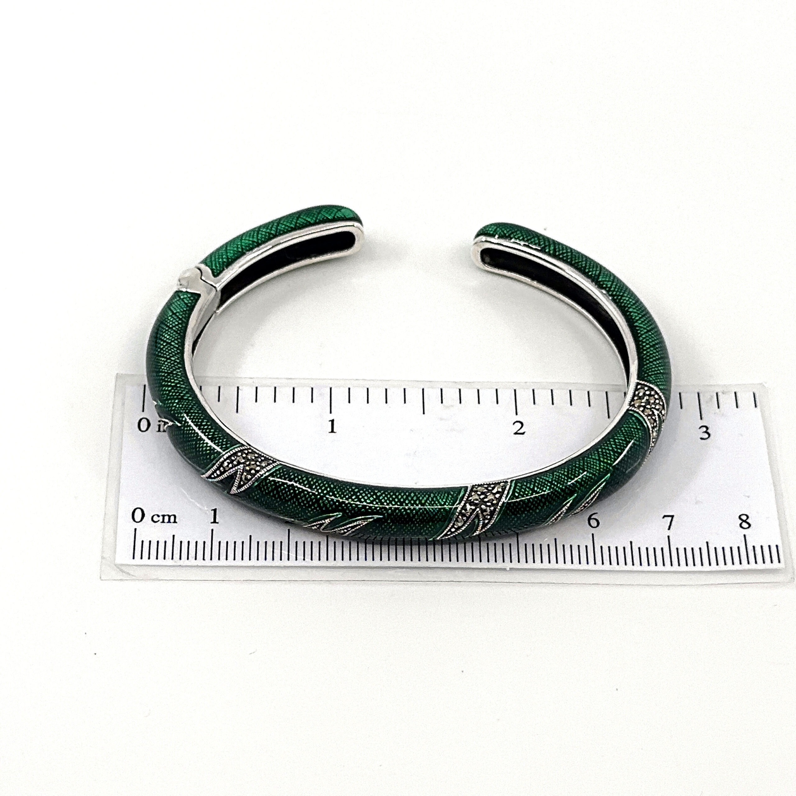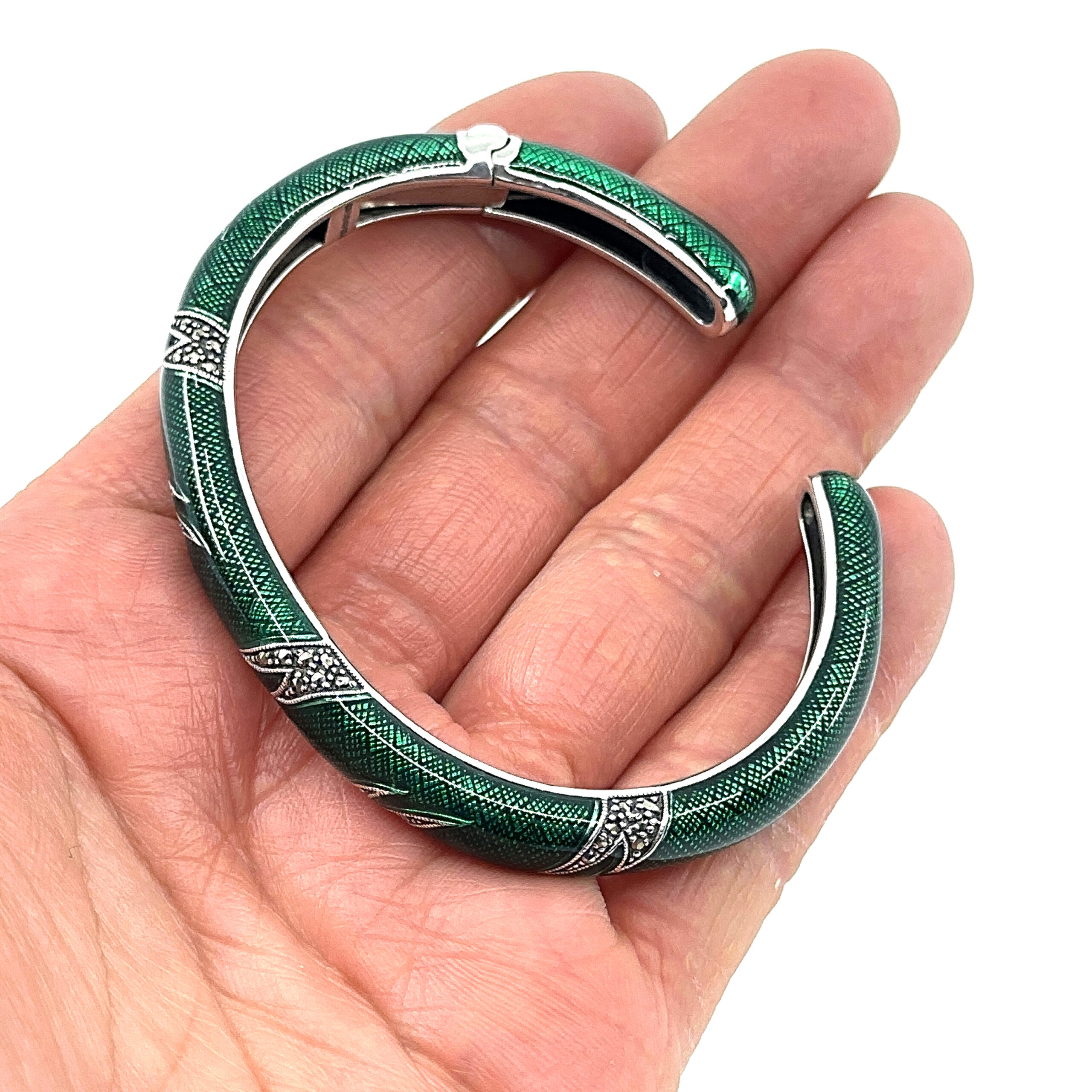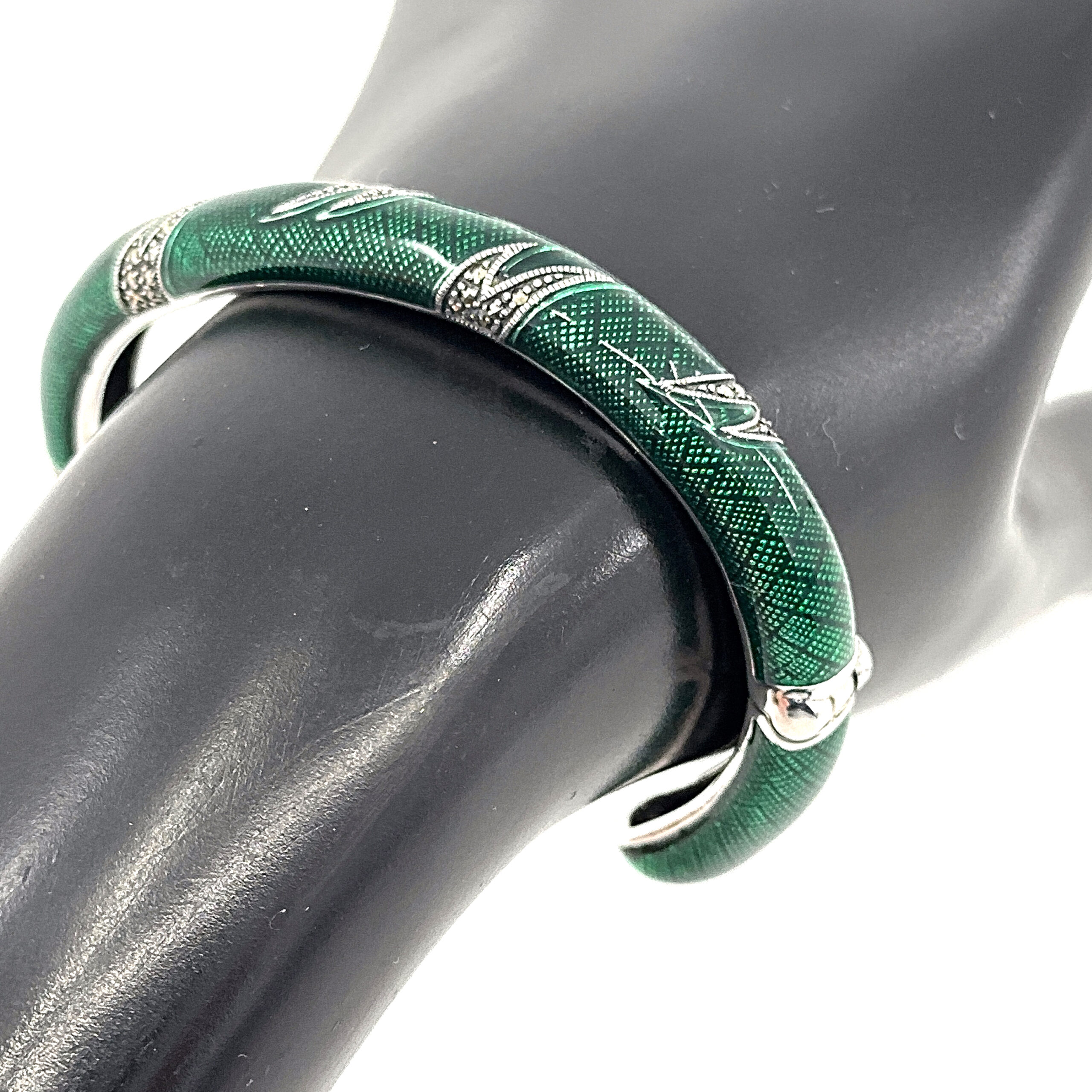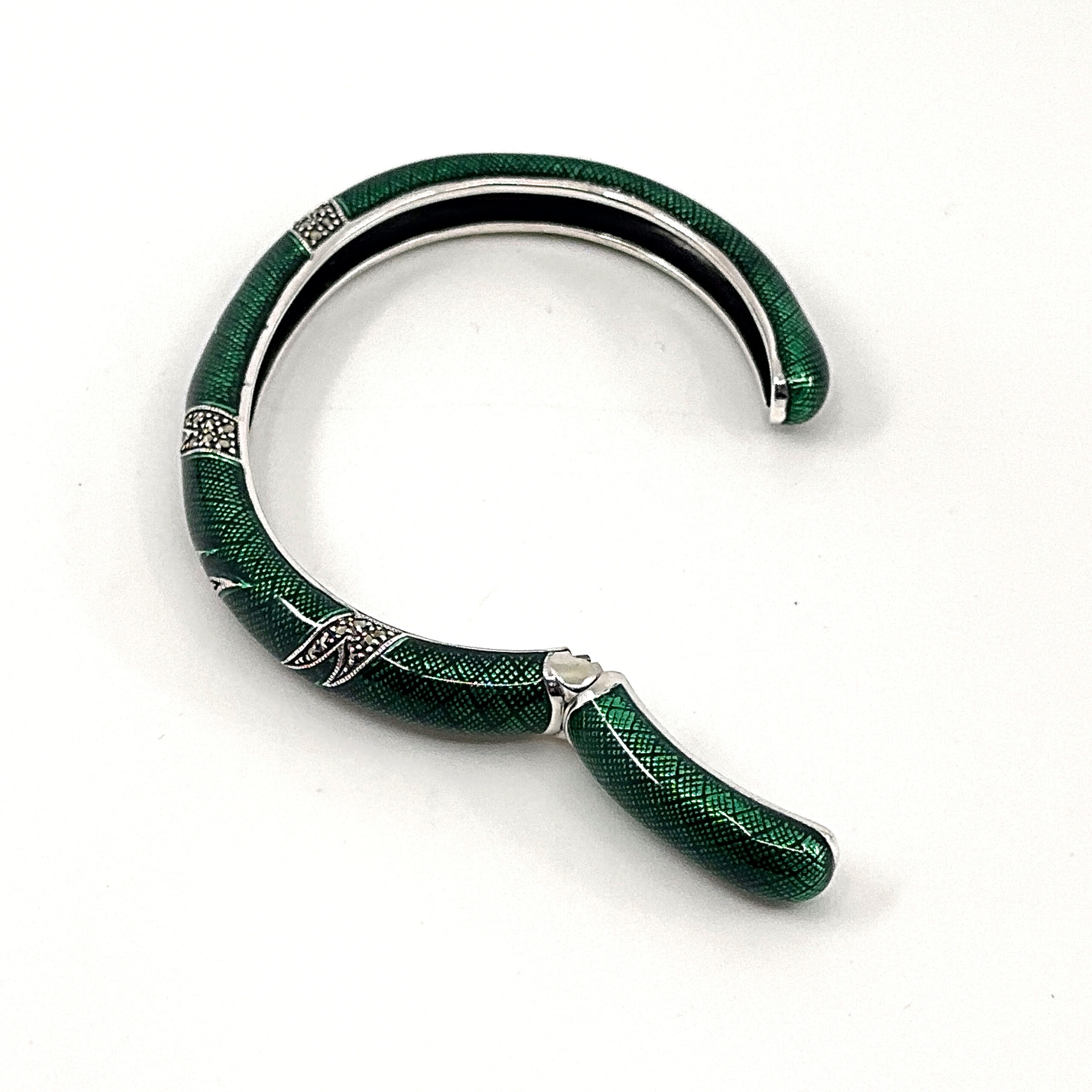 This cuff bangle is designed with a structured circular form, enhanced with green enamel and marcasite to create contrast and visual depth. The composition balances smooth surfaces with detailed accents, resulting in a clear and refined decorative piece.