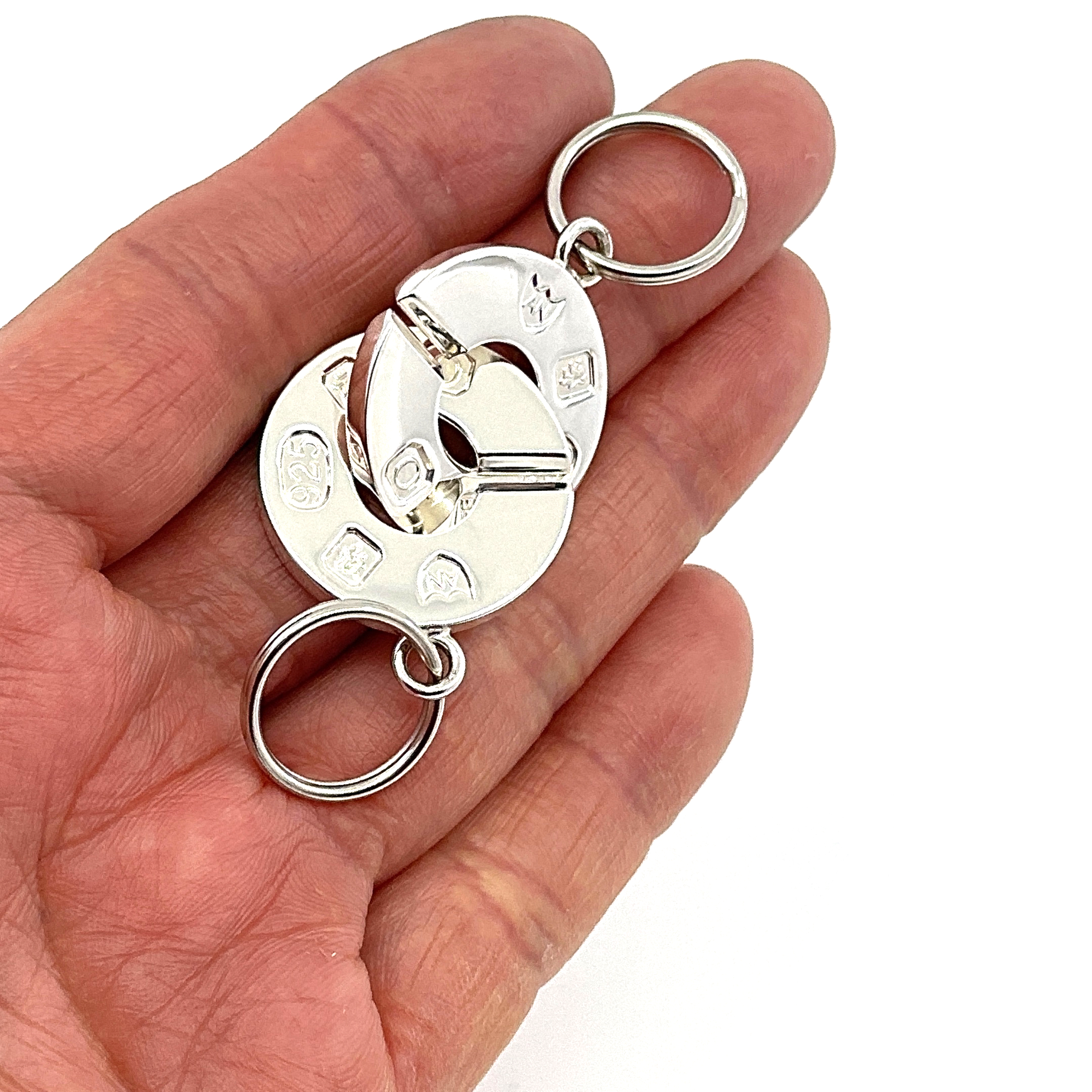 Handcrafted in 925 sterling silver, this keyring reflects traditional silversmithing with careful attention to weight, surface finish, and mechanical precision. The silver is smoothly polished to enhance its natural lustre, while the integrated mechanism is engineered for durability and ease of use. English hallmarking confirms both the silver standard and authenticity.