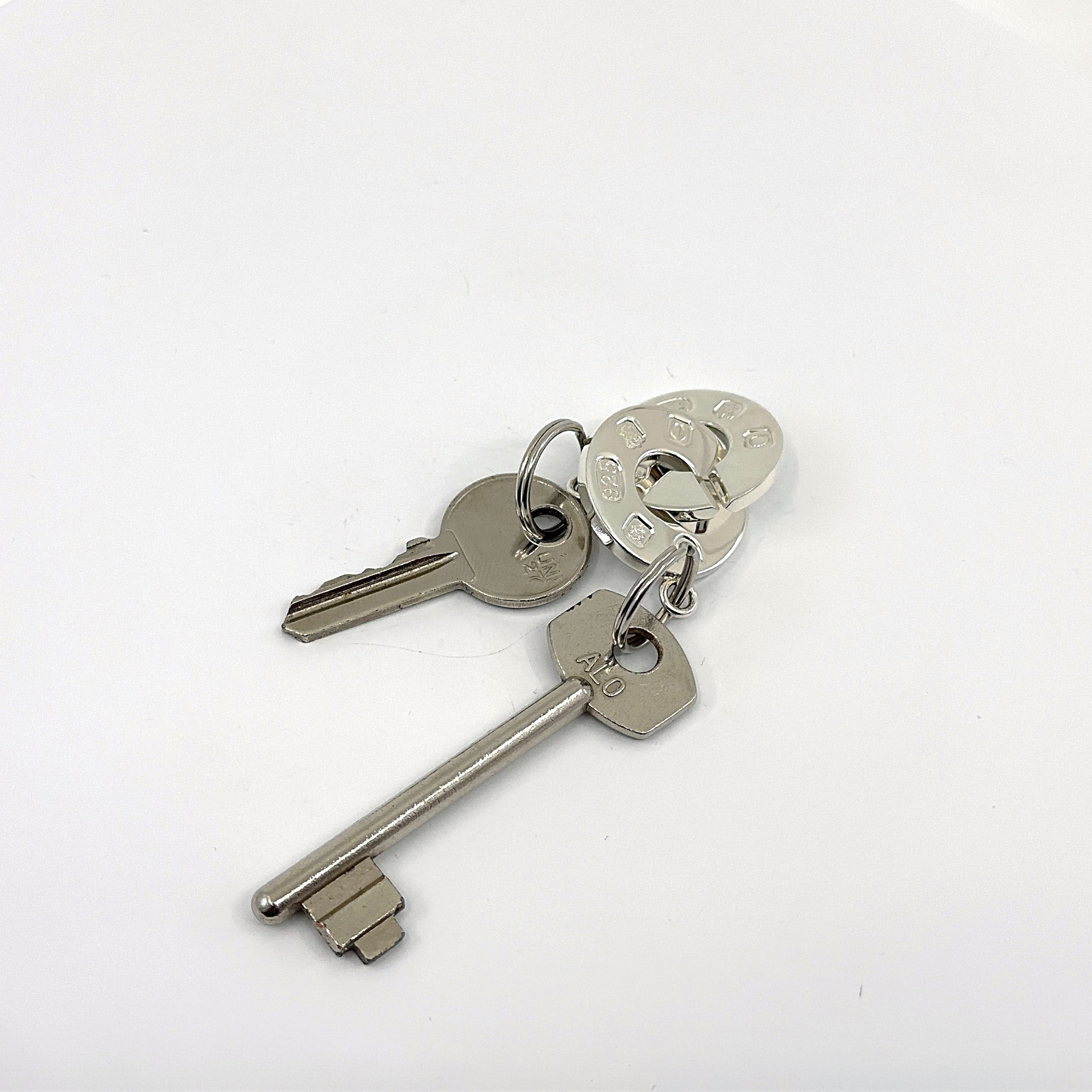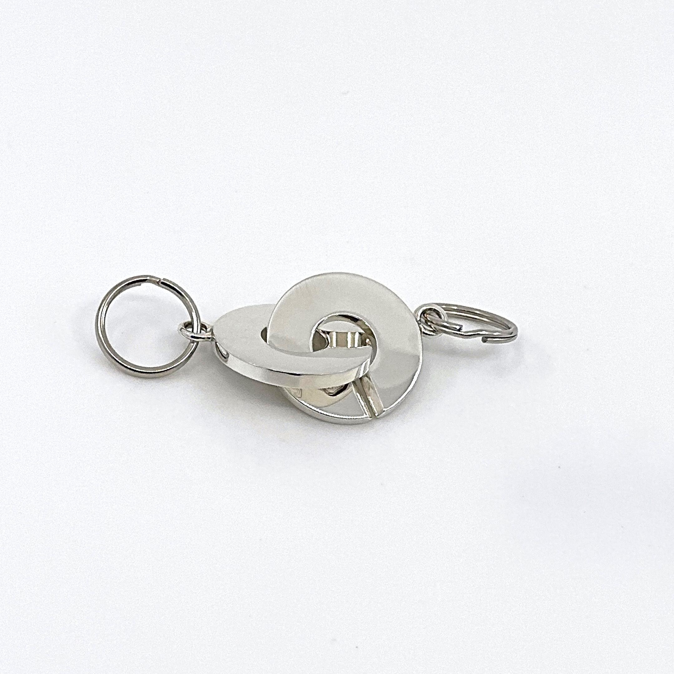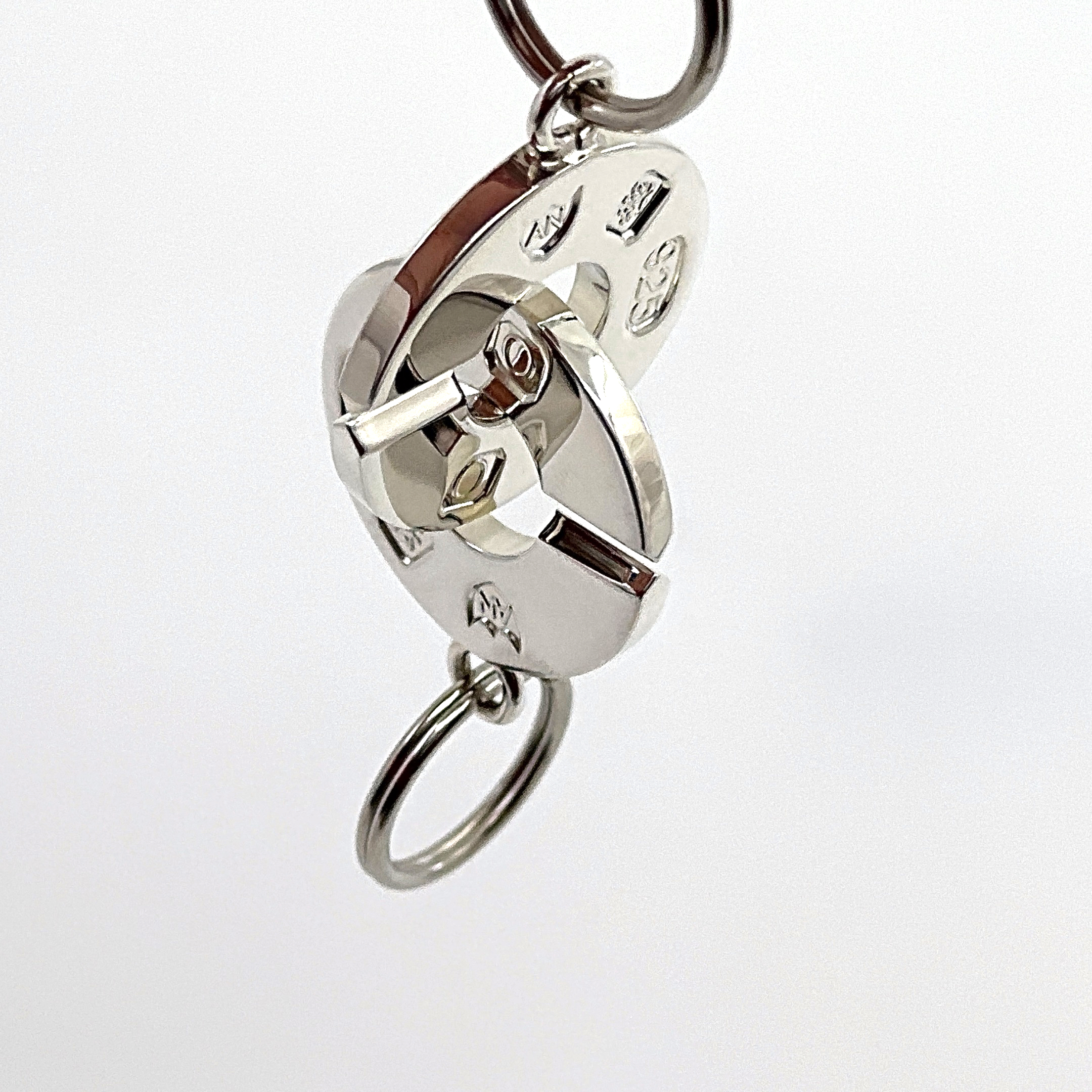 This understated double keyring is designed around a discreet interlocking mechanism that allows two separate keyrings to function as one. Once familiar, the concealed release enables the rings to separate with ease, offering a considered solution for organising keys. The circular form and balanced proportions give the piece a calm, utilitarian elegance rooted in traditional silver objects. Intended for daily use, it combines practicality with quiet refinement.