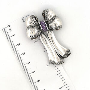 Bow Pin Brooch With Amethyst And Marcasite Finished In 925 English Hallmarked Sterling Silver